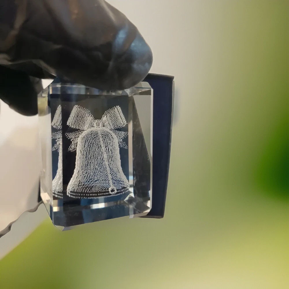 This crystal 3-D laser-etched glass cube is the perfect addition to your holiday décor collection. The cube features a beautiful holiday bell design that will catch the eye of anyone who sees it. Made of high-quality glass, this cube is not only beautiful but also durable and long-lasting. The clear color of the glass and the intricate details of the etching make this cube a unique and stunning piece. It is perfect for displaying on a mantel, shelf, or table during the holiday season. Whether you're looking to add to your own collection or give a special gift, this crystal glass cube is sure to impress. Box may have slight damage