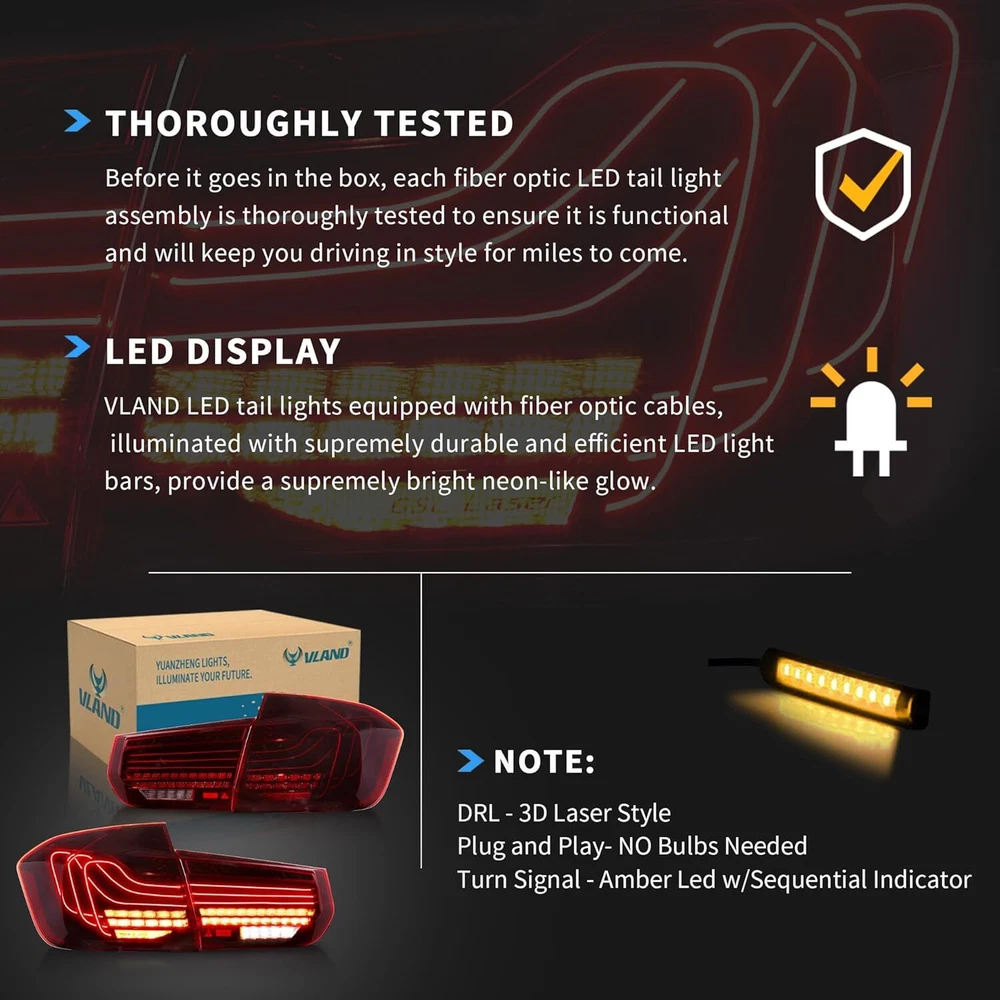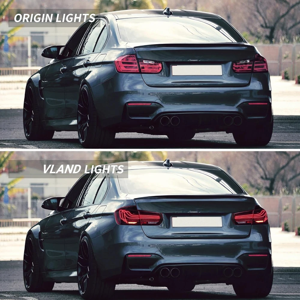 CSL LED Red Tail lights Assembly Fit for 2012-19 BMW 3 Series 6th Gen F30 M3 F80 Fitment: BMW 3 Series 2012-2018 F30 330D / 335D XDrive BMW 3 Series 2012-2018 F30 F35 F80 318d / 318d x-drive / 320d x-drive 320i x-drive / 325d / 330d / 330d x-drive / 330i x-drive / 335i / 335i drive / 340i / 340i drive / Concours M3 BMW 3 Series 2012-18 F30 F80 316d / 316i / 318d / 320d / 320d x-drive / 320i / 335i / 335i x-drive / ActiveHybrid Not Fit For : BMW 3 Series Touring F30 BMW 3 Series Touring F31 BMW 3 Series Gran Turismo F34 BMW 3 Series Touring F31 BMW 3 Series Coupe E92 Item Features: Lens Color: Red Running Light: LED (Red) Brake Light: LED (Red) Reverse Light: LED (Diamond White) Turn Signals: LED (Amber. With Sequential Indicators) Start-up Animation:With Start-up Animation Certification: E-Mark Description: 1 pair of taillights with left side & right side. This item has the same connections and wires with the original tail lights. It is easy to installing (Professional installation recommended). Warranty: One Year You May Also Like: 👇 SPECIFIC SHIPPING ABOUT PAYMENT RETURN SPECIFIC SHIPPING ABOUT PAYMENT RETURN VLAND Headlights VLAND Tail Lights VLAND Combination Set VLAND Bulbs For Chevrolet For Dodge For Ford For Honda For Mitsubishi For Hyundai For Lexus For Toyota For BMW For GMC For Volkswagen For Tesla For Subaru Other On Dec 31, 2024 at 10:47:32 PST, seller added the following information: