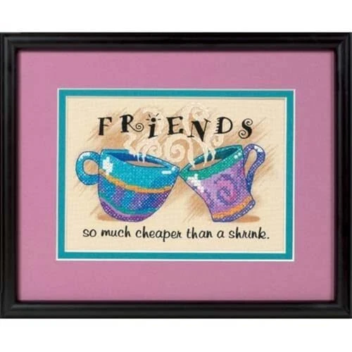Remember the value of a good friends every time you look at this ''Cheaper than a Shrink'' Stamped Cross Stitch Kit. The cross stitch pattern features coffee cups and the words ''Friends: so much cheaper than a shrink.'' With easy-to-instructions, this kit is perfect for crafters of all skill levels. Once complete, frame and gift this to close friends and family. Stamped cross stitch kit includes printed ivory sailcloth, needle, thread, and simple directions. The finished project measures 7'' W x 5'' H. Includes printed ivory sailcloth, needle, thread, and simple instructions Finished stamped cross stitch kit measures 7'' W x 5'' H Stamped cross stitch pattern features coffee cups with the phrase ''Friends: so much cheaper than a shrink.'' Adorable stamped cross stitch kit is great for all skill levels! Stamped cross stitch kit makes a great gift for friends and family!