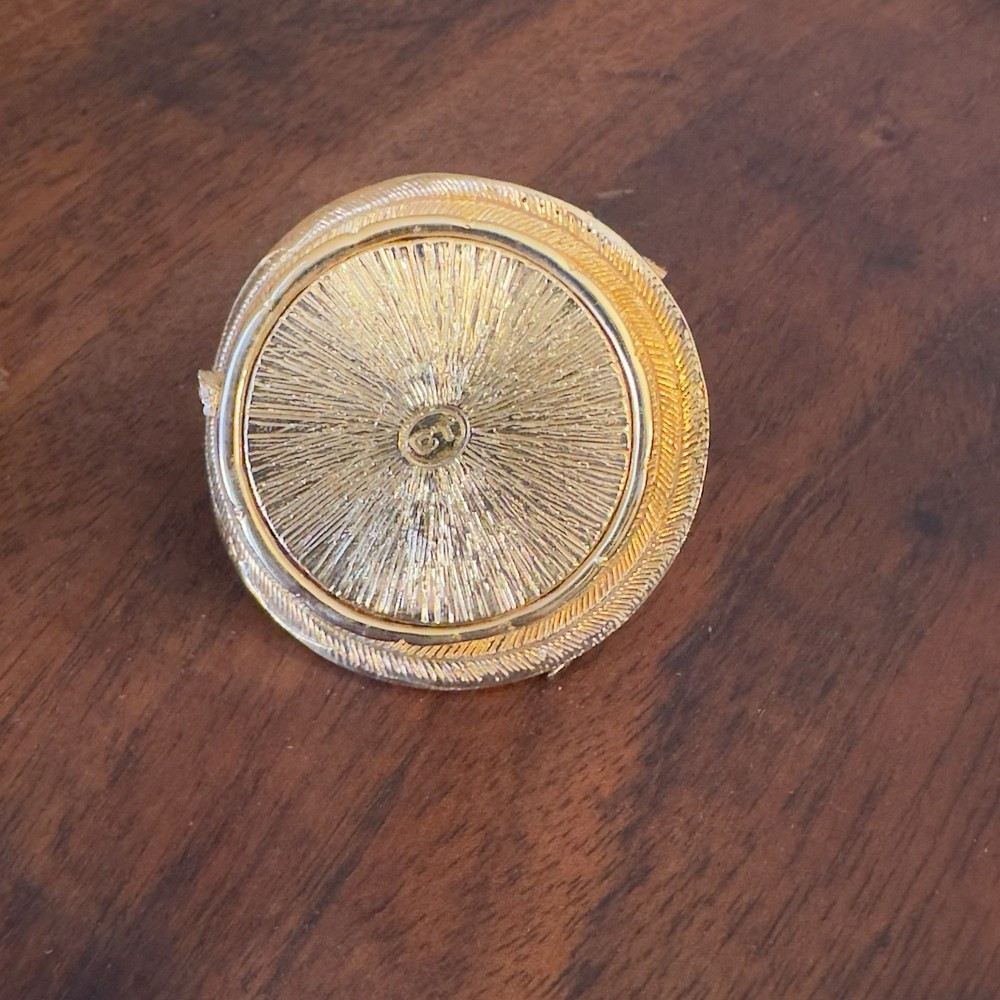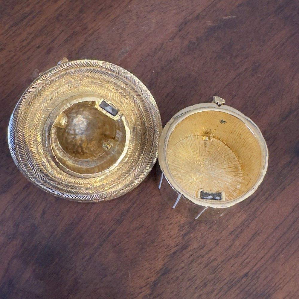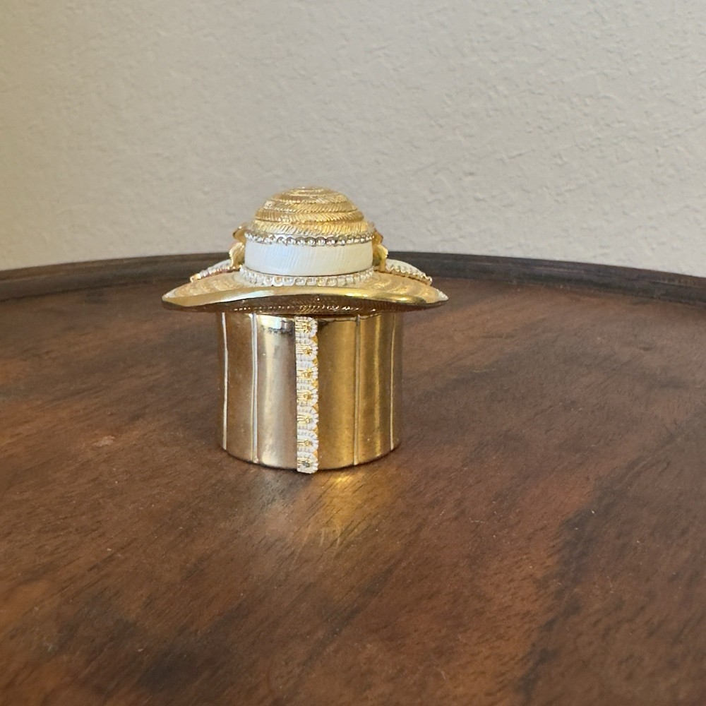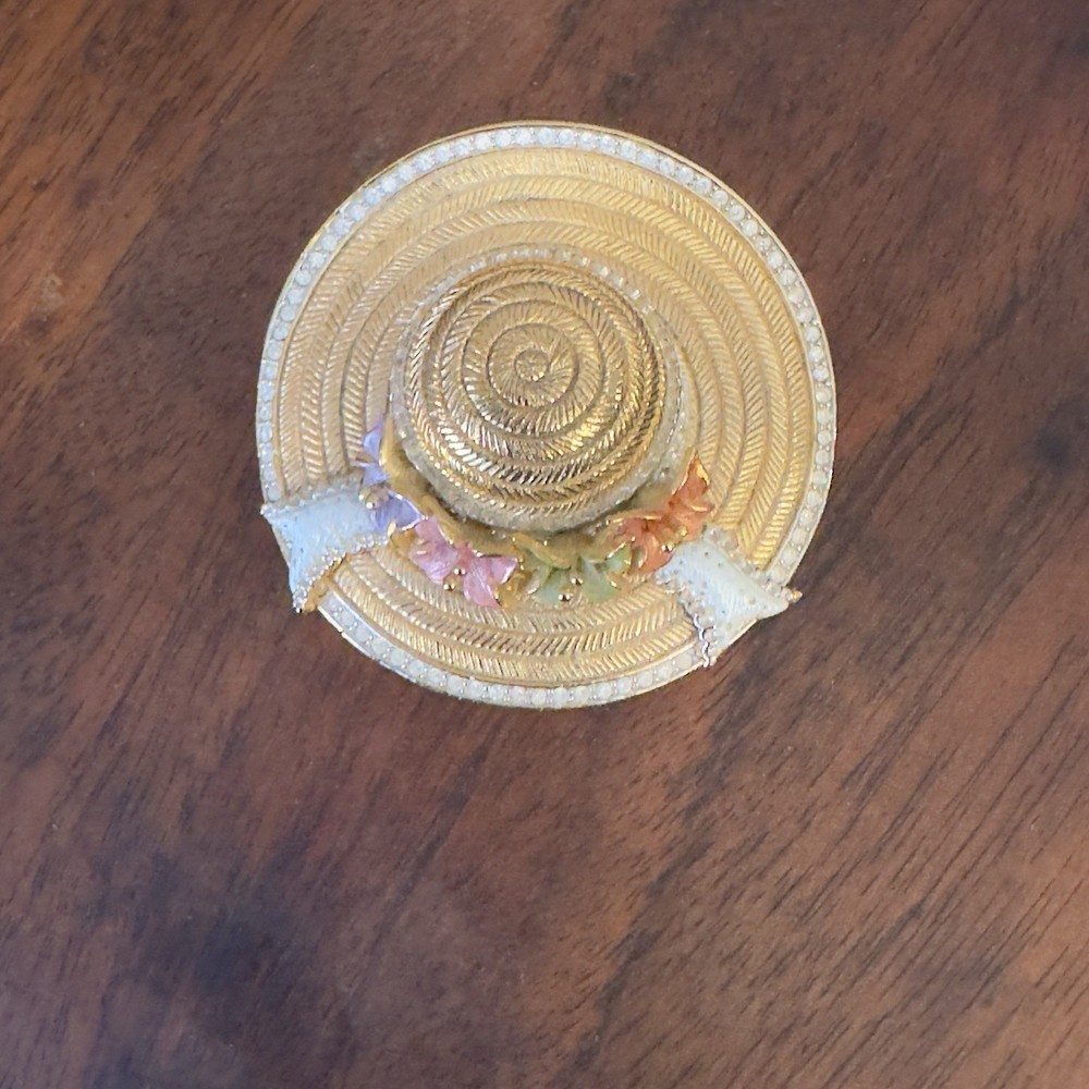 Shape: hat Features: Magnetic, flowers Material: Metal Brand: CT Type: Trinket Box Finish: Metallic Size: Small Subject: hat Color: Gold