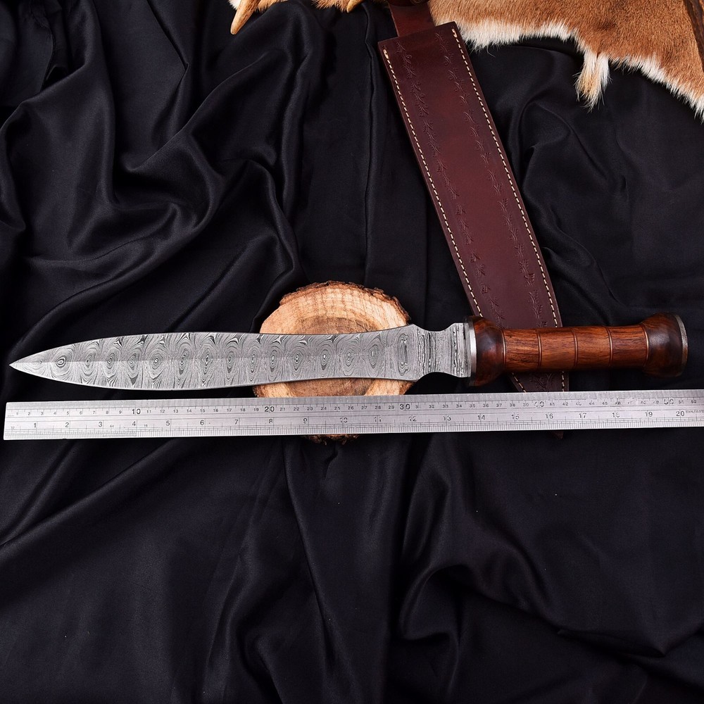 Blade Material: Damascus Steel Tang: Full Brand: M DAMASCUS Handmade: Yes Features: Sheath Included Dexterity: Ambidextrous Blade Length: 13.5" INCHES Type: Survival, Throwing, SWORD, Gladius Sword, Gladiator Blade Edge: Plain Blade Color: Gray Original/Reproduction: Original Country of Origin: Pakistan Handle Material: ROSE WOOD & DAMASCUS STEEL BOLSTER Blade Type: Drop Point