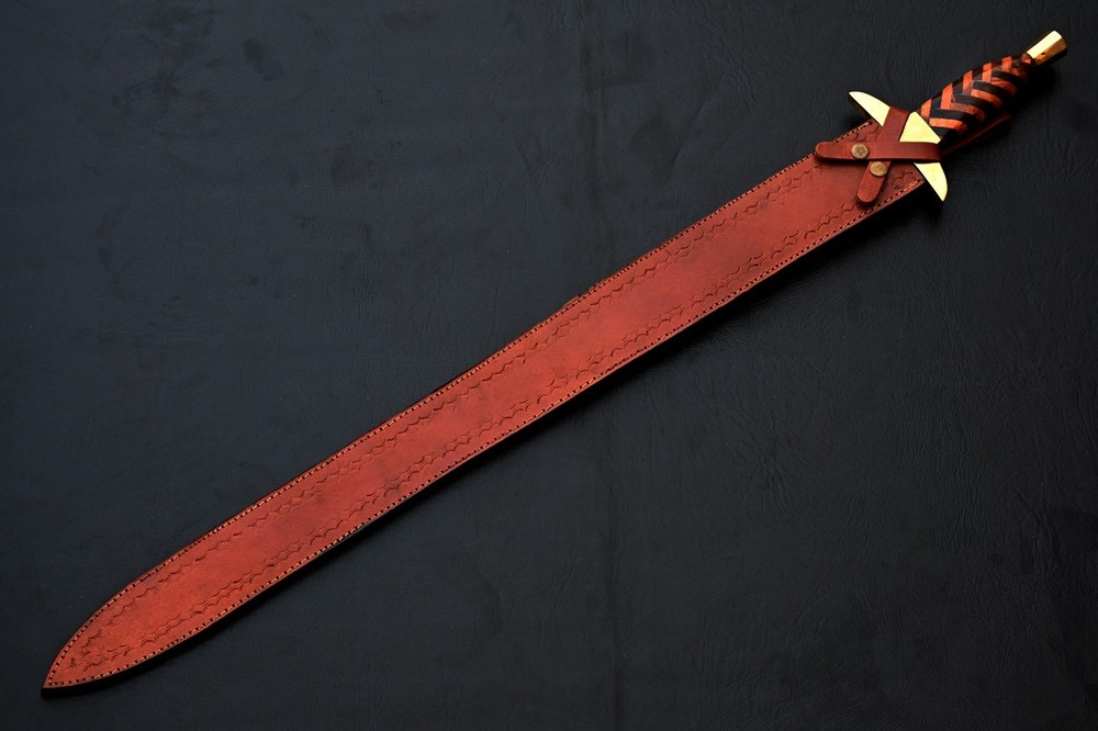 CUSTOM HAND MADE HAND FORGED DAMASCUS STEEL SWORD Wood & Brass Guard Handle This superb design Sword is hand forged. Blade of this Sword has a nice file work and is made of 512 layers of 4340 stainless steel and 1075 high carbon steel and hardness 55-58 HRC . This robust Sword is lab tested under intense conditions, the balance and shape of this Sword ensures perfect grip. Overall Length: 38” Inches Blade Length: 31” Inches Handle Length: 7” Inches Damascus Design: Twist Pattern Layers: 512 Package Includes: with Leather Sheath Bag Warning: Keep fingers clear of blades. Store away from children.