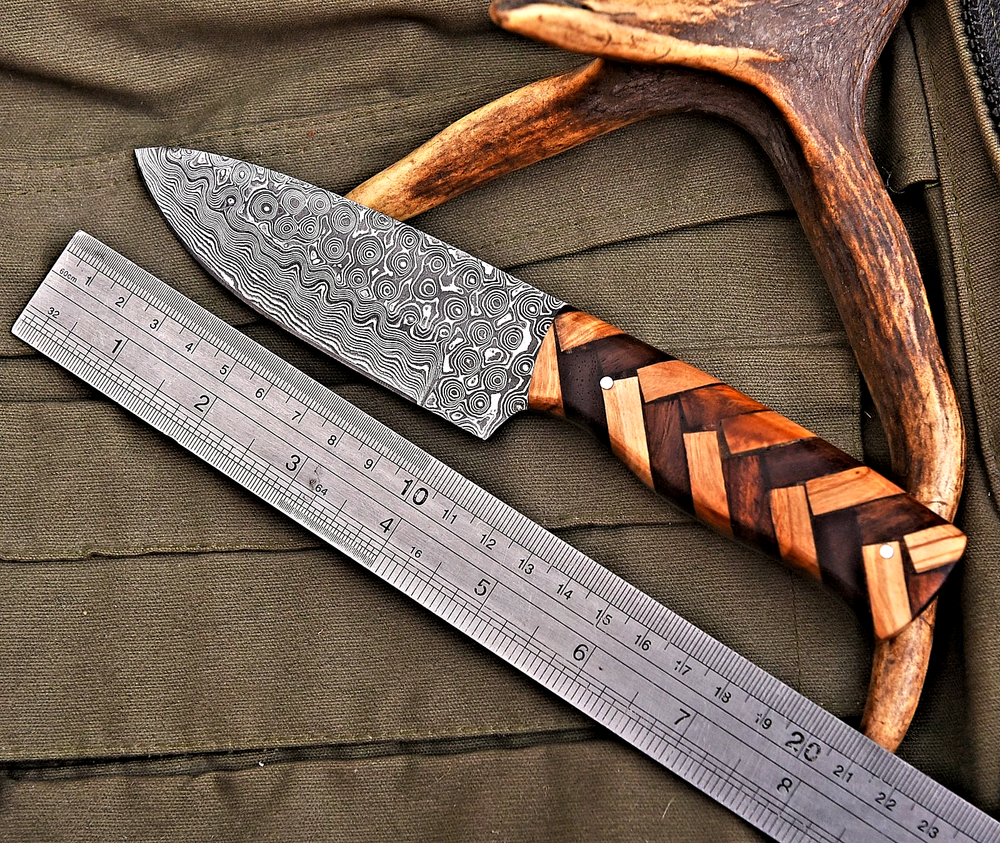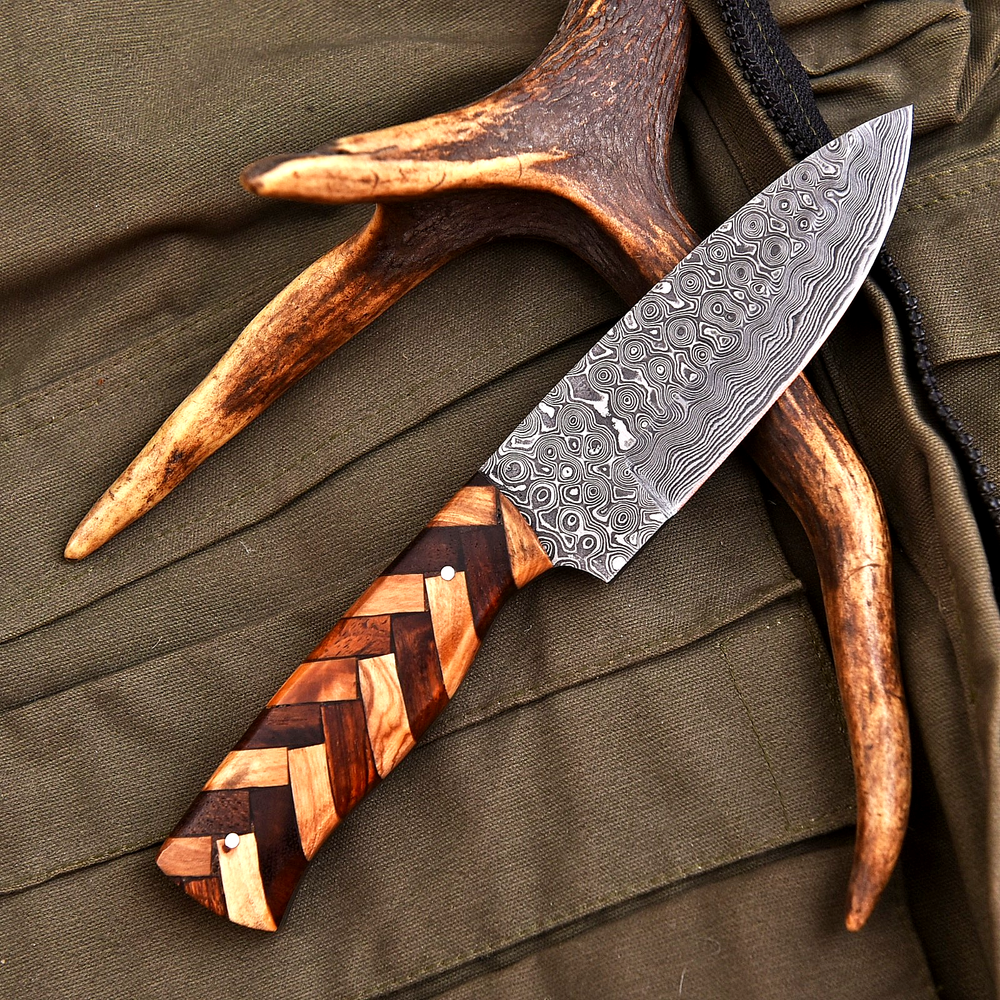 Tang: Hidden Features: Sheath Included Blade Material: Damascus Steel Blade Edge: VERY SHARP Brand: M DAMASCUS Handmade: Yes Blade Color: Gray Type: Bowie Knife, Hunting, Survival, Throwing, SKINNER KNIFE Blade Length: 4.25" INCH Blade Type: Drop Point Original/Reproduction: Original Handle Material: WOOD HANDLE Vintage: No Country of Origin: United States Dexterity: Ambidextrous