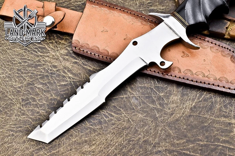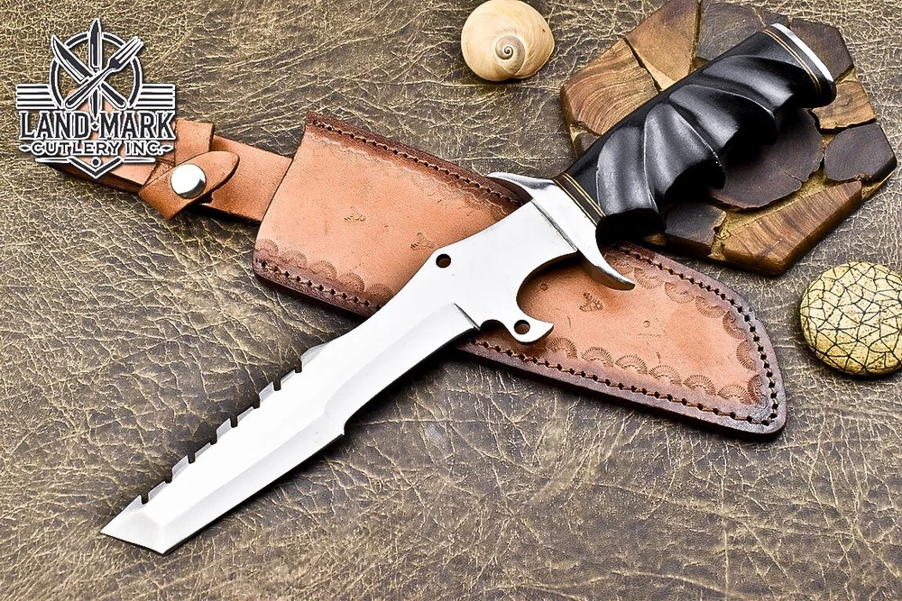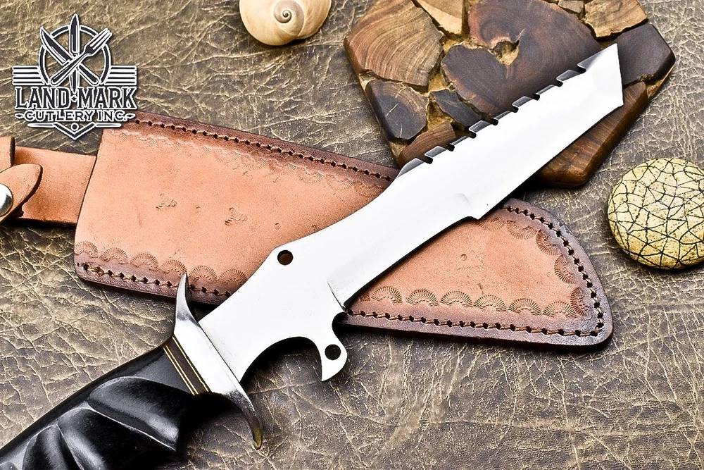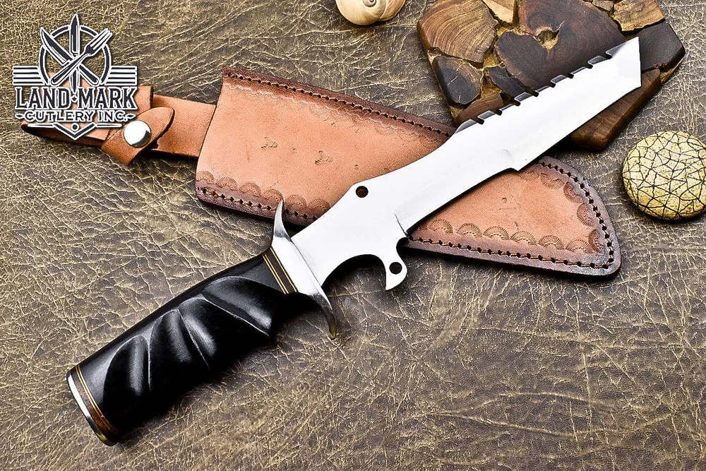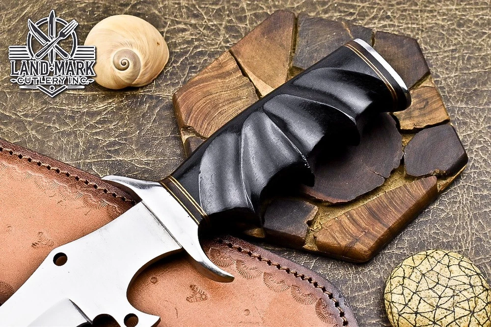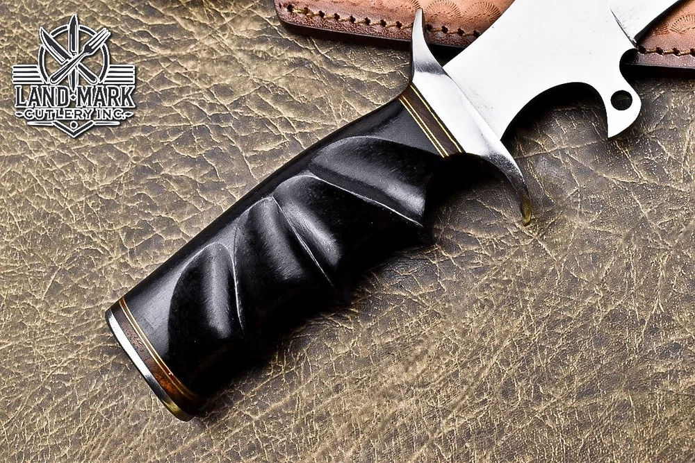 Custom Hand Made D2 STEEL HUNTING BOWIE KNIFE WITH BEAUTIFUL BLACK HANDLE We offer a shipping discount for More then one purchased . And discount will be apply on combine invoice, Discount will not apply on separate payment. ITEM DETAILS OVER ALL LENGTH 14.0 inches long (Approx) HANDLE LENGTH 5.0 inches long (Approx) BLADE LENGTH 9.0 inches long (Approx) BLADE HARDNESS 58-60 HRC Which Holds The Sharp Edge For Long Time. HANDLE BLACK COVER LEATHER SHEATH This Awesome custom made KNIFE has a nice hand forged with the combination of 4340 & 1080 steel. HOW OUR DAMASCUS IS MADE: All our Damascus is real and not just an acid etch. Damascus is a mixture of 1080HC and 4340 nickel carbon. You heat them up together and then fold the bar over and over to get the desired layers, ours are 396 layers. Then you burn the blade in acid, and it turns the nickel satin color and the high carbon turns blackish gray. This is how the layers are exposed to show the layers of the new steel created coined "Damascus". All Damascus is acid etched to show the layers. If you high polish the metal it will be shinny satin like all steels. Only after you burn the sides of the blade with acid do you see the layers of the two steels. Makes sense? After we make our knives we high polish the handles and put an edge on the blade. The high polishing buffs off the acid burned layer of the handle, and the blade edge is sharpened and the acid burned edge becomes satin. You can re-burn the tang of the blade near the handles and the edge of the blade and it will show the layers once more. All our knives are hand made, durable and unique ***** YOU WILL RECEIVED THE SAME KNIFE Qality Standards Our Damascus blades are made from high quality non-stainless steels which rival or exceed any Damascus blade made from the 10 series with 4340. Our Damascus combination has taken years to perfect and has been tested under a variety of application which will offer professional performance in categories of toughness, strength (lateral stress) and edge honing and holding ability. In a 5 spot Rockwell test our blades will average near or close to 58 which offers a perfect balances between its toughness and strength.Our blades due to carbon content need to be regularly treated with wax and/or 3 in 1 oil to maintain its superior quality. Questions if you have any question feel free to send us message we aim to answer all questions within 24 hours Feedback If you are not satisfied with our service please contact us before leaving any negative or natural feedback. We will resolve all issues as quickly as possible. Disclaimer We are not responsible for any injuries associated with the use of our tools. Our products are intended for legal use only by responsible buyers. Therefore, we will not sell our products to anyone under the age of 18. Before bidding please check your country laws as some countries Custom don't allow this. If your purchase is held by Custom Authorities in your country/State we will not be responsible for that and no refund will be issued Shipping We offer a 20% shipping discount for More then one purchased . And discount will be apply on combine invoice, Discount will not apply on separate payment We ship within 24 hours after receiving complete payment but this can be delayed due to week ends or Governments and Religious Festivals . . This is beyond our control and we apologize for this inconvenience. Precautions Our Tools are very sharp so open and use them very carefully We are not responsible for any injuries associated with the use of our tools Tips to Care knife 1. NEVER STORE YOUR KNIFE FOR LONG TIME IN LEATHER SHEATH. 2. LEATHER CAN ABSORB WATER, WHICH WILL RUST THE KNIFE. 3. ALWAYS CLEAN THE BLADE AFTER USING WITH OIL OR WAX