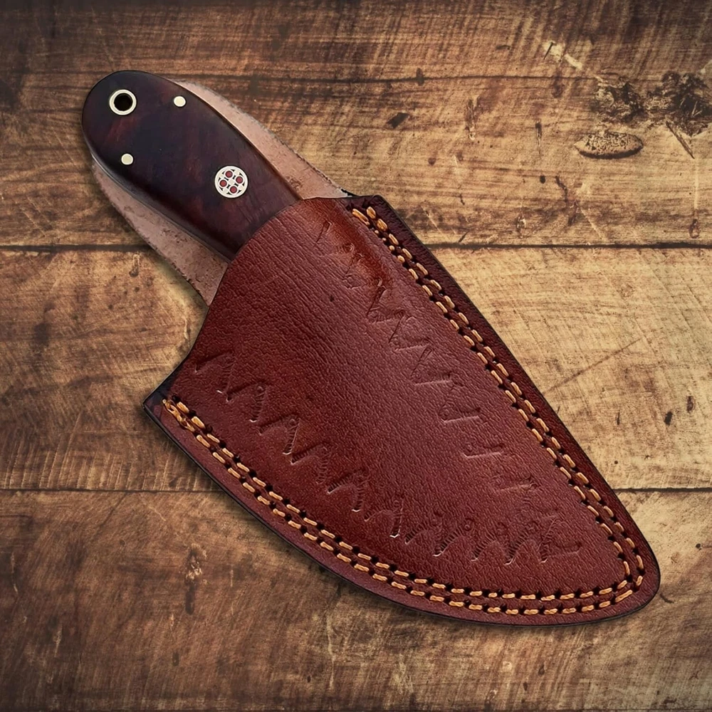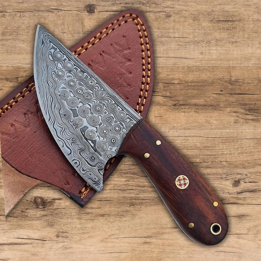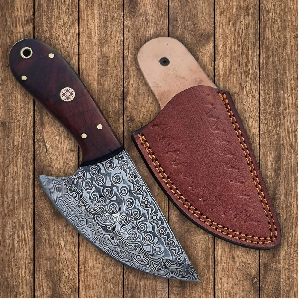 Handmade Damascus Skinner Knife, 6-Inch Fixed Blade with Leather Sheath – Hunting, Skinning, and EDC Knife Wood Handle Premium Damascus Steel Blade: Expertly crafted from high-quality Damascus steel, this 6.5-inch skinning knife offers exceptional sharpness, edge retention, and a unique rain drop pattern for enhanced durability. Overall Length of this damascus Hunting knife is 06.50 inches Blade Length is 03.50 inches Handle Length is 03.00 inches Blade Thickness is 4 mm. Full Tang Construction: Features a full tang design that ensures maximum strength, balance, and control, providing a reliable and durable blade for various outdoor tasks. High Edge Retention Blade, Hardness is 56±1 HRC. Real Damascus Steel Forged By Hammer Machine From 15n20 and 1095 Steels , 10 degree Angle sharpening. Perfect for Skinning & Hunting: The 3.5-inch blade is designed specifically for skinning and field dressing, making it the ideal tool for hunters, outdoor enthusiasts, and survivalists. Ergonomic Handle for Comfort: The comfortable, non-slip rosewood handle ensures a secure grip for precision cuts, reducing hand fatigue during long outdoor sessions Premium Leather Sheath: Comes with a high-quality leather sheath for safe storage and easy access, ensuring your knife is always ready when you need it.