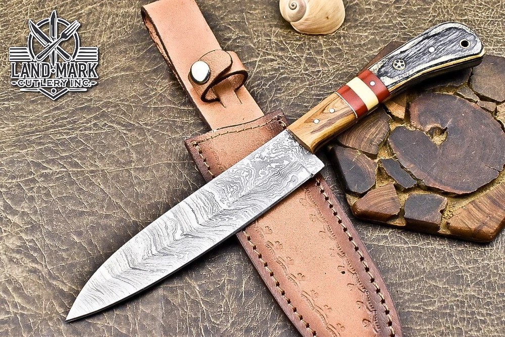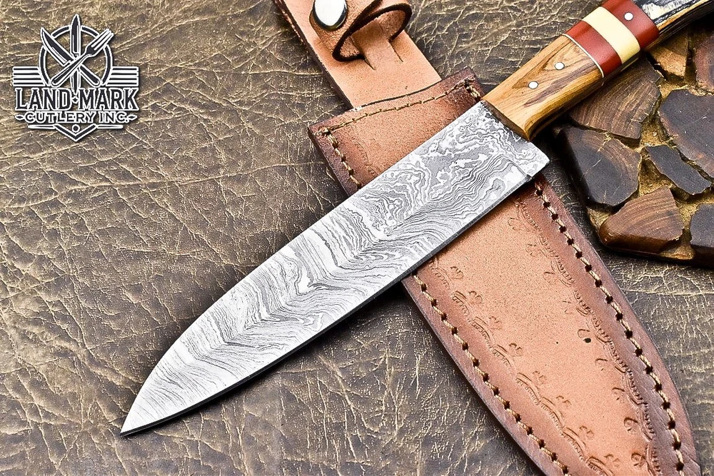 Custom Hand Made DAMASCUS STEEL KITCHEN CHEF KNIFE WITH PAKKA WOOD HANDLE We offer a shipping discount for More then one purchased . And discount will be apply on combine invoice, Discount will not apply on separate payment. ITEM DETAILS OVER ALL LENGTH 14.0 inches long (Approx) HANDLE LENGTH 5.0 inches long (Approx) BLADE LENGTH 9.0 inches long (Approx) BLADE HARDNESS 58-60 HRC Which Holds The Sharp Edge For Long Time. HANDLE PAKKA WOOD COVER LEATHER SHEATH This Awesome custom made KNIFE has a nice hand forged with the combination of 4340 & 1080 steel. HOW OUR DAMASCUS IS MADE: All our Damascus is real and not just an acid etch. Damascus is a mixture of 1080HC and 4340 nickel carbon. You heat them up together and then fold the bar over and over to get the desired layers, ours are 396 layers. Then you burn the blade in acid, and it turns the nickel satin color and the high carbon turns blackish gray. This is how the layers are exposed to show the layers of the new steel created coined "Damascus". All Damascus is acid etched to show the layers. If you high polish the metal it will be shinny satin like all steels. Only after you burn the sides of the blade with acid do you see the layers of the two steels. Makes sense? After we make our knives we high polish the handles and put an edge on the blade. The high polishing buffs off the acid burned layer of the handle, and the blade edge is sharpened and the acid burned edge becomes satin. You can re-burn the tang of the blade near the handles and the edge of the blade and it will show the layers once more. All our knives are hand made, durable and unique ***** YOU WILL RECEIVED THE SAME KNIFE Qality Standards Our Damascus blades are made from high quality non-stainless steels which rival or exceed any Damascus blade made from the 10 series with 4340. Our Damascus combination has taken years to perfect and has been tested under a variety of application which will offer professional performance in categories of toughness, strength (lateral stress) and edge honing and holding ability. In a 5 spot Rockwell test our blades will average near or close to 58 which offers a perfect balances between its toughness and strength.Our blades due to carbon content need to be regularly treated with wax and/or 3 in 1 oil to maintain its superior quality. Questions if you have any question feel free to send us message we aim to answer all questions within 24 hours Feedback If you are not satisfied with our service please contact us before leaving any negative or natural feedback. We will resolve all issues as quickly as possible. Disclaimer We are not responsible for any injuries associated with the use of our tools. Our products are intended for legal use only by responsible buyers. Therefore, we will not sell our products to anyone under the age of 18. Before bidding please check your country laws as some countries Custom don't allow this. If your purchase is held by Custom Authorities in your country/State we will not be responsible for that and no refund will be issued Shipping We offer a 20% shipping discount for More then one purchased . And discount will be apply on combine invoice, Discount will not apply on separate payment We ship within 24 hours after receiving complete payment but this can be delayed due to week ends or Governments and Religious Festivals . . This is beyond our control and we apologize for this inconvenience. Precautions Our Tools are very sharp so open and use them very carefully We are not responsible for any injuries associated with the use of our tools Tips to Care knife 1. NEVER STORE YOUR KNIFE FOR LONG TIME IN LEATHER SHEATH. 2. LEATHER CAN ABSORB WATER, WHICH WILL RUST THE KNIFE. 3. ALWAYS CLEAN THE BLADE AFTER USING WITH OIL OR WAX