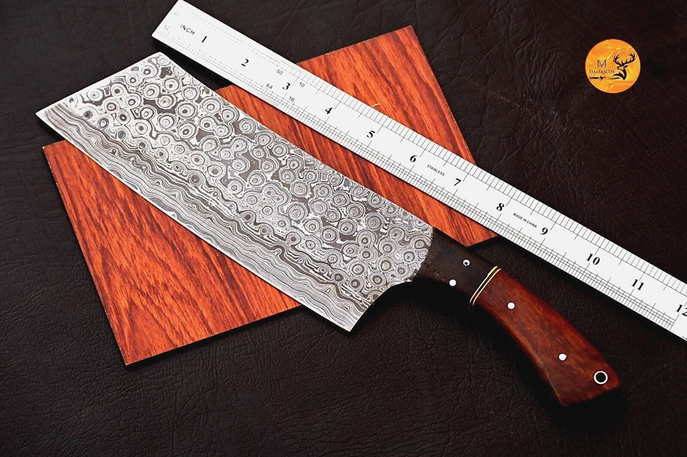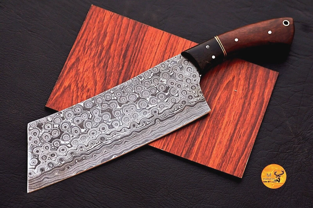 FULL TANG CUSTOM HANDMADE FORGED DAMASCUS STEEL BUTCHER KNIFE CLEAVER MEAT CHOPPER Wood Handle This superb design knife is hand forged. Blade of this knife has a nice file work and is made of 512 layers of 4340 stainless steel and 1075 high carbon steel and hardness 55-58 HRC . This robust knife is lab tested under intense conditions, the balance and shape of this knife ensures perfect grip. Overall Length: 12" Inches Blade Length: 7.5" Inches Handle Length: 4.5" Inches Damascus Design: Rain Drop Pattern Layers: 512 Hand Forged Hardness: 55-58 HRC Care Instructions: Keep the knife dry after each cleaning. Warning: Take care when removing product from packaging. Keep fingers clear of blades. Store away from children.