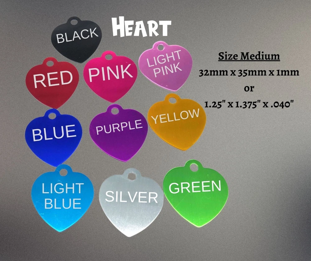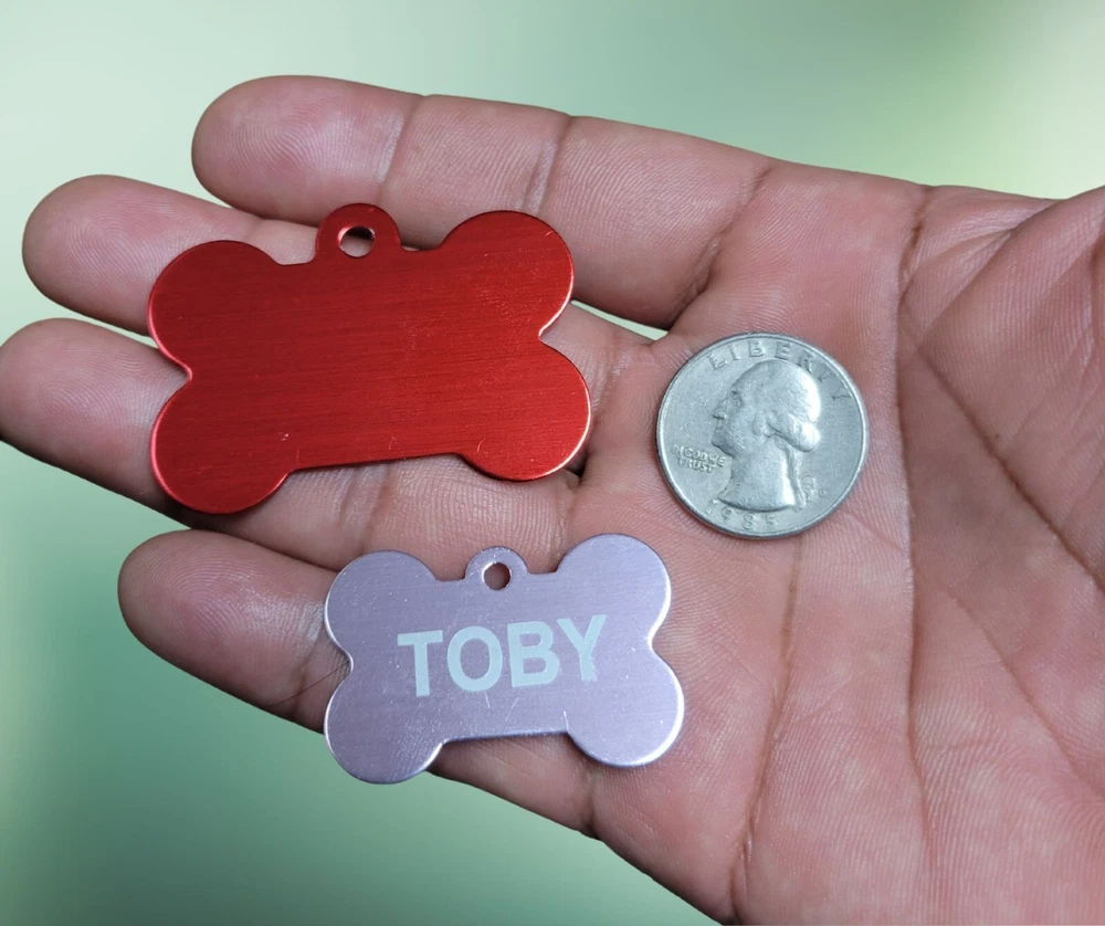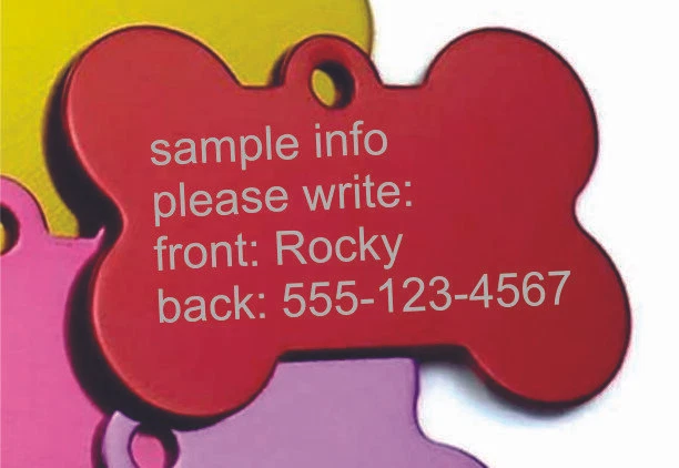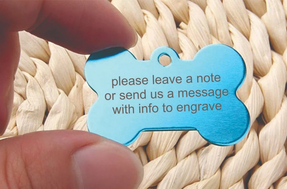 CUSTOM ENGRAVED PERSONALIZED PET TAG ID DOG CAT NAME TAGS DOUBLE SIDE. Condition is "New". Shipped with USPS First Class. Small Tag Size: 1 inch x 1.5 inches x .039 inches thick or 25.4 mm x 38.1 mm x 1 mm thick (see picture) Ring Size: 1/2" diameter Large Tag Size: 1.5 inch x 2.0 inches x .039 inches thick or 38.1 mm x 50.8 mm x 1 mm thick (see picture) Ring Size: 1/2" diameter BONE SHAPE TAG WITH RING INCLUDED Letters will be laser engraved, they won't fade out. 10 COLORS TO CHOOSE For engrave information please make sure to type it after you buy it. if the box to enter the info is not showing, please send message. Please use the "Message to Seller" to let us know as follows" -front side - (letters or numbers you want us to engrave) -back side - (letters or numbers you want us to engrave) (the FEWER letters you use the BIGGER AND CLEAR the engrave will be) If order its placed during business hours before noon, please gave us a couple of hours to do the engrave and we will take it to mail box same day , if the order its placed at night, at afternoon or over the weekend we will take it to the post office on the next business hours. Regular addresses allow 3 to 5 days for delivery. Non regular may take up to 15 days It will be shipped in a letter size envelope Via USPS First Class Mail. Tracking Number will be provided only when buying 6 or more tags. Local pick up? Ok.