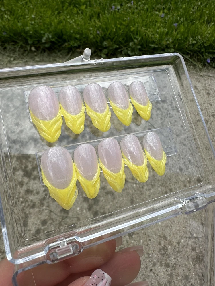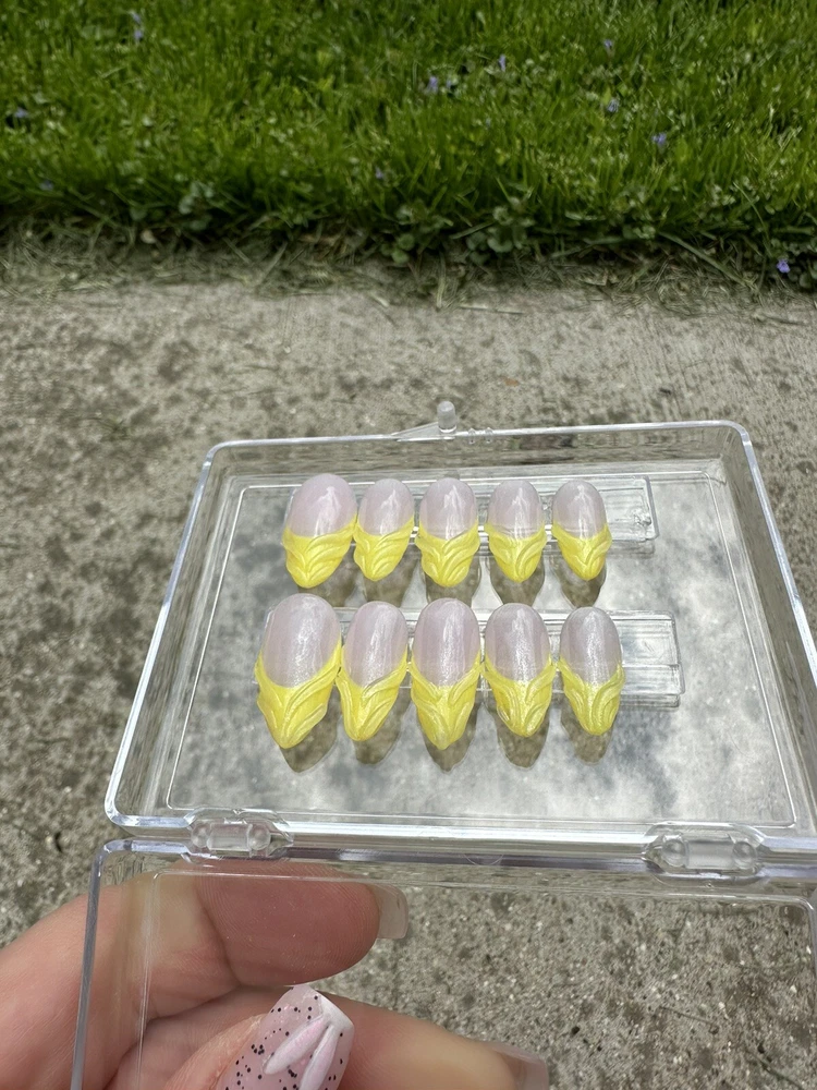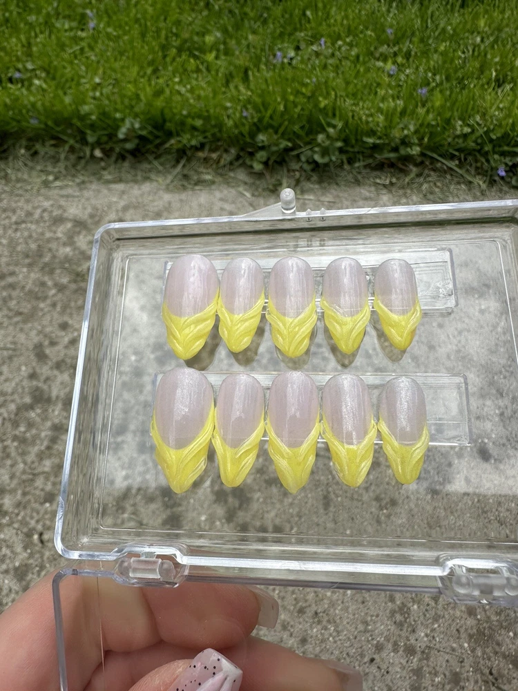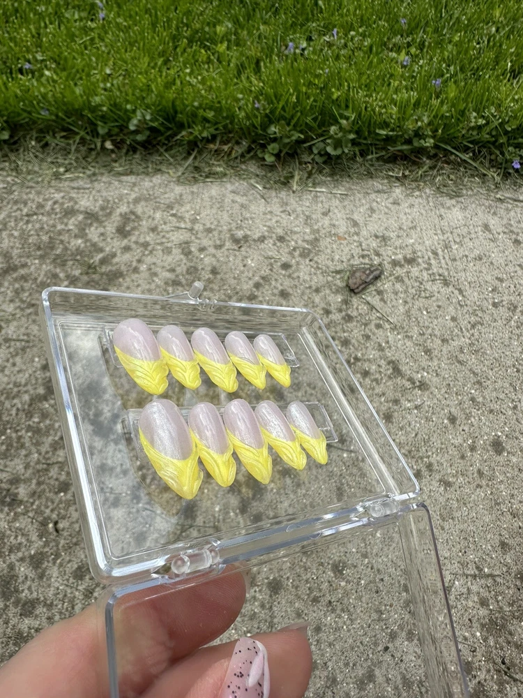 This set is a size medium and is ready to ship. Sets are made with a thin layer of builder gel to enhance durability. Each set is hand painted. With proper care sets may be reusable. Each set is made with Kokoist Gel Products and includes a prep kit and clear display box. Sets are made by hand and custom sizing is available on request.