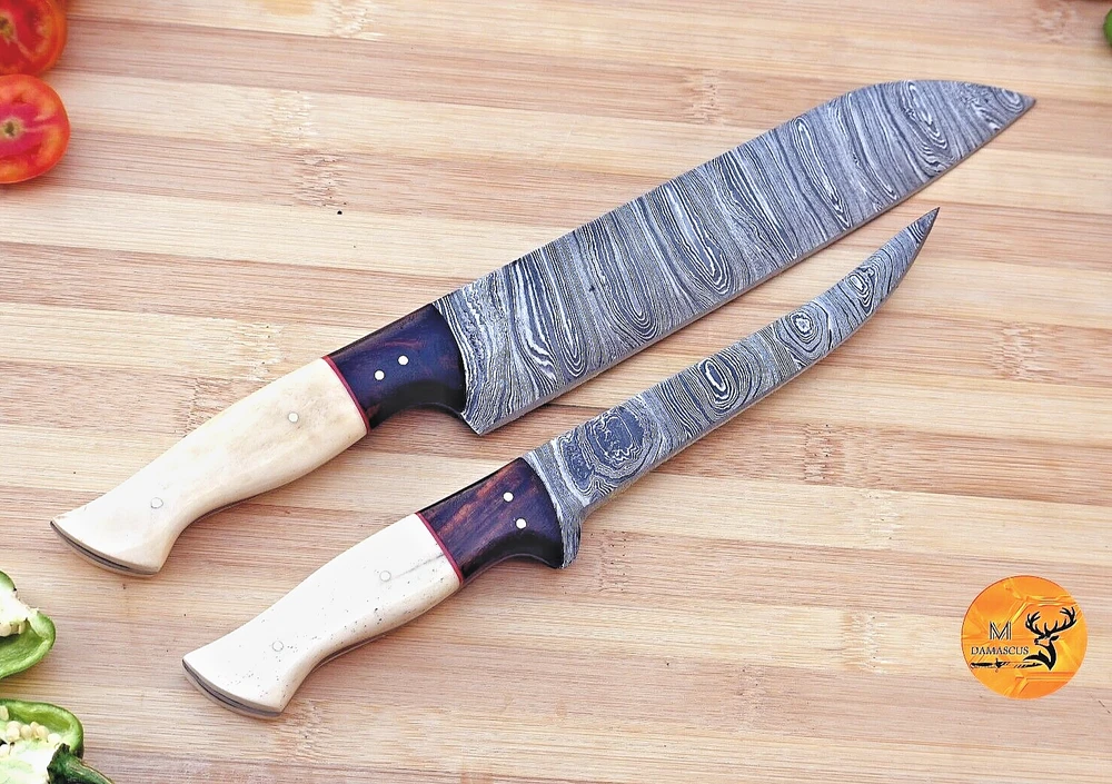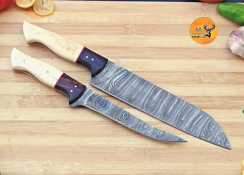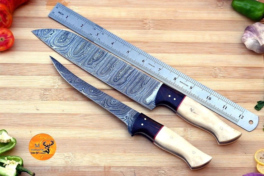 CUSTOM HAND MADE FORGED DAMASCUS STEEL BLADE CHEF KNIFE KITCHEN KNIVES SET Camel Bone & Wood Handle This superb design knife is hand forged. Blade of this knife has a nice file work and is made of 512 layers of 4340 stainless steel and 1075 high carbon steel and hardness 55-58 HRC . This robust knife is lab tested under intense conditions, the balance and shape of this knife ensures perfect grip. Bread Knife : Blade Length: 7.5" Inches - Handle Length: 5" Inches Fillet Knife : Blade Length: 6.5" Inches - Handle Length: 4.5" Inches Damascus Design: Twist Pattern Layers: 512 Care Instructions: Keep the knife dry after each cleaning. Warning: Keep fingers clear of blades. Store away from children.