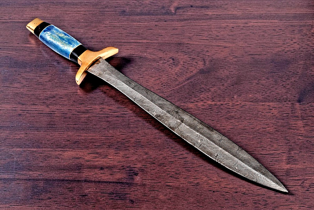 CUSTOM MADE HAND FORGED DAMASCUS STEEL DOUBLE EDGE SWORD This superb design Sword is hand forged. Blade of this Sword has a nice file work and is made of 512 layers of 4340 stainless steel and 1075 high carbon steel and hardness 55-58 HRC . This robust Sword is lab tested under intense conditions, the balance and shape of this Sword ensures perfect grip. Overall Length: 22” Inches Blade Length: 16” Inches Handle Length: 6” Inches Damascus Design: Twist Pattern Layers: 512 Package Includes: with Sheath Warning: Keep fingers clear of blades. Store away from children.