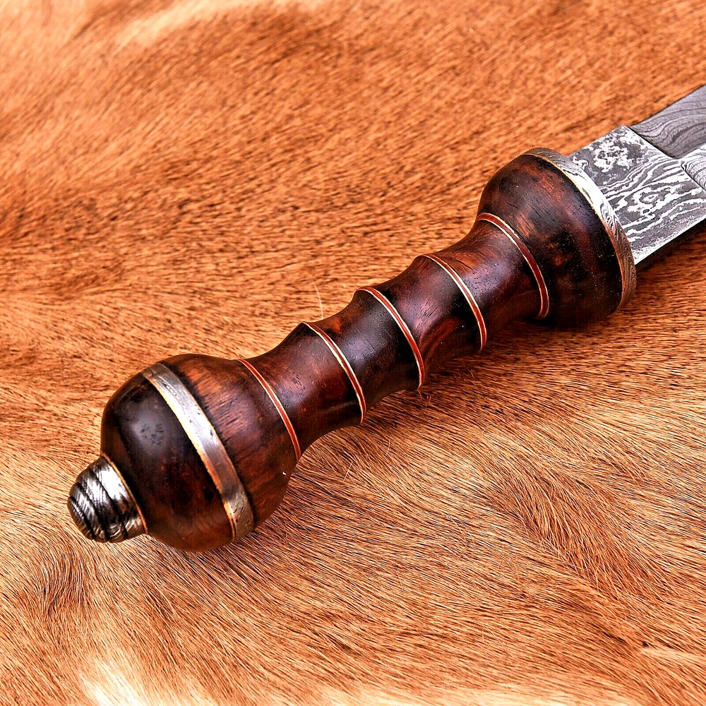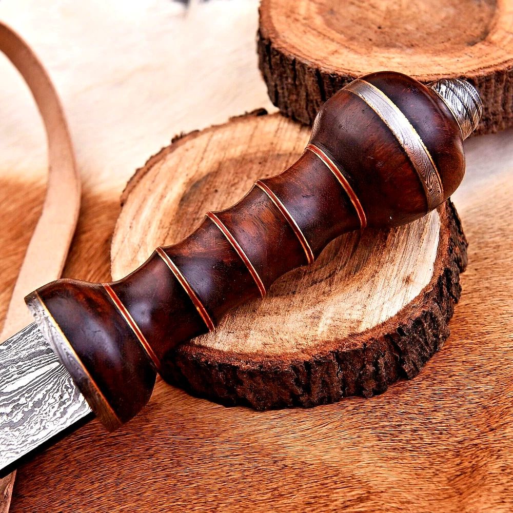 CUSTOM HANDMADE FORGED DAMASCUS STEEL SWORD Cocobolo Wood & Camel Bone With Damascus Steel Bolster Handle This superb design Sword is hand forged. Blade of this Sword has a nice file work and is made of 512 layers of 4340 stainless steel and 1075 high carbon steel and hardness 55-58 HRC . This robust Sword is lab tested under intense conditions, the balance and shape of this Sword ensures perfect grip. Overall Length: 25" Inches Blade Length: 18.5" Inches Handle Length: 6.5" Inches Damascus Design: Twist Pattern Layers:512 Package Includes: with Leather Sheath Warning: Keep fingers clear of blades. Store away from children.