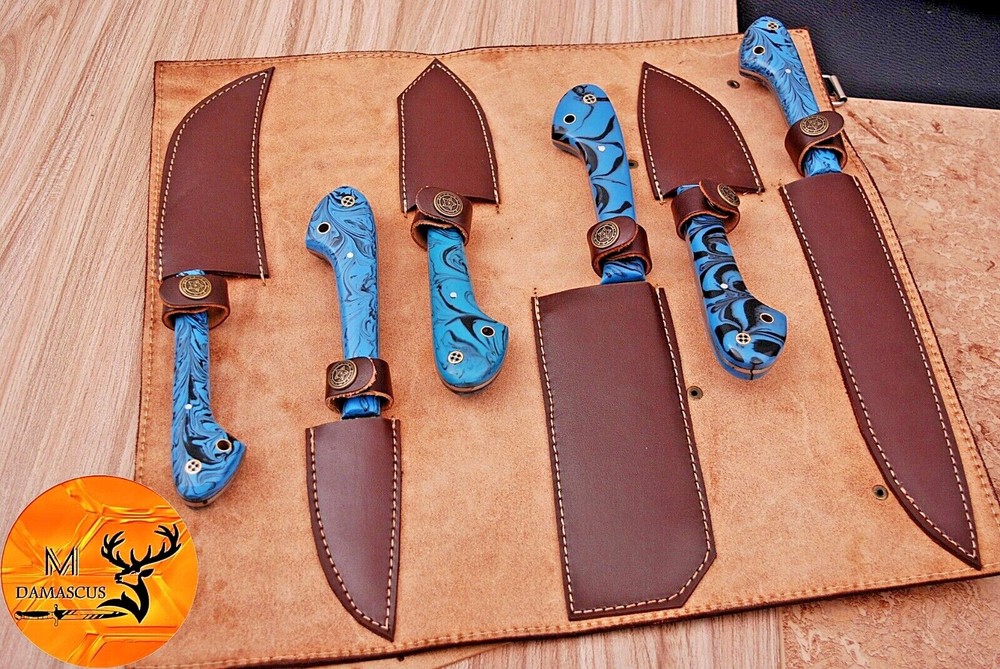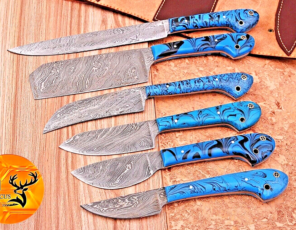 CUSTOM HAND MADE FORGED DAMASCUS STEEL BLADE CHEF KITCHEN KNIFE SET Resin Handle This superb design Chef Knife Set is hand forged. Blade of this knife has a nice file work and is made of 512 layers of 4340 stainless steel and 1075 high carbon steel and hardness 55-58 HRC . This robust Blank Blade is lab tested under intense conditions, the balance and shape of this Blank Blade ensures perfect grip. Overall Pieces : 6 Slicing Knife : Blade 8" Inches - Handle 4.5" Inches Cleaver Knife : Blade 6" Inches - Handle 5" Inches Peel Knife : Blade 5.25" Inches - Handle 4.75" Inches paring Knife : Blade 4" Inches - Handle 4.75" Inches paring Knife : Blade 3.5" Inches - Handle 4.75" Inches Santoku Knife : Blade 4.5" Inches - Handle 4.75" Inches Damascus Design: Twist Pattern Layers: 512 Package Includes: with Leather Sheath Bag Care Instructions: Keep the knife dry after each cleaning. Warning: Keep fingers clear of blades. Store away from children.
