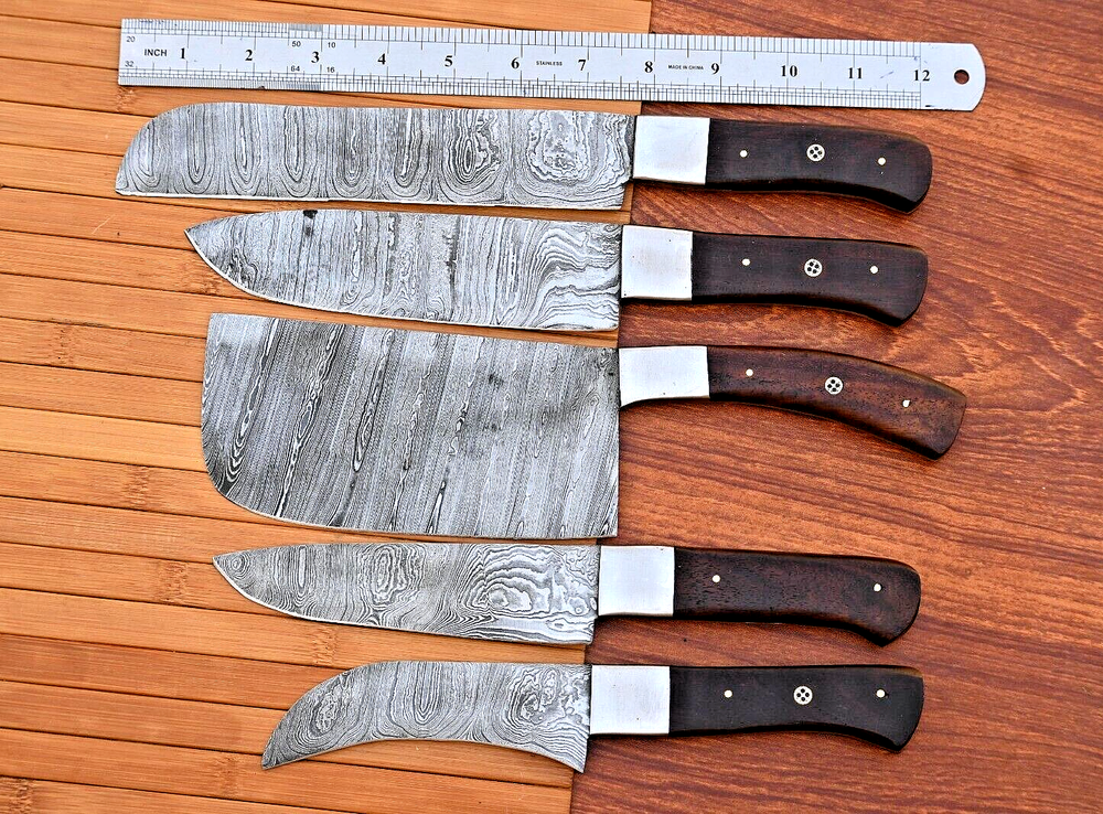 CUSTOM HAND MADE CHEF KNIFE SET HAND FORGED DAMASCUS STEEL BLADE Wood & Steel Bolster Handle This superb design knifes is hand forged. Blade of this knife has a nice file work and is made of 512 layers of 4340 stainless steel and 1075 high carbon steel and hardness 55-58 H R C . This robust knife is lab tested under intense conditions, the balance and shape of this knife ensures perfect grip. Overall Pieces : 5 Bread Knife : Blade 8" Inches - Handle 4.5" Inches Cleaver Knife : Blade 6.5" Inches - Handle 4.5" Inches Chef Knife : Blade 7" Inches - Handle 4.5" Inches Steak knife : Blade 5.5" Inches - Handle 4.5" Inches Paring Knife : Blade 4.5" Inches - Handle 4" Inches Damascus Design: Twist Pattern Layers:512 Care Instructions: Keep the knife dry after each cleaning. Warning: Keep fingers clear of blades. Store away from children.