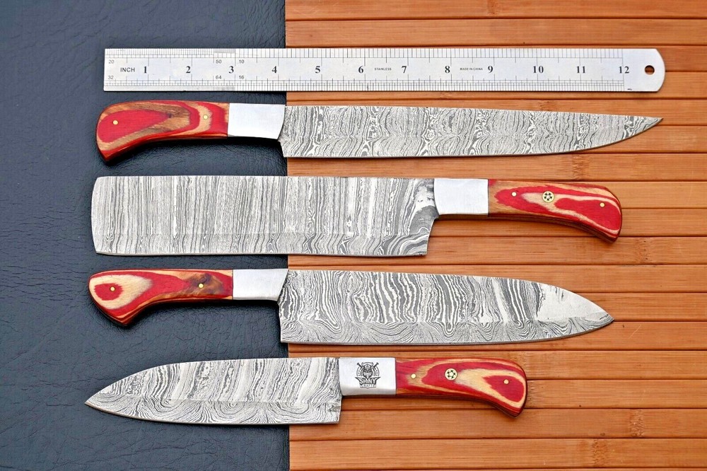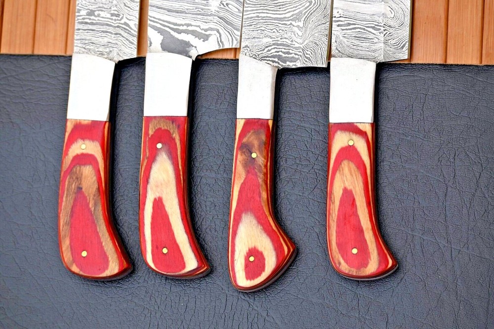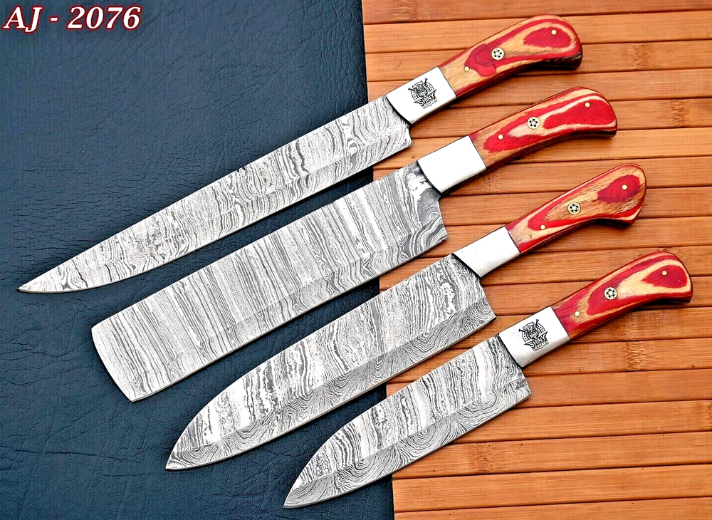 CUSTOM HAND MADE CHEF KNIFE KNIFE HAND FORGED DAMASCUS STEEL BLADE Wood & Steel Bolster Handle This superb design knifes is hand forged. Blade of this knife has a nice file work and is made of 512 layers of 4340 stainless steel and 1075 high carbon steel and hardness 55-58 HRC . This robust knife is lab tested under intense conditions, the balance and shape of this knife ensures perfect grip. Overall Pieces : 4 Utility Knife : Blade 9" Inches - Handle 4.5" Inches Cleaver Knife : Blade 8" Inches - Handle 4.5" Inches Chef Knife : Blade 8" Inches - Handle 4.5" Inches Steak knife : Blade 5" Inches - Handle 4.25" Inches Damascus Design: Twist Pattern Layers:512 Care Instructions: Keep the knife dry after each cleaning. Warning: Keep fingers clear of blades. Store away from children.