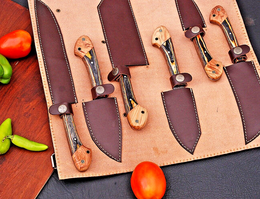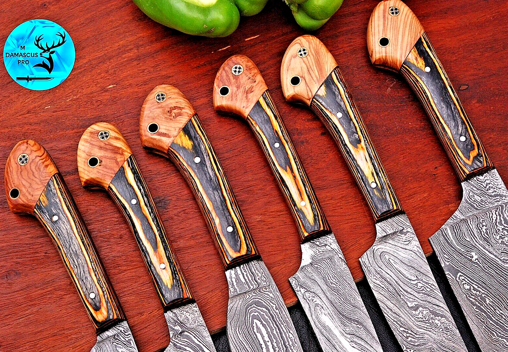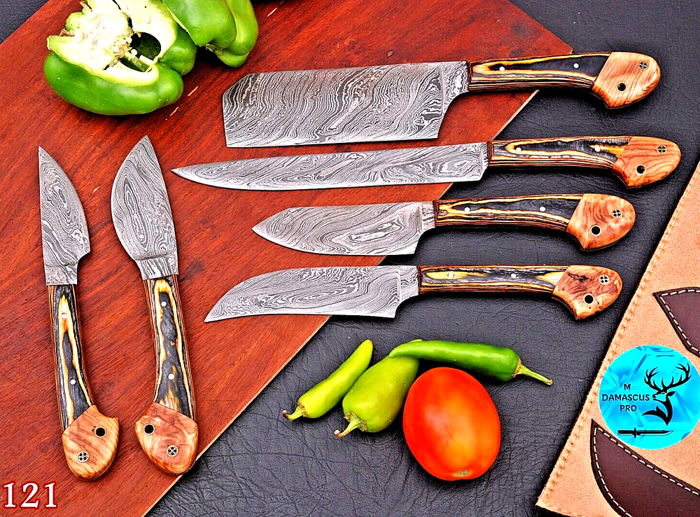 MPN: N/A Handle Material: WOOD Number of Items in Set: 6 Blade Length: 8 in Food Compatibility: Vegetable, Candy, Cheese, Fruit, Meat, Salad, Universal Type: CHEF KITCHEN KNIFE SET Custom Bundle: Yes Features: With Handles Set Includes: Cleaver, Paring & Peeling Knives, Santoku Knife, Slicer, Steak Knife, Vegetable Knife Personalize: No Material: Damascus Steel Brand: Damascus Making Method: Compressor Blade Edge: VERY SHARP Color: Brown