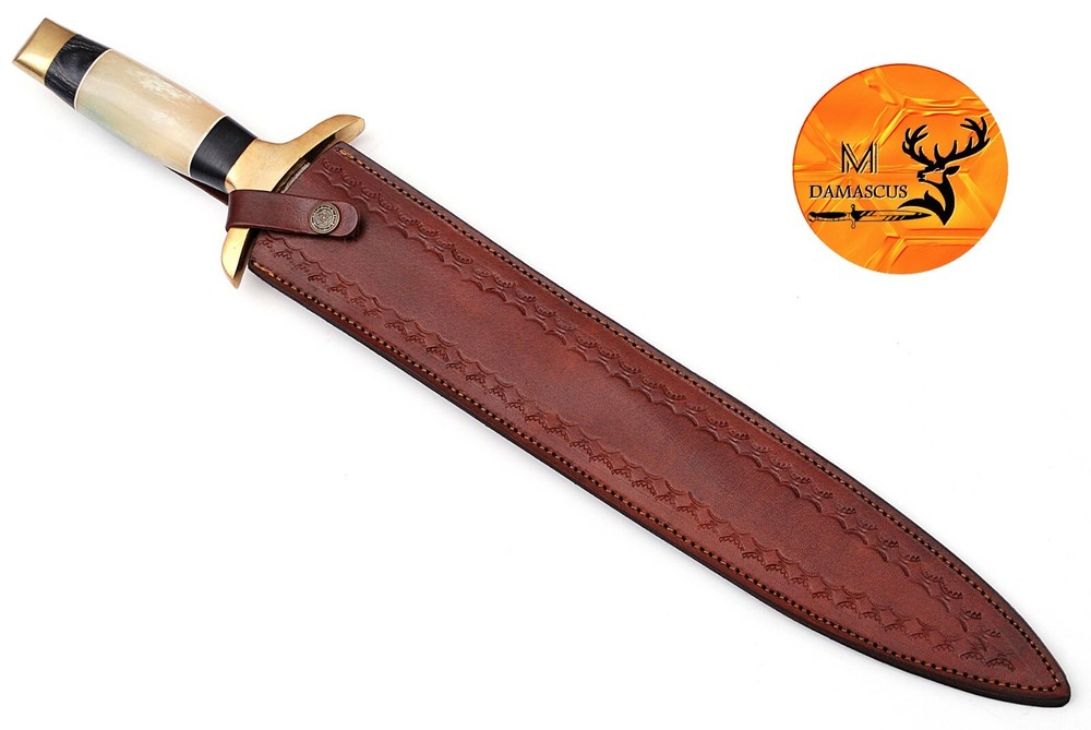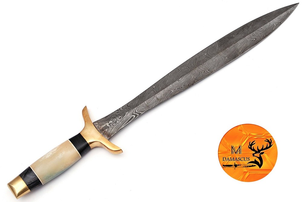 CUSTOM MADE HAND FORGED DAMASCUS STEEL DOUBLE EDGE SWORD This superb design Sword is hand forged. Blade of this Sword has a nice file work and is made of 512 layers of 4340 stainless steel and 1075 high carbon steel and hardness 55-58 HRC . This robust Sword is lab tested under intense conditions, the balance and shape of this Sword ensures perfect grip. Overall Length: 22” Inches Blade Length: 16” Inches Handle Length: 6” Inches Damascus Design: Twist Pattern Layers: 512 Package Includes: with Sheath Warning: Keep fingers clear of blades. Store away from children.