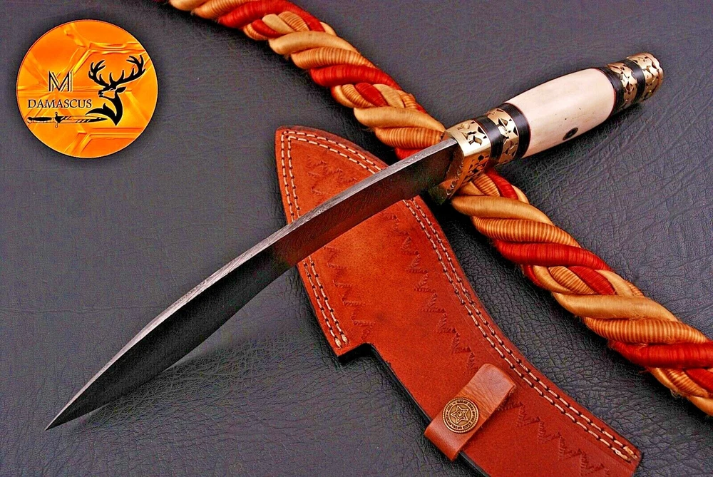 CUSTOM HAND MADE KUKRI KNIFE HAND FORGED DAMASCUS STEEL BLADE Camel Bone & Brass Guard Handle This superb design knife is hand forged. Blade of this knife has a nice file work and is made of 512 layers of 4340 stainless steel and 1075 high carbon steel and hardness 55-58 HRC . This robust knife is lab tested under intense conditions, the balance and shape of this knife ensures perfect grip. Overall Length: 13" Inches Blade Length: 8.5" Inches Handle Length: 4.5" Inches Damascus Design: Twist Pattern Layers: 512 Package Includes: with Leather Sheath Care Instructions: Keep the knife dry after each cleaning. Warning: Keep fingers clear of blades. Store away from children.