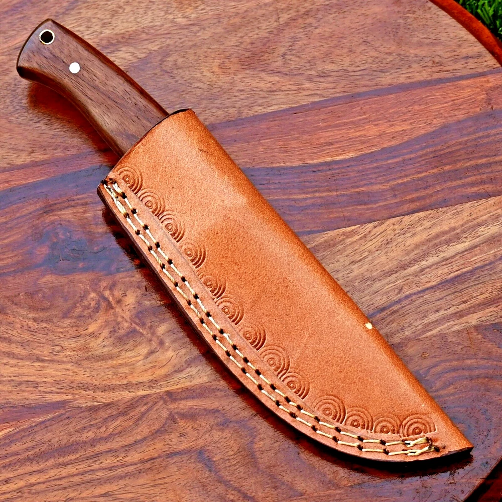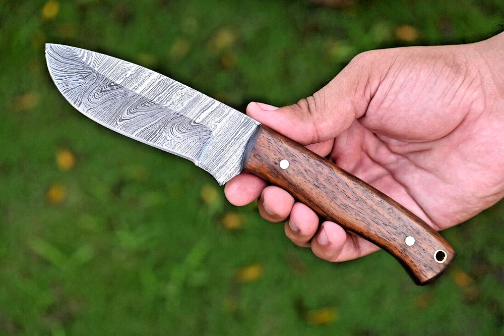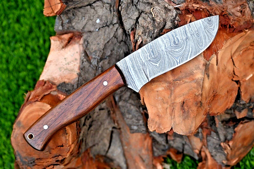 CUSTOM MADE HAND FORGED DAMASCUS STEEL SKINNER KNIFE HUNTING CAMPIN SURVIVAL HIKING KNIFE Wood Handle This superb design knife is hand forged. Blade of this knife has a nice file work and is made of 512 layers of 4340 stainless steel and 1075 high carbon steel and hardness 55-58 HRC . This robust knife is lab tested under intense conditions, the balance and shape of this knife ensures perfect grip. Overall Length: 9" Inches Blade Length: 5" Inches Handle Length: 4" Inches Damascus Design: Rain Drop Pattern Layers: 512 Hardness: 55-58 HRC Package Includes: with Leather Sheath Warning: Keep fingers clear of blades. Store away from children.