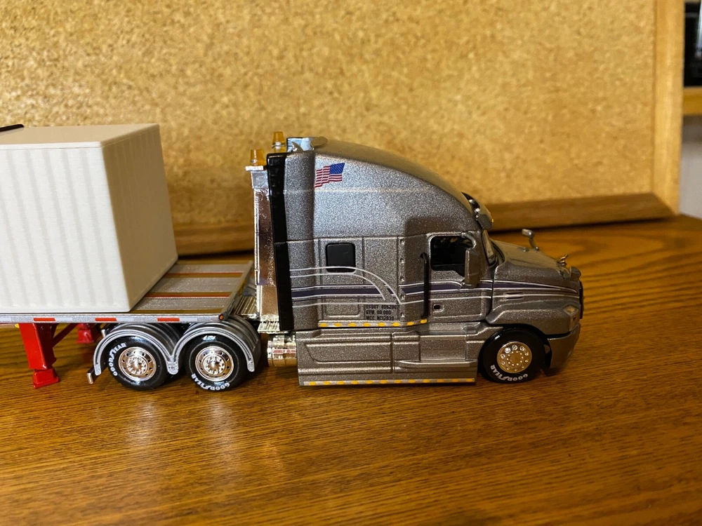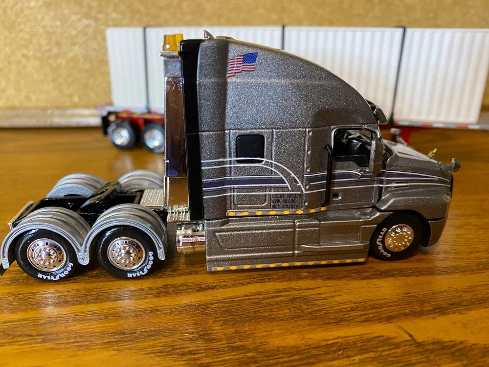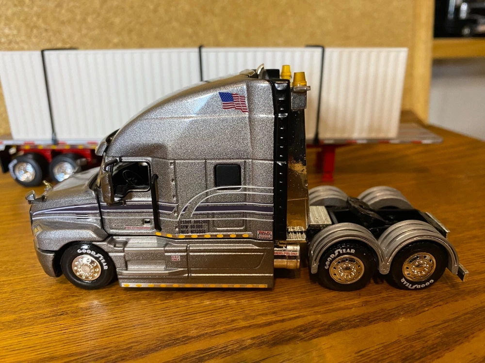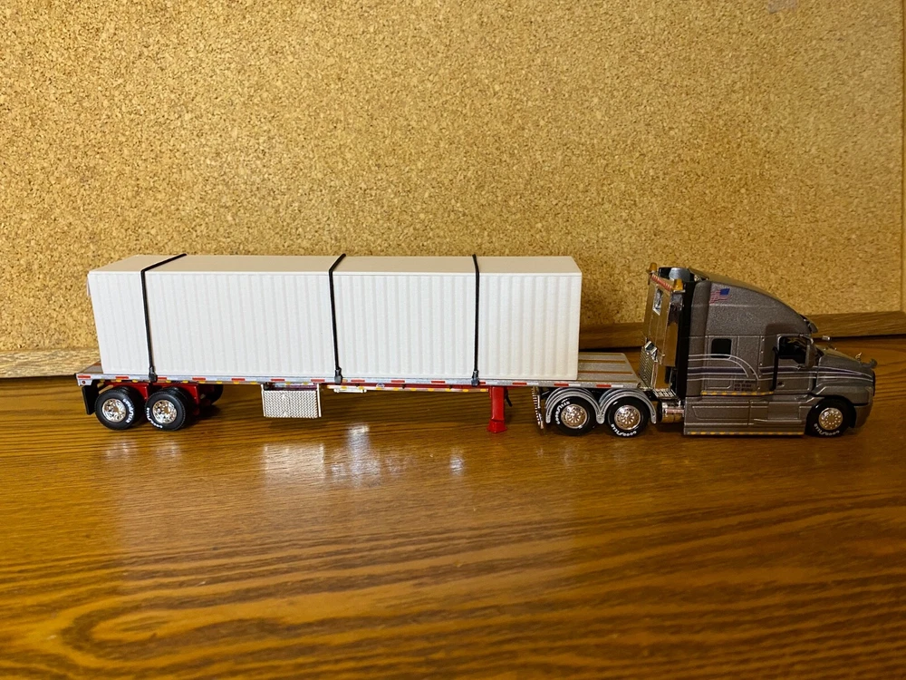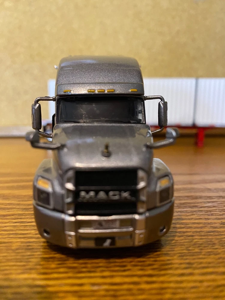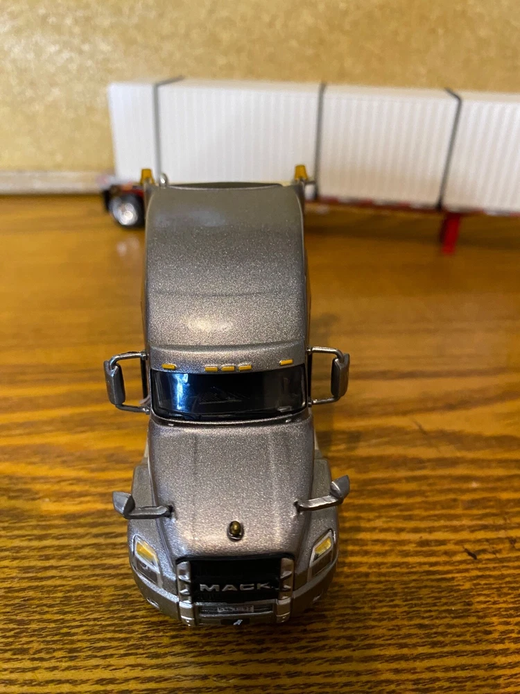 CUSTOMIZED 1/64 MACK ANTHEM HIGWAY TRACTOR WITH HIRISE SLEEPER & DCP 53 FOOT FLATDECK TRAILER & CONTAINER LOAD. TRACTOR HAS BEEN NICELY DETAILED, TRUCKING TYPE DECALS, CHROME TOOL BOX, CHROME HEADACHE RACK WITH TOOL BOX, ADDED SAFETY BEACONS, MOULDED REAR FENDERS WITH CHROME INSERTS, CHROME REAR BUMPER & LIGHTS, MATCHING BRANDED TIRES. OPENING HOOD TO REVEAL ENGINE.LOTS OF LIGHTS. HAS SUPER SINGLE TIRES ON REAR AS OPPOSED TO DUALS. TRAILER HAS UNDER FRAME ADDED TOOL BOXES, ADDITIONAL FRAME MOUNTED LIGHTS, CONTAINER ON TRAILER AS LOAD. TIED DOWN WITH CHAINS. UNIT IS CLEAR COATED, 1 OF 1. DECALS ARE PROFESSIONALLY PRODUCED, NOT THE CHEAP WATER SLIDE TYPE