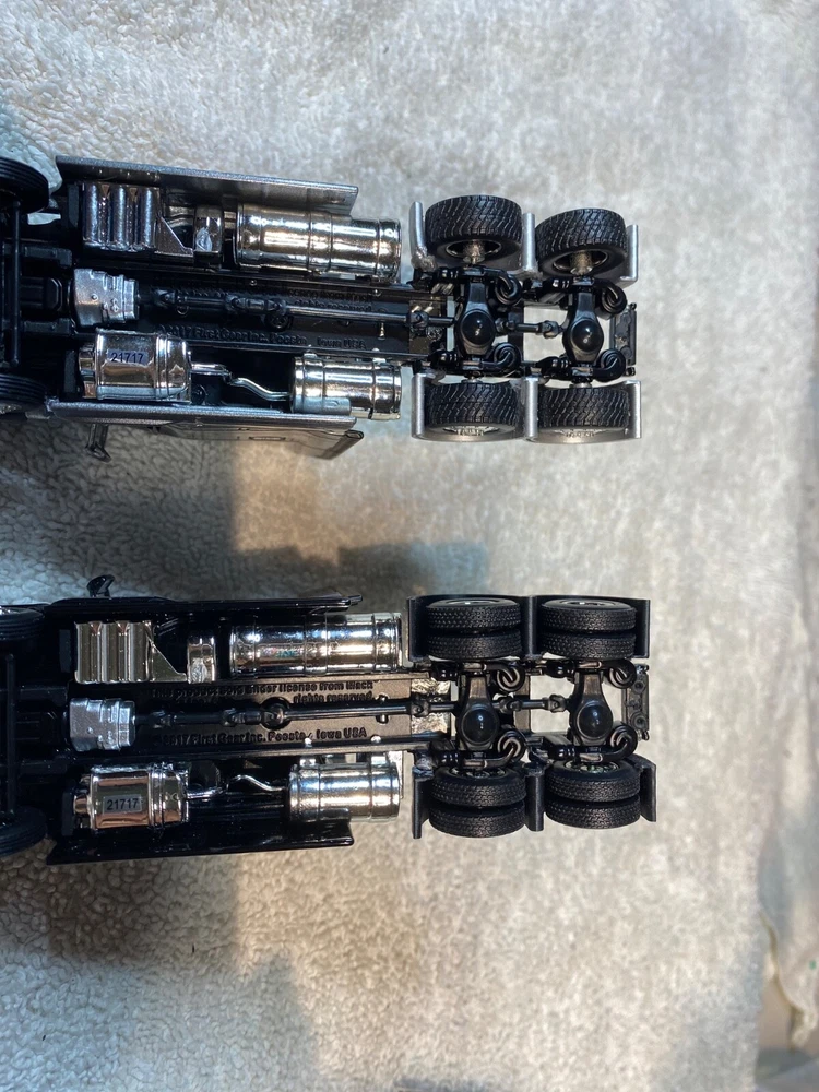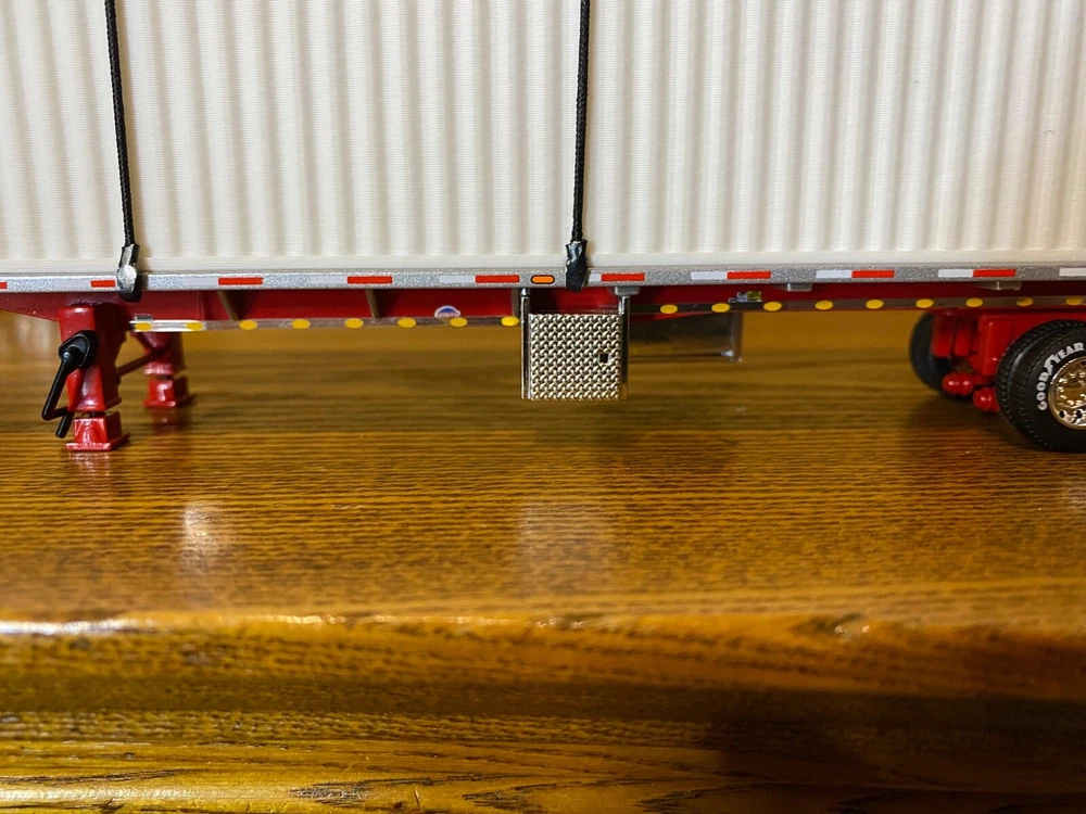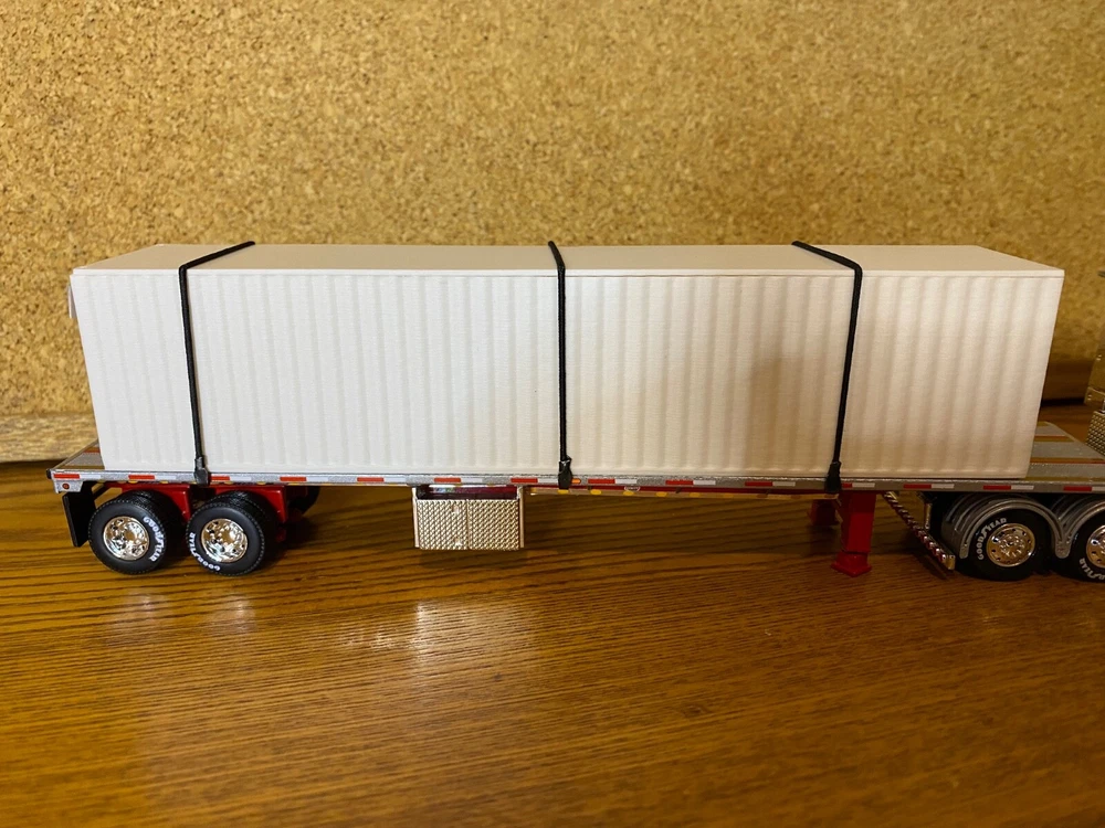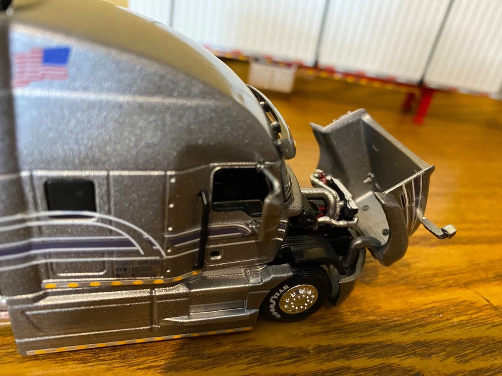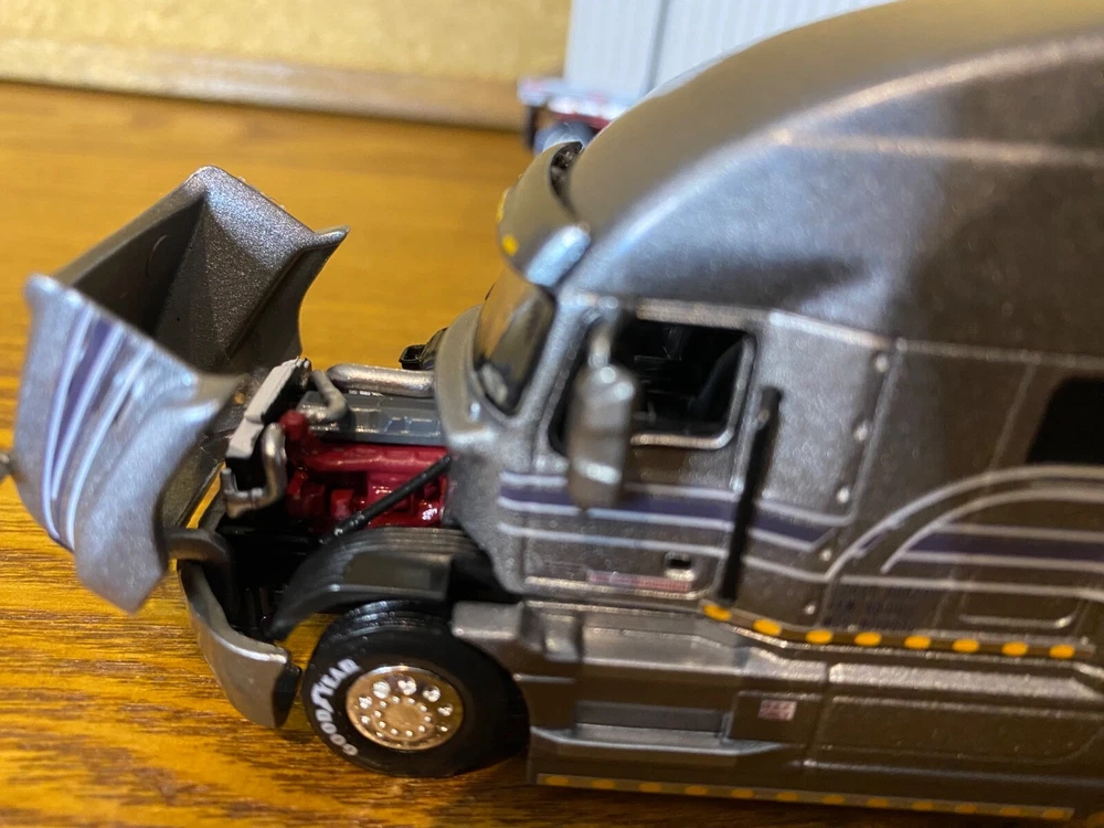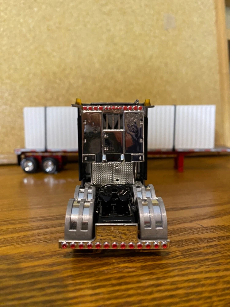 CUSTOMIZED 1/64 MACK ANTHEM HIGWAY TRACTOR WITH HIRISE SLEEPER & DCP 53 FOOT FLATDECK TRAILER & CONTAINER LOAD. TRACTOR HAS BEEN NICELY DETAILED, TRUCKING TYPE DECALS, CHROME TOOL BOX, CHROME HEADACHE RACK WITH TOOL BOX, ADDED SAFETY BEACONS, MOULDED REAR FENDERS WITH CHROME INSERTS, CHROME REAR BUMPER & LIGHTS, MATCHING BRANDED TIRES. OPENING HOOD TO REVEAL ENGINE.LOTS OF LIGHTS. HAS SUPER SINGLE TIRES ON REAR AS OPPOSED TO DUALS. TRAILER HAS UNDER FRAME ADDED TOOL BOXES, ADDITIONAL FRAME MOUNTED LIGHTS, CONTAINER ON TRAILER AS LOAD. TIED DOWN WITH CHAINS. UNIT IS CLEAR COATED, 1 OF 1. DECALS ARE PROFESSIONALLY PRODUCED, NOT THE CHEAP WATER SLIDE TYPE