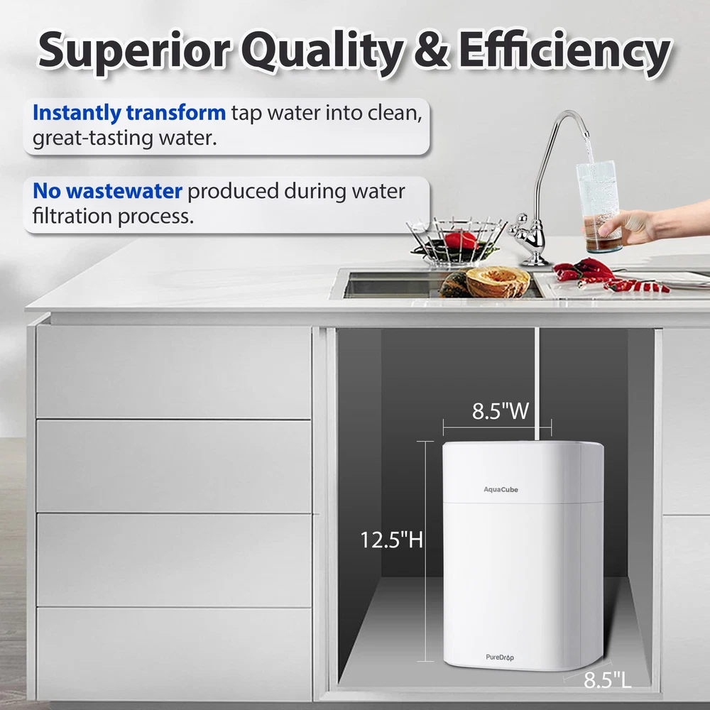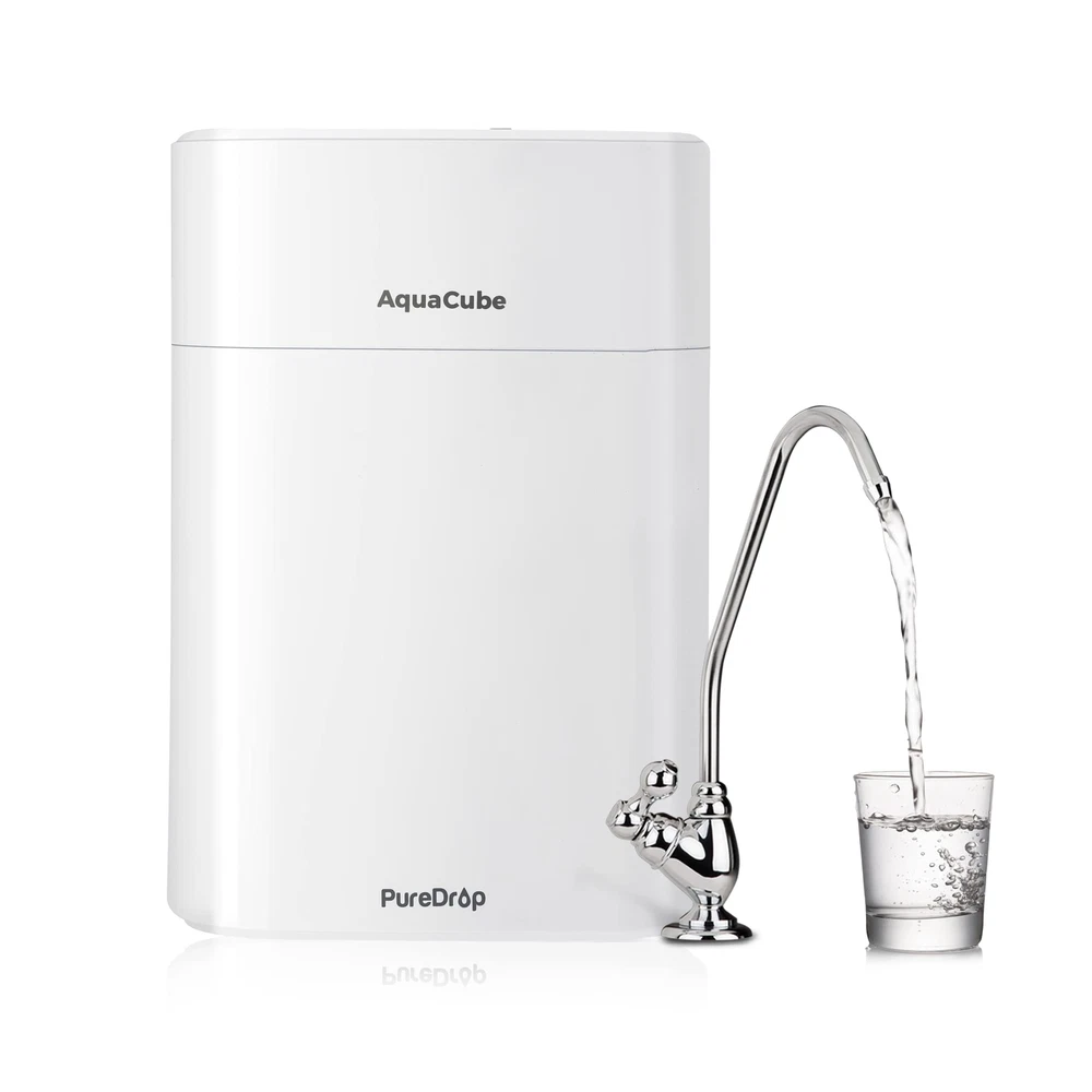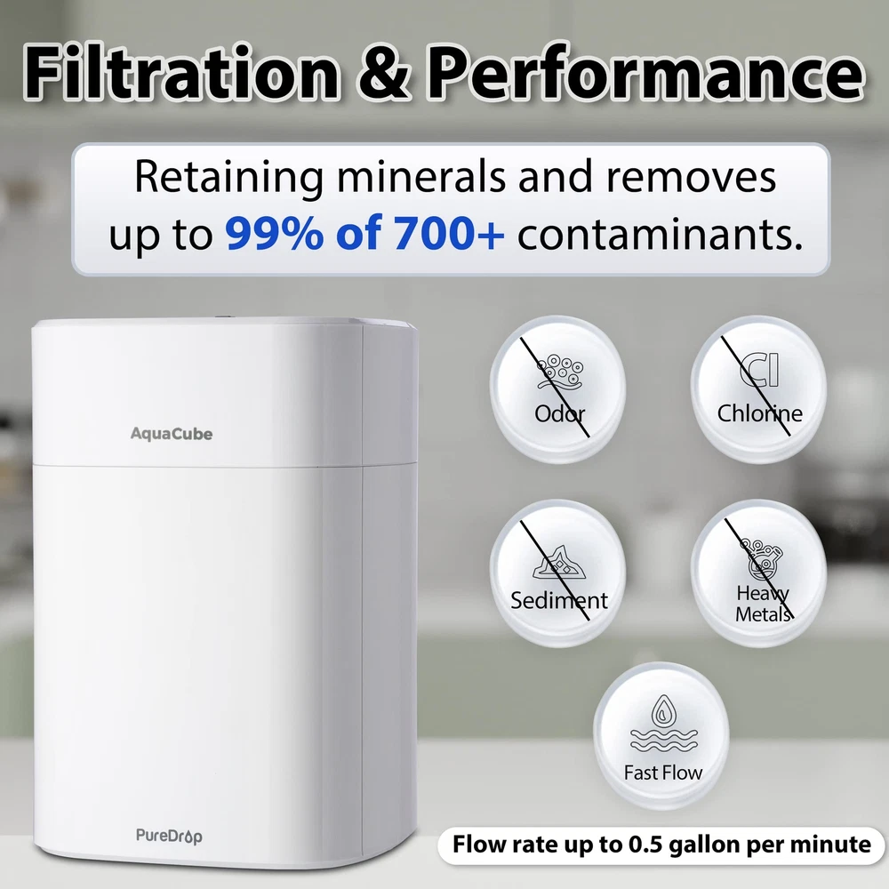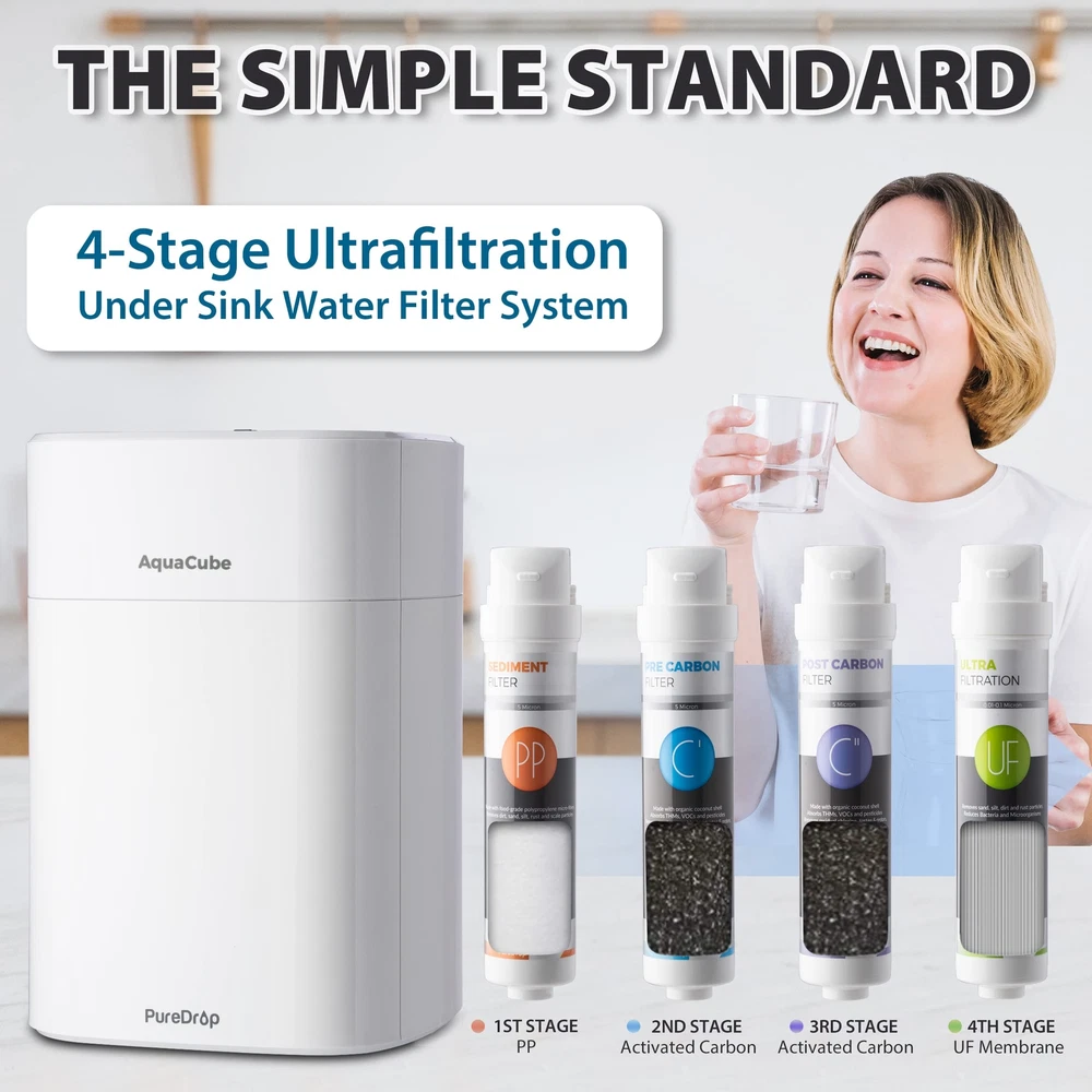 "Why Aquacube (CUW4)? The CUW4 is simpler and more compact than traditional reverse osmosis systems. It’s best used for filtering and purifying municipal water supplies. The advanced 4-stage design of the CUW4 features a unique combination of sediment, activated carbon, and ultra-filtration filters. It eliminates a wide variety of unhealthy contaminants, including bacteria, algae, fungi, giardia, lead, arsenic, iron, nickel, chromium, cadmium, calcium, aluminum, mercury, chlorine and chlorine treatment by-products, pesticides, hydrogen sulfide, and other organic compounds. You experience safer, healthier, and better-tasting water without the hassle, expense, and negative environmental impact of bottled water. The CUW4 is flexible, quiet, and durable. The integrated design has no moving parts and is very easy to maintain. Our high-capacity, high-performance filters last longer and provide maximum water flow – a difference you’ll notice when you turn on the faucet. The Click on/off filter design means changing filters couldn’t be easier. No tank is needed with the system which means no wasted space. The system includes a lead-free faucet with beautiful chrome finish which is usually mounted on the counter as the primary source of drinking water. The CUW4 also easily adapts to fit nearly any refrigerator or ice maker connection. The CUW4 has been designed from the ground up to be easy for most users to install themselves, using readily available tools. The pre-assembled system includes push-to-connect fittings that simplify the installation process and minimize the possibility of leaks. A clear and well-organized instruction manual guides you step-by-step through the entire installation and testing process. If you do run into an issue or get stuck, our technical support team is ready to assist you, Monday through Friday between the hours of 9 am to 5 pm Eastern time. Georgia. If you have a need to reduce overall dissolved solids in the water (reduce TDS) or to remove heavy concentrations of harmful metals like lead or copper, a reverse osmosis system like the PureDrop RTW5 is recommended. But for all-around high-performance water filtration, or where space is at a premium, the CUW4 is the best, most economical and flexible choice for clean, fresh, great-tasting water instantly. " [Better-tasting Water]: The 4-stage multipurpose undersink water filtration system with its 0. 01 micron Ultra Filtration (UF) stage removes up to 99% of most problematic pollutants, including chlorine and chlorine treatment by-products, lead, arsenic, and much more while retaining minerals. [Efficient and Convenient]: Enjoy a faster water flow (0. 32-0. 5 GPM vs 0. 03 GPM with traditional water filter systems). The unit can be placed under the sink or connected to your refrigerator(ICEK needed). The elegant, modern, compact design needs no tank, wastes no water, and provides ultra-quiet operation. Stay informed on your filter’s status with the integrated LED filter change indicator. Just press and hold both buttons to start. [Easy Installation and Maintenance]: Cut hassles, not corners with a typical installation time of less than 30 minutes. The unique design of the integrated water route reduces installation time dramatically, and the click-on filter installation ensures easy installation and maintenance. [Durable and Reliable]:All filters, tubing and other water-contacting parts are manufactured to comply strictly with industry and NSF/ANSI standards. Please feel free to contact us if you have any questions. We always put our customer satisfaction as our top priority and reply as soon as possible. [Please Note]: To open the filter replacement indicator, simultaneously press both RESET BUTTONS.This is a 0.01-micron Ultra Filtration(UF) unit and will not reduce the TDS of the incoming water. Instead, it keeps the minerals in your water. If you are interested in a filter that removes TDS, please consider a reverse osmosis system like the PureDrop RTW5.