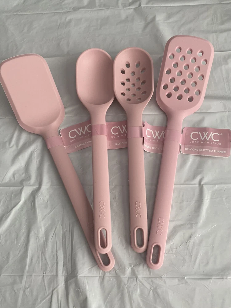 CWC Silicone Kitchen Utensils 4 Pieces Set Pink New 1 Slotted Turner, 1 Slotted Spoon, 1 Turner, 1 Spoon