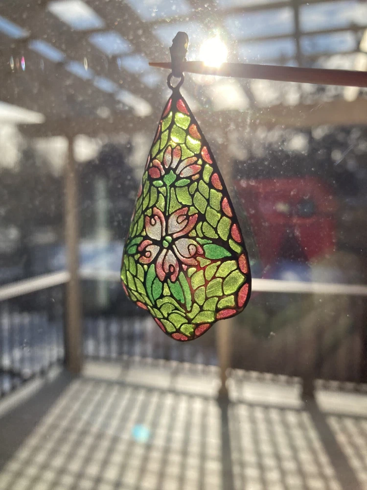 This is an amazing feat of craftmanship. Handmade, this plique du jour pendant seems very old, judging from the ornate bale that has an arts & crafts design. Beautiful greens and pinks radiate from the silver surrounds of each piece of "cathedral window." It hangs about 2.5" inches including the bale and is 1.25" at its widest point. It is marked "sterling" on the bale.