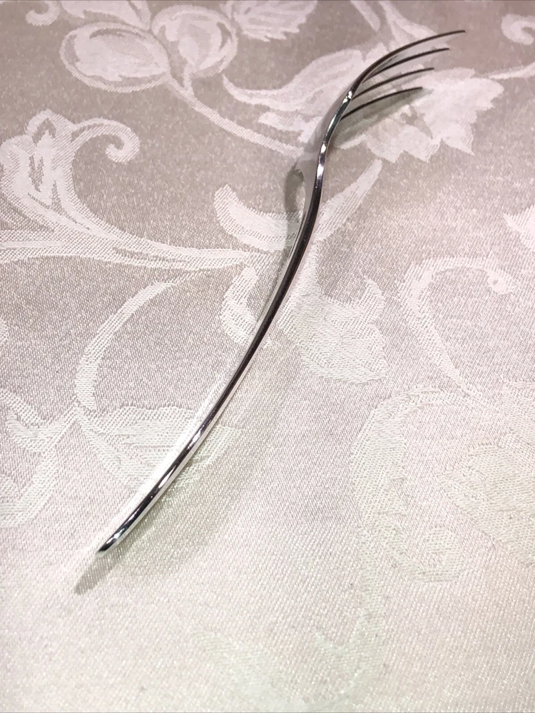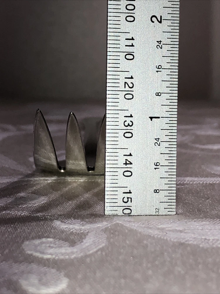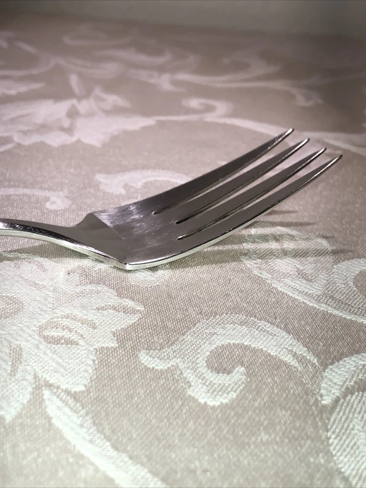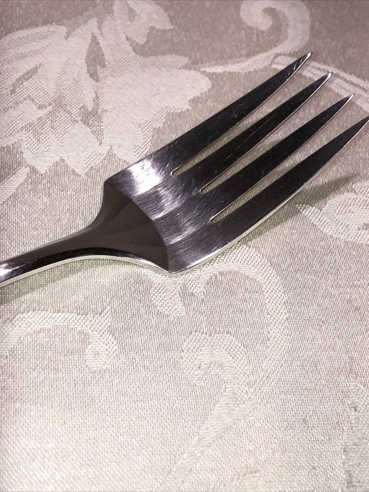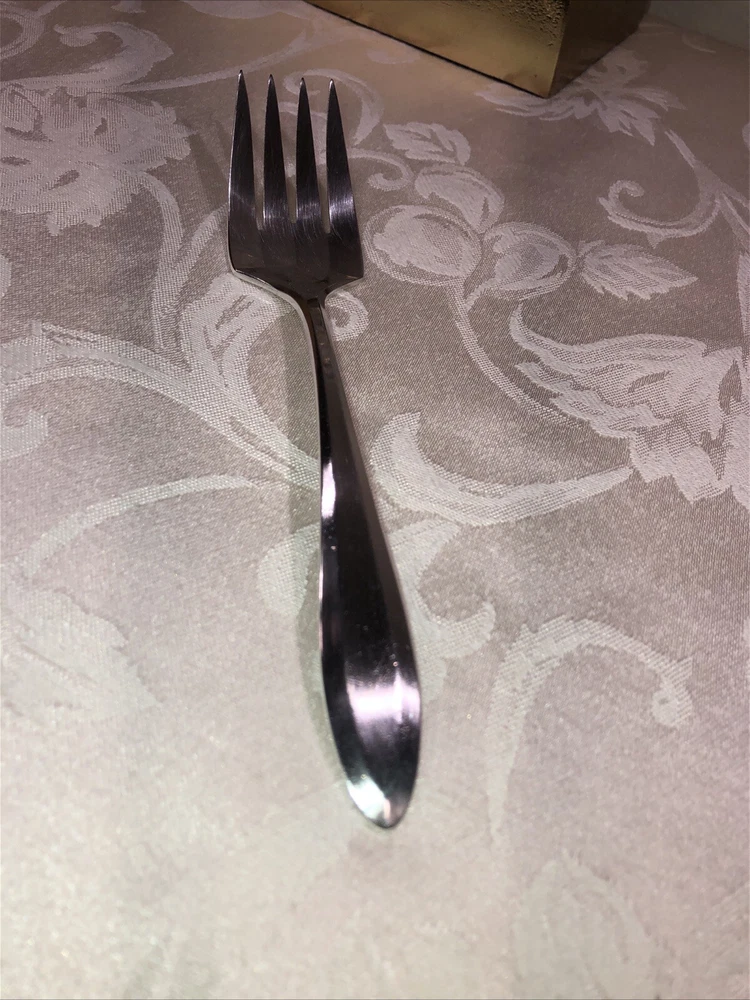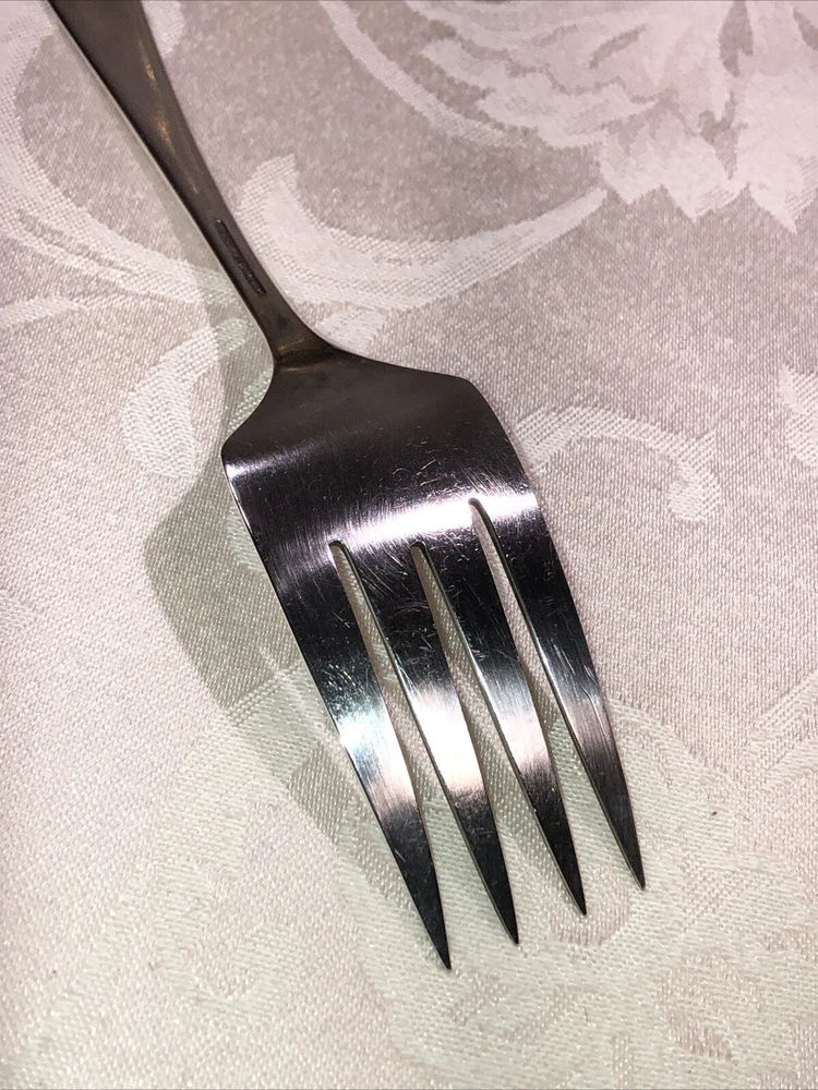 Circa 1914 Oneida Community Plate silver plated cold meat serving fork. Style presented is Patrician. Preowned. Used as a serving utensil on meat platters. Very spare in design yet elegant on a serving table. The Patrician flatware line, albeit discontinued well over half a century ago (some estimates assert the design was carried into the 1940’s), is collectible. The fork shows slight surface scratches from use and handling above and below. No other damage to report. Measures 8 3/4”L X 1 1/2”W X 1”T. Weighs 2.3 ounces. See photos.