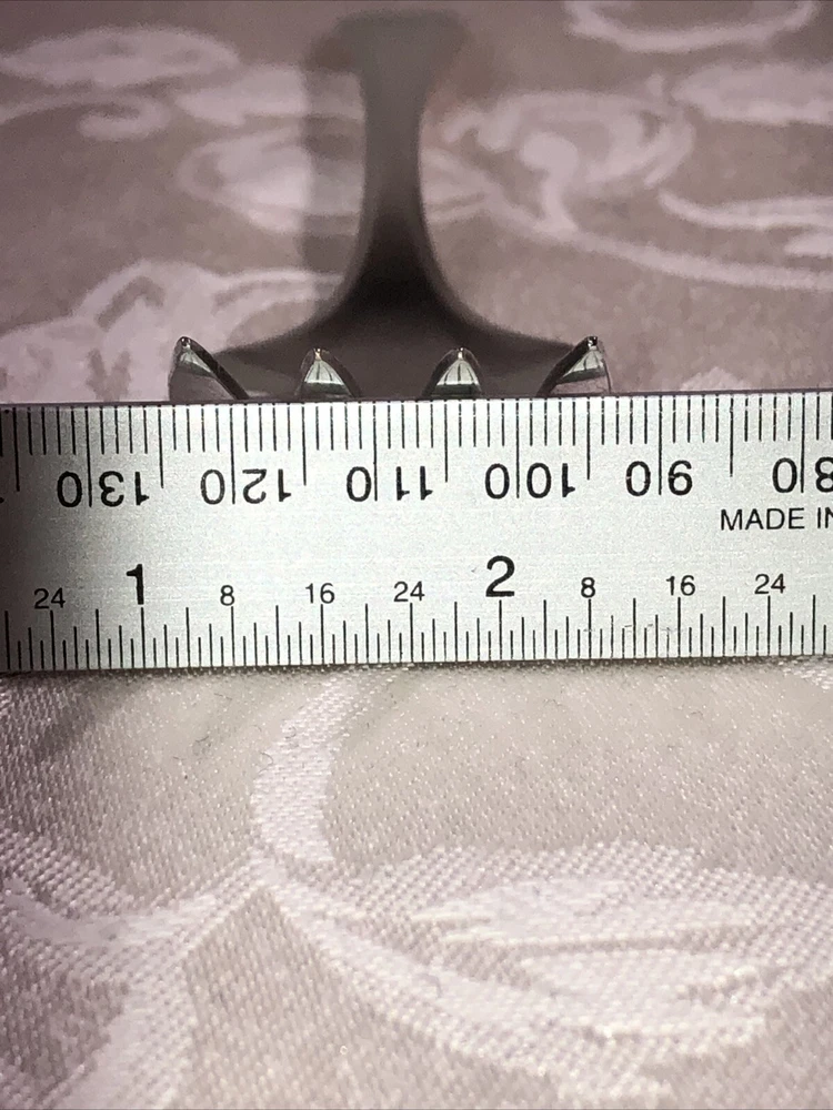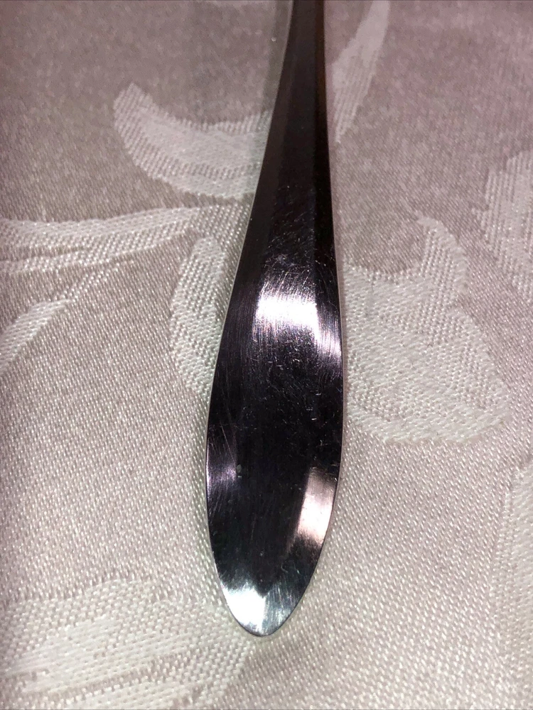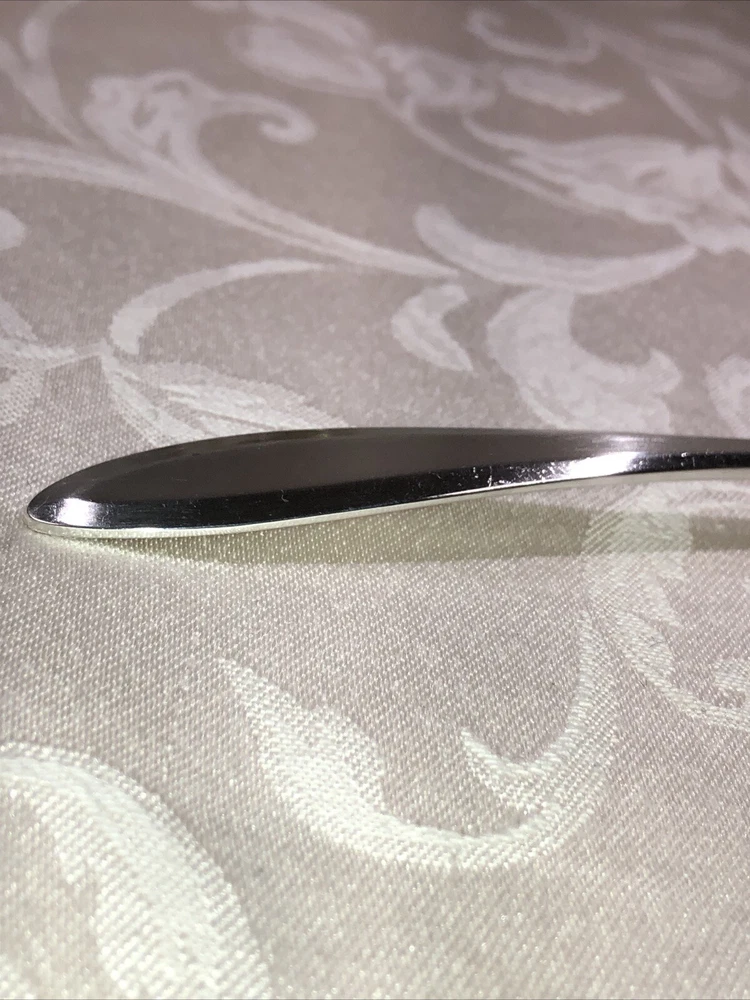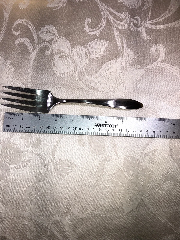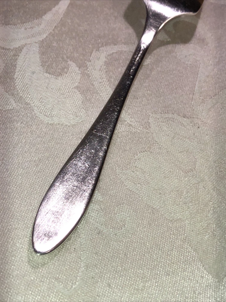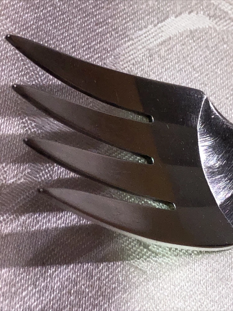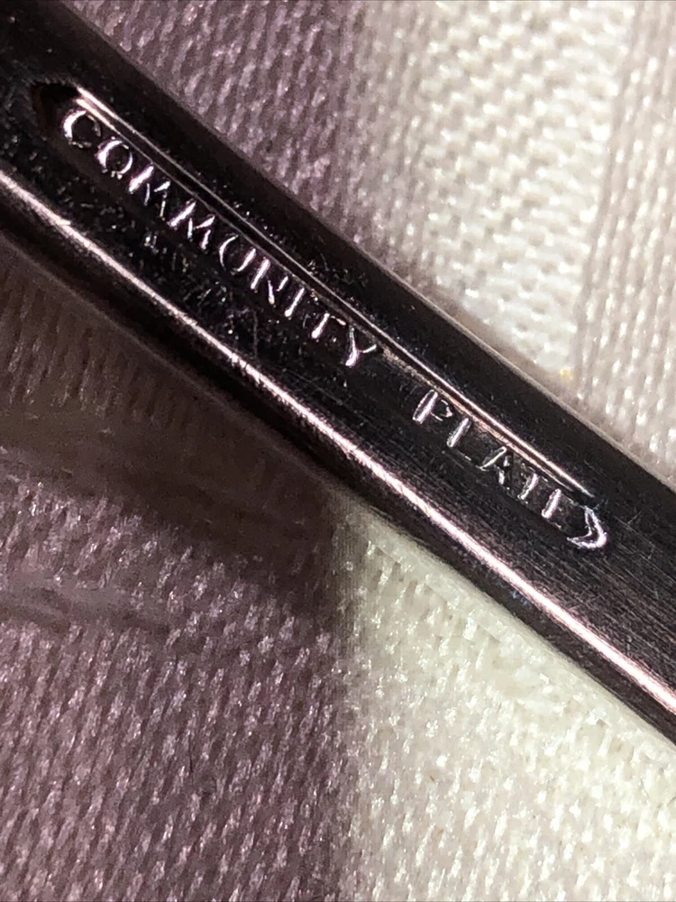 Circa 1914 Oneida Community Plate silver plated cold meat serving fork. Style presented is Patrician. Preowned. Used as a serving utensil on meat platters. Very spare in design yet elegant on a serving table. The Patrician flatware line, albeit discontinued well over half a century ago (some estimates assert the design was carried into the 1940’s), is collectible. The fork shows slight surface scratches from use and handling above and below. No other damage to report. Measures 8 3/4”L X 1 1/2”W X 1”T. Weighs 2.3 ounces. See photos.
