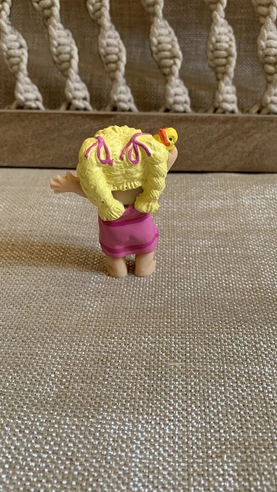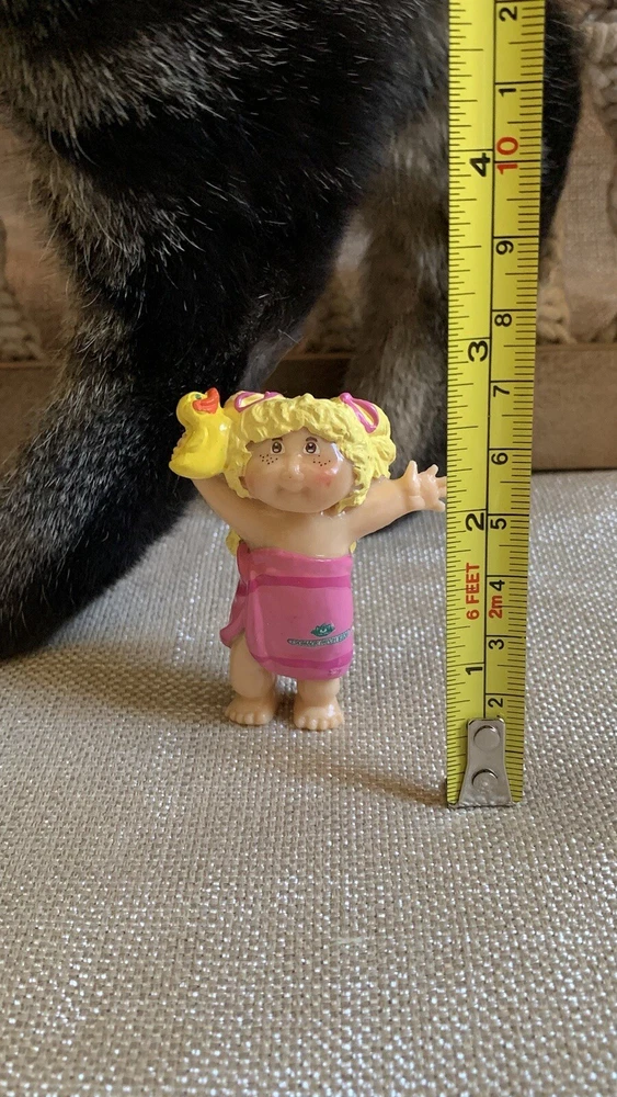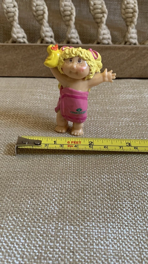 The Cabbage Patch Kids PVC Figure featured is a vintage item from 1984, representing a miniature girl doll with blonde curly hair and brown eyes. This original Cabbage Patch Kids doll is part of the Babies theme and comes dressed in a pink bath towel with a yellow ducky. The doll is made of rubber and does not come with packaging, making it a unique addition to any doll collection. I'm not a collector or expert so please see all photos for condition and let me know if you have any questions or need any more photographs. Due to the reason of light and the display, you can see the picture may have a slight color difference, this is inevitable, please understand. Please review images to make your judgment on cosmetic condition which I believe is a matter of personal opinion. You will get what you see. The photos will overrule the listing title or descriptions if there is any discrepancy.