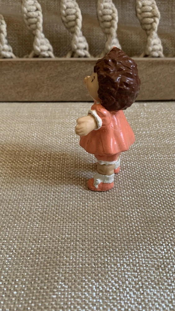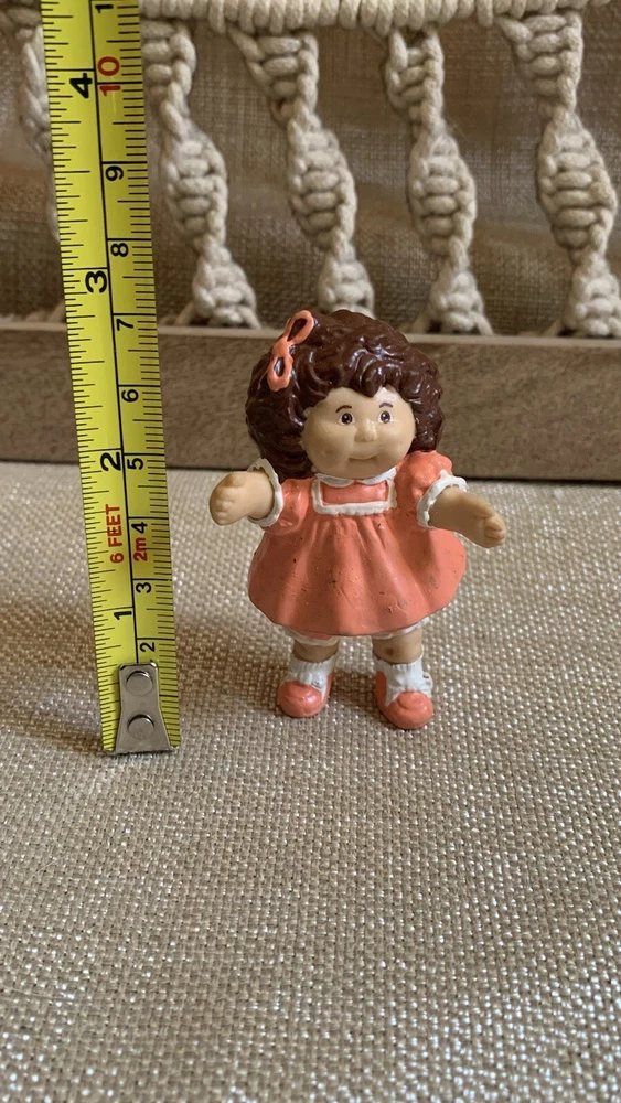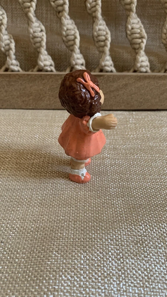 The Cabbage Patch Kids PVC Figure is a vintage collectible from 1984, featuring a miniature girl doll with curly brown hair and brown eyes. She is dressed in a peach-colored dress with a bow in her hair, showcasing the classic Cabbage Patch Kids style. This original Cabbage Patch Kids doll is a part of the franchise's product line and is made of rubber material, making it a unique addition to any doll collection. I'm not a collector or expert so please see all photos for condition and let me know if you have any questions or need any more photographs. Due to the reason of light and the display, you can see the picture may have a slight color difference, this is inevitable, please understand. Please review images to make your judgment on cosmetic condition which I believe is a matter of personal opinion. You will get what you see. The photos will overrule the listing title or descriptions if there is any discrepancy.