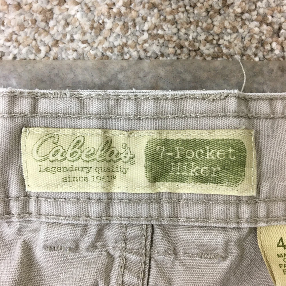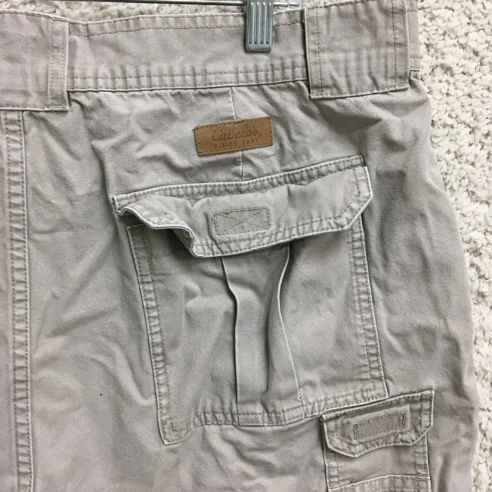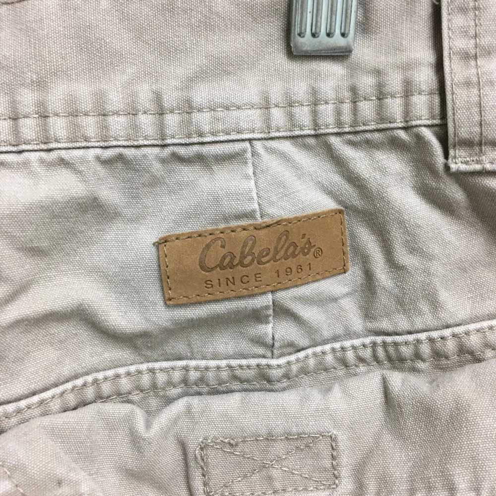 Theme: Logo, Modern, Outdoor Rise: Mid (10-12 in) gtin13: Does not apply Waist Size: 40 in Color: Beige Size: 42 Size Type: Regular Fabric Type: Canvas Pattern: Solid Features: Easy Care, Pockets Pocket Type: Cargo Pocket Closure: Zip Material: Cotton Occasion: Casual, Travel, Workwear Style: Cargo Front Type: Flat Front Department: Men Inseam: 7 in Accents: Button, Logo Season: Fall, Spring, Summer, Winter Country/Region of Manufacture: China Brand: Cabela's Fit: Regular Garment Care: Machine Washable UPC: Does not apply Fabric Wash: Medium