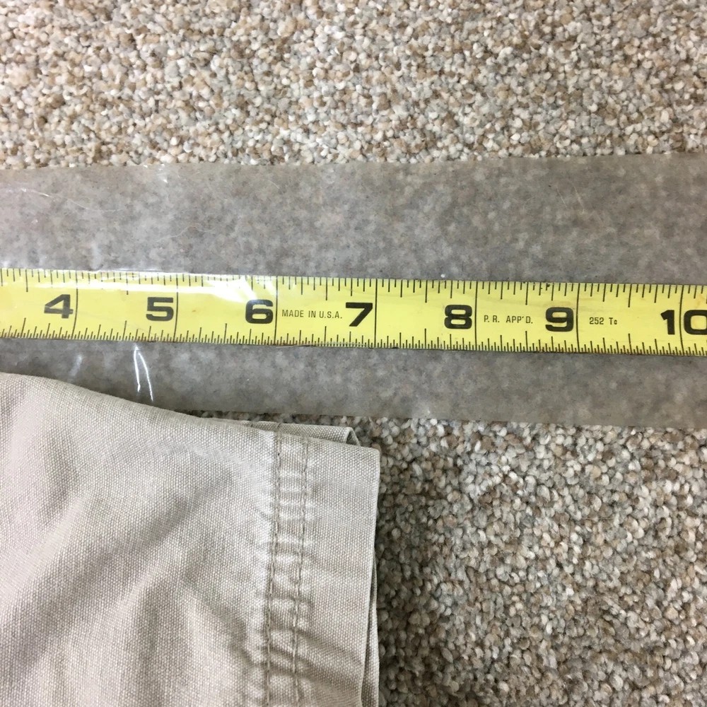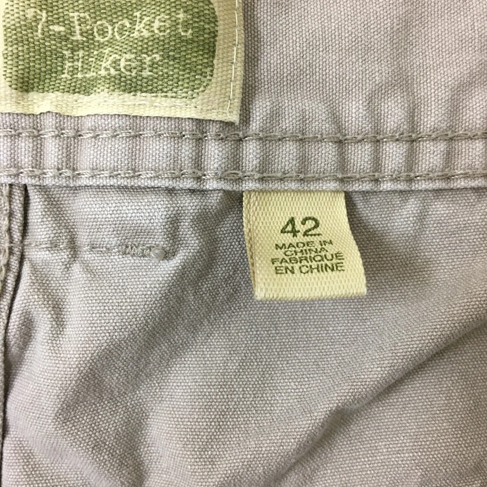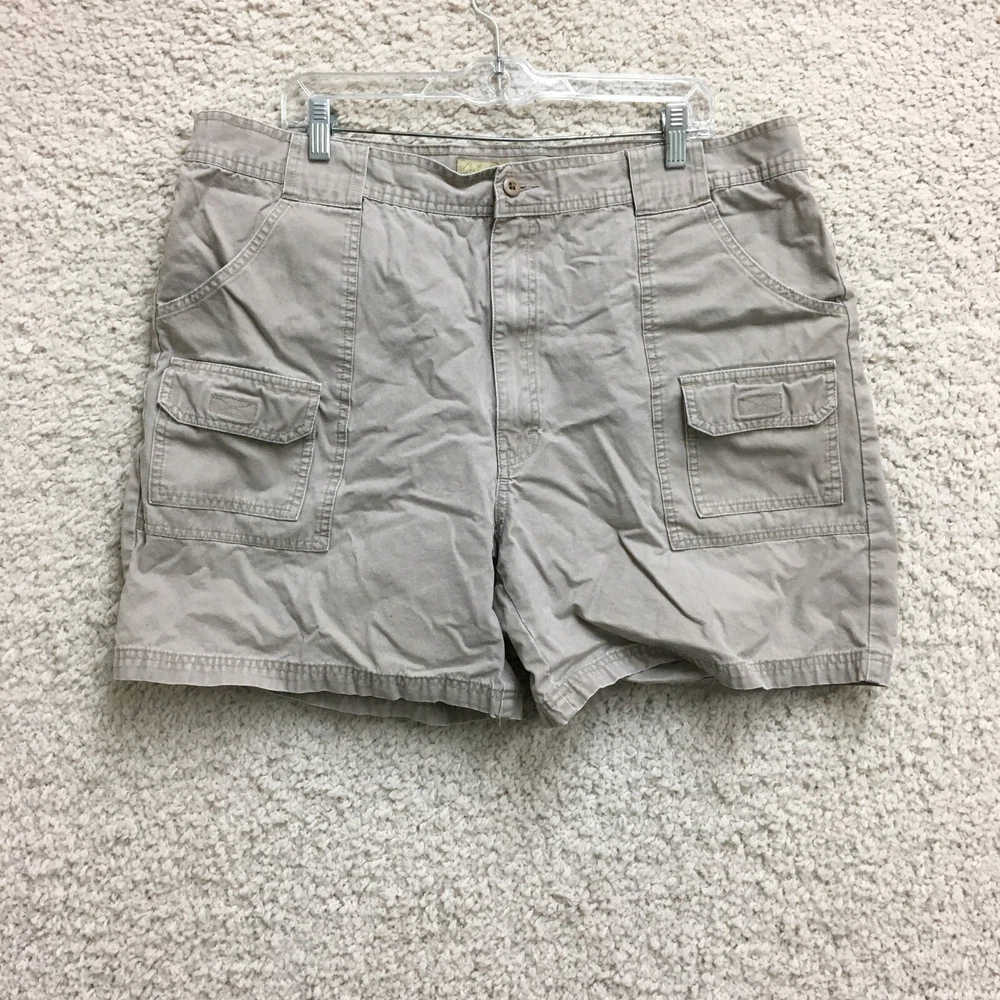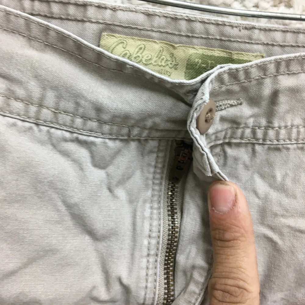 Theme: Logo, Modern, Outdoor Rise: Mid (10-12 in) gtin13: Does not apply Waist Size: 40 in Color: Beige Size: 42 Size Type: Regular Fabric Type: Canvas Pattern: Solid Features: Easy Care, Pockets Pocket Type: Cargo Pocket Closure: Zip Material: Cotton Occasion: Casual, Travel, Workwear Style: Cargo Front Type: Flat Front Department: Men Inseam: 7 in Accents: Button, Logo Season: Fall, Spring, Summer, Winter Country/Region of Manufacture: China Brand: Cabela's Fit: Regular Garment Care: Machine Washable UPC: Does not apply Fabric Wash: Medium