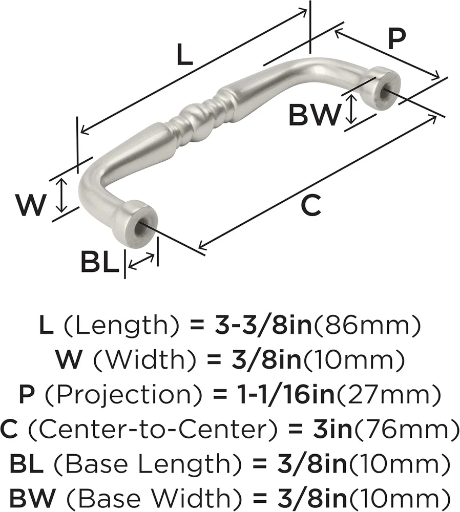 Projection Distance: 1.13 Inches Brand: Does not apply Color: Satin Nickel Theme: Traditional Item model number: BP53006G10 Country of Origin: China Hand Orientation: Ambidextrous Part Number: BP53006G10 Center To Center Spacing: 3 Inches Exterior Finish: Nickel Metal Type: Zinc Voltage: 120 Volts Special Feature: Easy to Install Room Type: Kitchen Manufacturer: Corp Size: 1 Count (Pack of 1) Batteries Required?: No Special Features: Easy to Install Style Traditional: Handle Type Pull Handle Material: Metal Number Of Pieces: 1 Unit Count: 1.0 Count Type: Does not apply Warranty Description: Please visit http://www..com/Support/Customer-Support#warranty fo Is Discontinued By Manufacturer: No Batteries Included?: No Item Weight: 1.31 ounces Handle Material: Aluminum gtin13: 313113838805 Finish: Satin Nickel Item Package Quantity: 1 Global Trade Identification Number: 00026634150775 Item Depth: 1 inch Shape Arch & Bow: Finish Type Satin Nickel UPC: 313113838805 Product Dimensions: 3.38"L x 0.38"W Specific Uses For Product: Cabinets, Drawer Number of Items: 1 Included Components: Screw Package Type: [INF] Box