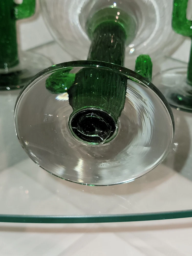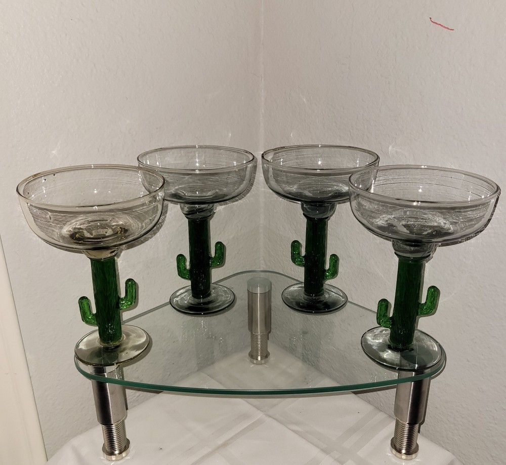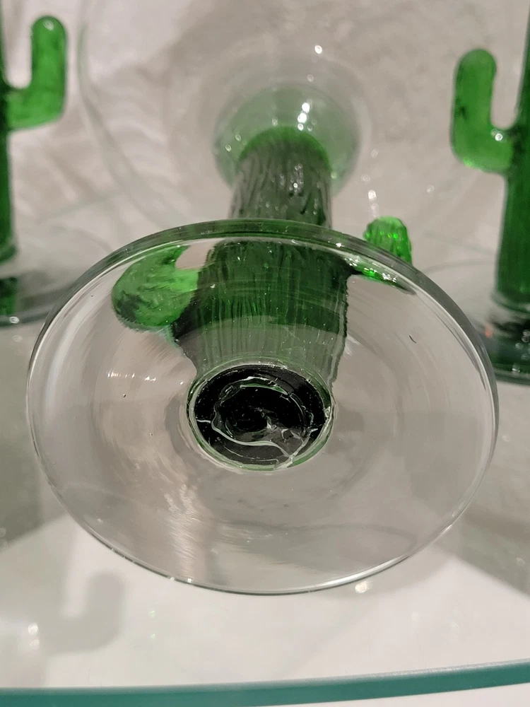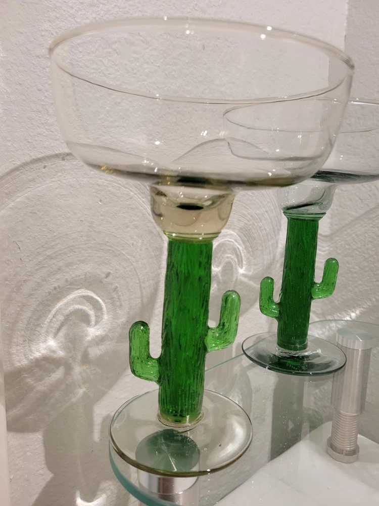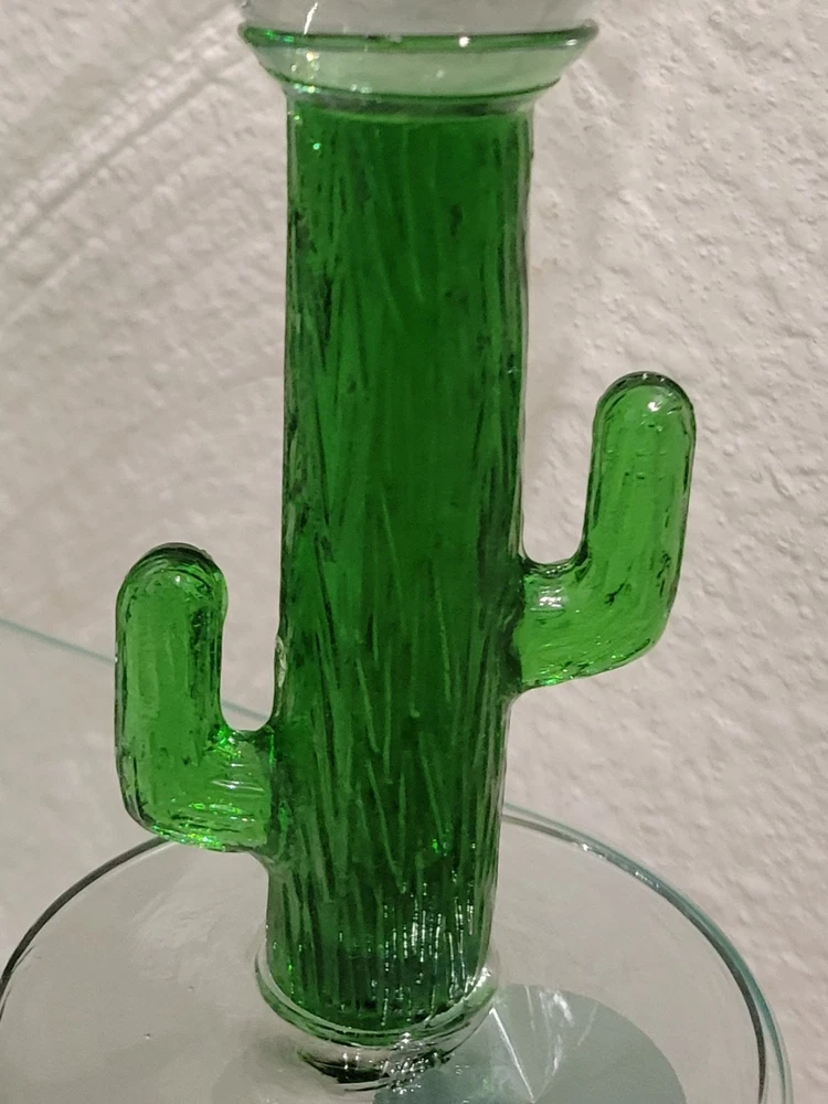 Cactus Saguaro Margarita Glasses – Set of 4 | Handcrafted in Mexico Serve your cocktails with southwestern charm using this Set of 4 Cactus Saguaro Margarita Glasses, handcrafted in Mexico. Each glass features a vibrant green cactus stem with a clear-to-smoke gradient bowl, blending rustic elegance with festive flair. Made from high-quality glass, these pieces are both durable and eye-catching—perfect for margaritas, specialty cocktails, or decorative use. Each glass measures approximately 7 inches tall with a 5-inch diameter, making them ideal for entertaining with style. The photos have been taken with and without flash to best capture the details.