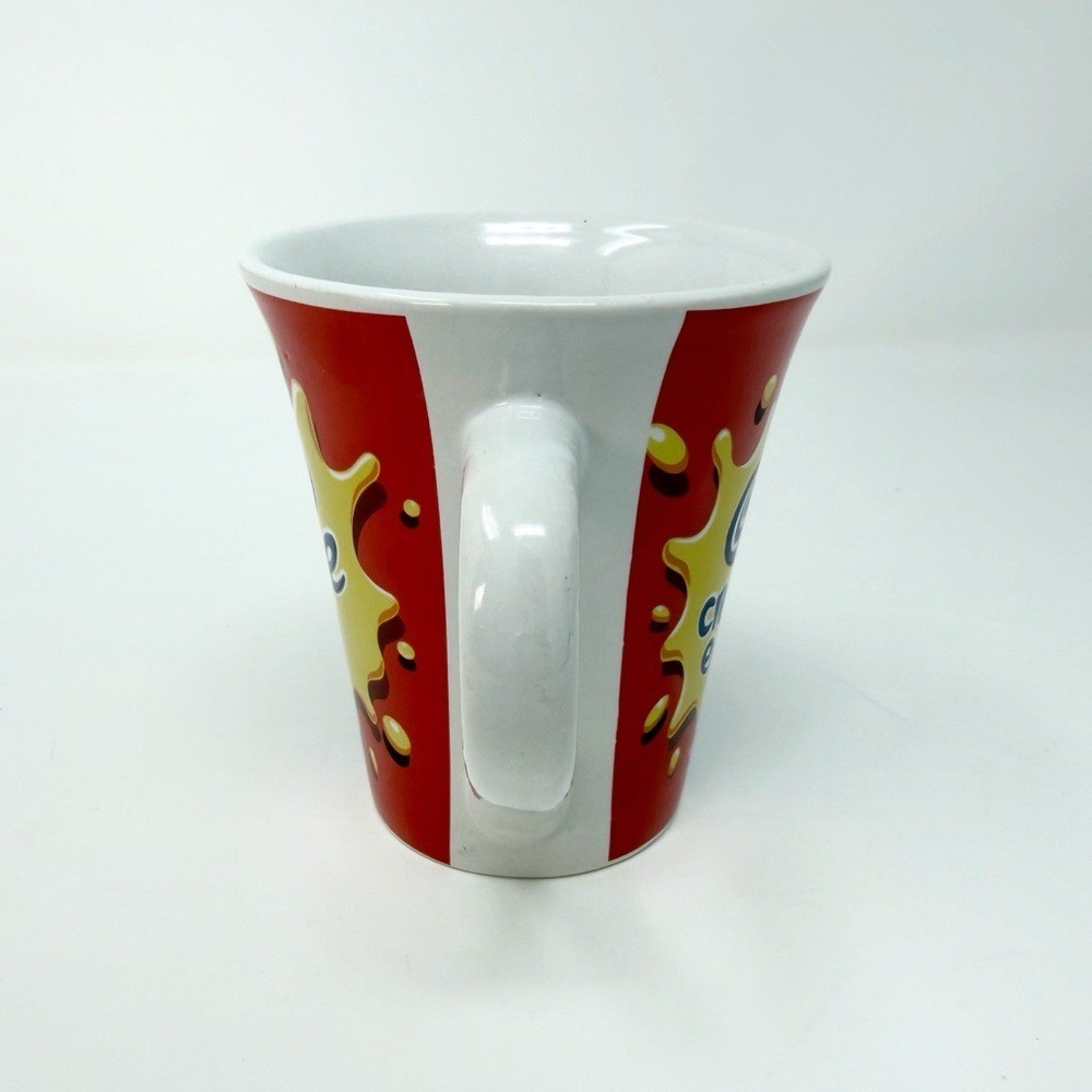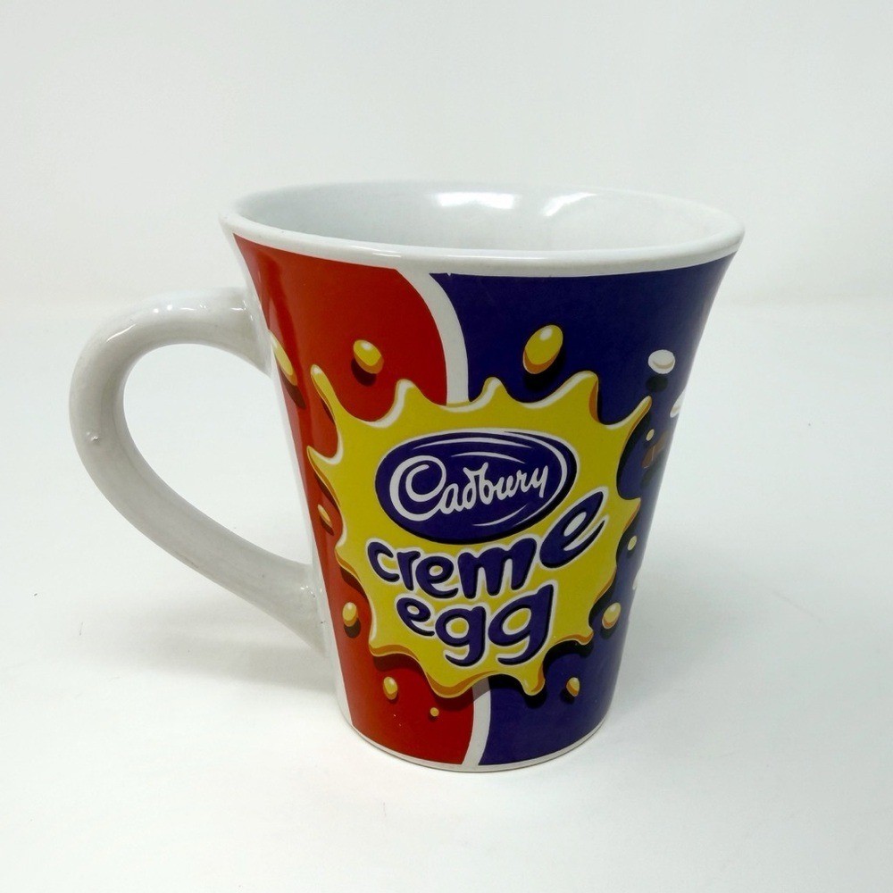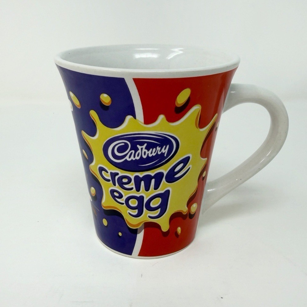 Cadbury Creme Egg ceramic coffee mug featuring the iconic yellow splash logo with bold red and blue color block design. Stands approximately 4 inches tall. A fun collectible piece perfect for Easter displays, chocolate lovers, or branded advertising mug collectors. Details: • Brand: Cadbury • Height: Approx. 4 inches • Material: Ceramic • Colors: Red, blue, yellow, white • Theme: Easter / chocolate / novelty Condition: Preowned in good condition. No major chips or cracks observed. Please review all photos for full cosmetic details. Bright, eye-catching design that pops in seasonal decor or a mug collection. I do my best to describe, measure, and photograph as accurately as possible. Colors of items may vary due to different devices. Item in the listing photos is the same item that will be received.