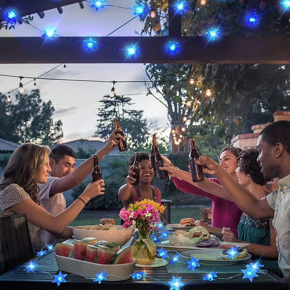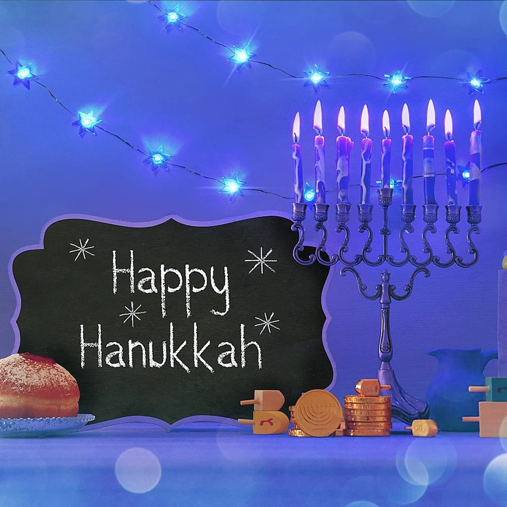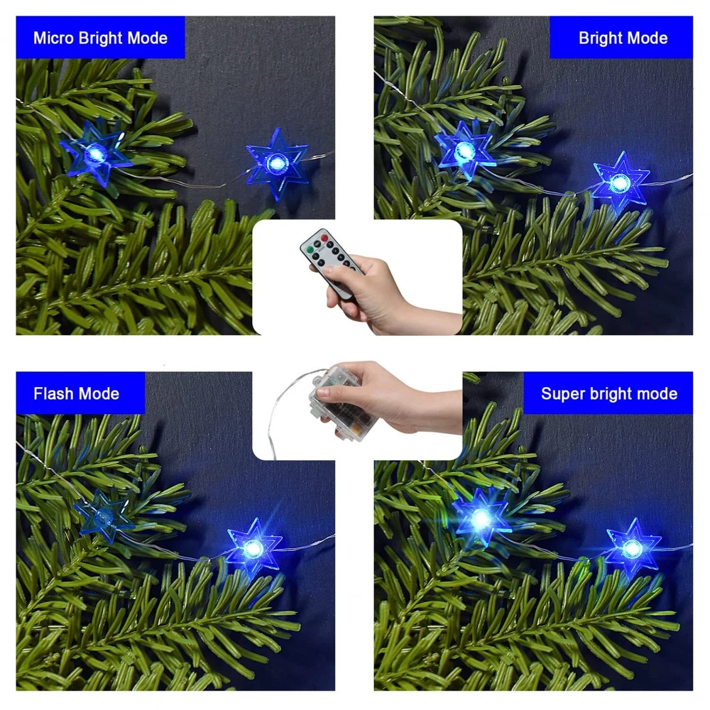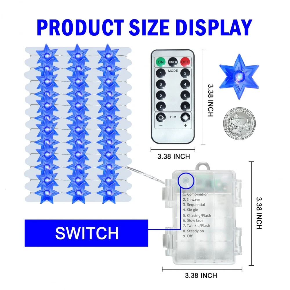 Rocinha Hanukkah Decorations Star of David Lights String, 10 ft 30 LEDs Judaical Style Chanukah Lights Decorations for Jewish Judaism, Decor Passover/Hashanah/Shabbat/Rosh Hashana (Blue) ★EASILY USE & 8 LIGHTING MODES FOR CHOICE: Each click the power button of the battery box turn to the lighting mode described on the surface of the battery box. You can also remote control turn to the lighting mode. 8 lighting modes for choice. ★SAFETY USE & HANUKKAH LIGHT DECOR: During the lighting, the copper wire will never go hot and be safe. The battery box needs 3 AA batteries for the power supply. Hanukkah light string will create a Jewish style in indoor or covered outdoor. ★GIVE YOU A UNIQUE ART FOR CHANUKAH DECORATIONS: The Jewish light string like the unique arts for using to decorate the space and let the place more and more wonderful! (Package no include AA batteries) ★ABOUT CHANUKAH LIGHT STRING: The Chanukah festival light consist of 9.7 ft silver-plated copper wire & 30 pcs 1.18''x 1.18'' LED hexagram. The copper wire is long-lasting & meets IP64 waterproof. (Battery box is not waterproof.) ★THE BEST HANUKKAH GIFT: It's the best gift for kids, friends, and families in Hanukkah, Passover, Hashanah, Shabbat. The Star of David string lights with winter snowflake elements makes its unique beauty. Shipping We offer FREE shipping on all orders! We ship within Three business days of payment, usually sooner. We use a selection of shipping services such as UPS, FedEx, USPS etc. We only ship to the lower 48 states, no APO/FPO addresses or PO Boxes allowed. Local pickups and combined shipping options are not provided at this time. Return You can return a product for up to 30 days from the date you purchased it. Any product you return must be in the same condition you received it and in the original packaging. Please keep the receipt. Payment We accept payment by any of the following methods: PayPal Please pay as soon as possible after winning an auction, as that will allow us to post your item to you sooner! Feedback Customer satisfaction is very important to us. If you have any problem with your order, please contact us and we will do our best to make you satisfied. Contact Us If you have any queries, please contact us via ebay. We usually respond within 24 hours on weekdays. Please visit our eBay store to check out other items for sale! Thank you for shopping at our store.