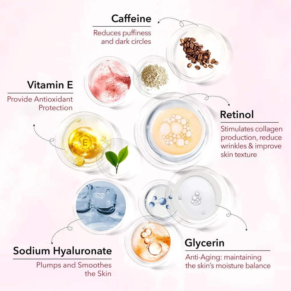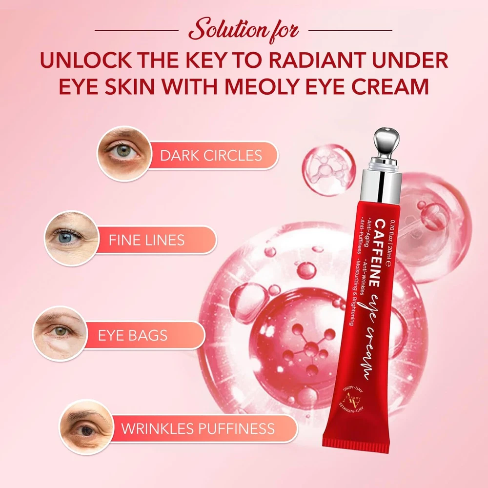 Caffeine Eye Cream for Anti Aging: Under eye cream for dark circles, Eye wrinkle, Anti Puffiness - Anti Aging Caffeine Eye cream For Under Eye Bags And Puffy Eyes 0.7 oz Product Details Brand: MEOLY Item Volume: 0.7 Fluid Ounces Item dimensions L x W x H: 5.3 x 1.1 x 0.8 inches Age Range (Description): Adult Special Feature: Water Resistant CAFFEINE EYE CREAM ANTI-AGING SOLUTION: MEOLY Caffeine eye cream specially formulated with strong anti-aging ingredients like Retinol, Caffeine, Sodium Hyaluronate, Vitamin E. It reduces dark circles, puffiness, wrinkles, fine lines, and sagging eyelids caused by lack of sleep. Use it twice a day, morning and night, for a more refreshed and youthful look. DARK CIRCLES, WRINKLES, FINE LINES TREATMENT: Hydrating and Nourishing, MEOLY eye cream is made with proven ingredients that prevent skin contraction, boost eye metabolism, and reduce inflammation. It moisturizes the skin around your eyes, smoothing out fine lines and wrinkles for long-lasting hydration. REPAIR, RESTORE & REPEAT: Our Retinol eye cream for anti aging has a silky, lightweight texture. It absorbs quickly and leaves your skin smooth without feeling greasy. You can easily layer it with other moisturizers and creams, repairing the skin under the eye making it perfect for dark circles under the eyes. RELAXING COOLING ROLLER: Our Anti Aging eye cream comes with a cooling roller for a soothing massage experience. Simply glide the roller over the eye area to help the cream absorb efficiently. Treat yourself or someone you love to this refreshing eye bag care for women. GENTLE SUITABLE FOR ALL SKIN: Our Caffeine eye cream for Anti Aging is suitable for all skin types, including sensitive skin. It is from safely selected materials, making it safe and gentle to use.
