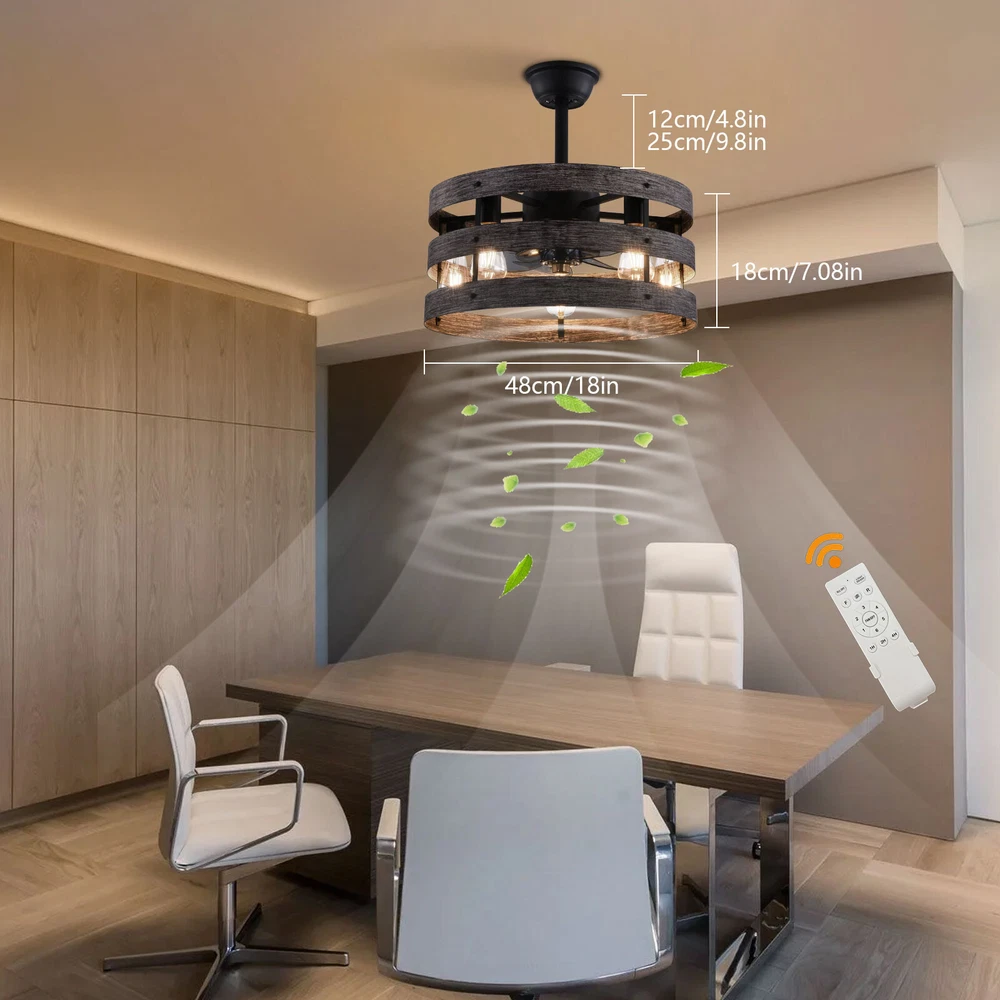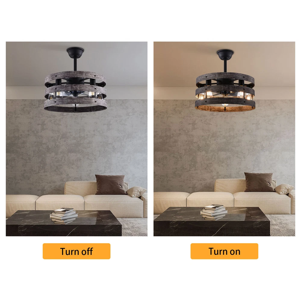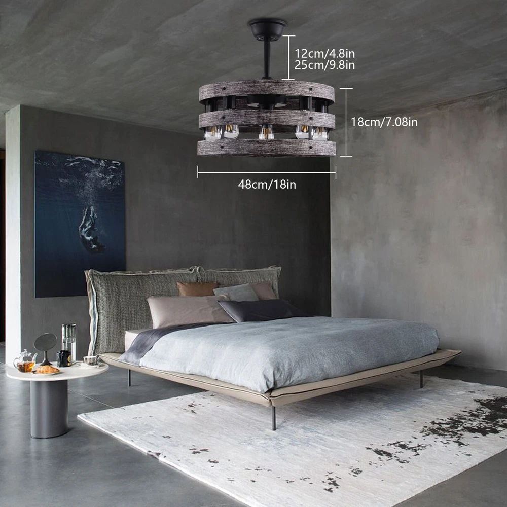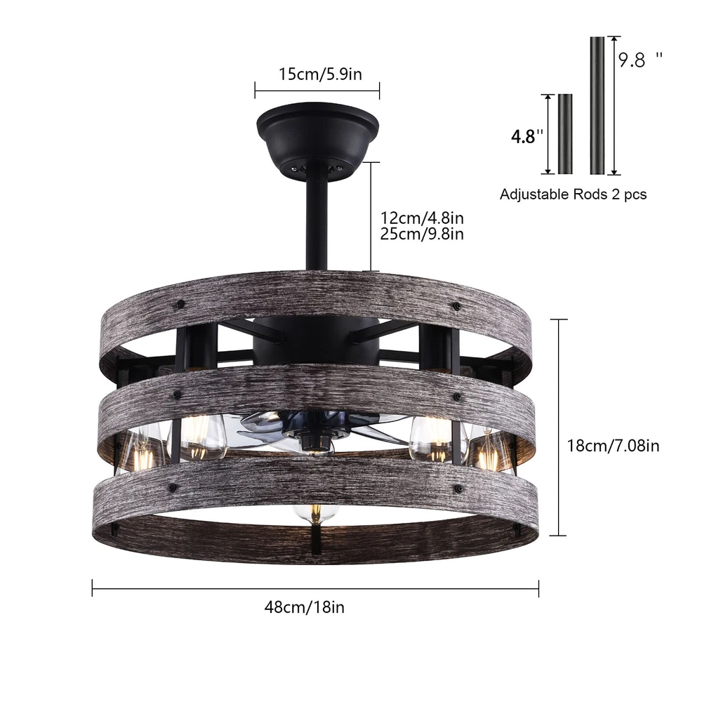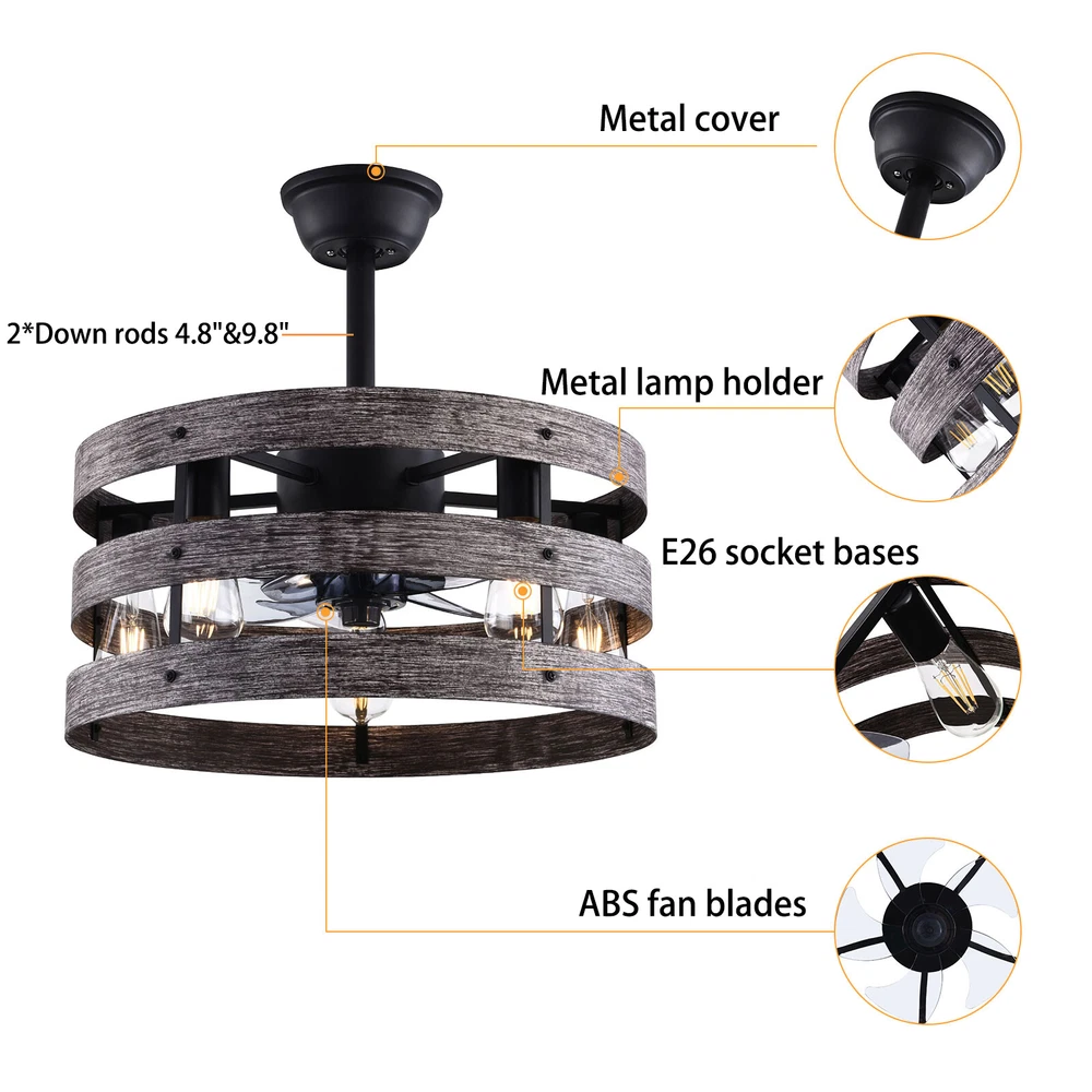 Specifications Color: Gray, Black Material: Metal, ABS Style: Modern Type: US Standard Shape: Round Surface Treatment: Baking Paint Electric Fan Design: Ceiling Fan Room Type: Bedroom, Living Room, Dining Room, Living Room, Kitchen Controller Type: Frequency Conversion Remote Control Motor Type: Pure Copper Assembly Required: Yes Mounting Type: Ceiling Mount Number of Fan Blades: 5 Number of Items: 1 Rated Voltage: 85-265V Max. Bulb Power(Each): 40W Power Source: DC Battery Type: 2*AA batteries(Included) Wind Speed Gears: 6 Timing: 1/2/4h Bulb Size: 5*E26 (Not Included) Suitable Area: 15-20㎡/161-215ft² Noise: About 35dB Base Diameter: 15cm/5.9inch Lampshade Size(L*H): 48*18cm/18*7.09inch Rod Height: 25cm/9.8inch, 12cm/4.8inch Caged Ceiling Fan with Light,Farmhouse Ceiling Fan with Remote Control,Rustic Description This 2-in-1 ceiling fan light allows you to feel the bright light and enjoy the coolness at the same time. It has six gears of wind speeds with a timing function to meet your daily usage needs, and y ou can also reverse the direction of the fan in winter. It can be integrated with different decoration styles and is ideal to create an excellent life and sleep environment to accompany you in all seasons. Specifications Color: Gray, Black Material: Metal, ABS Style: Modern Type: US Standard Shape: Round Surface Treatment: Baking Paint Electric Fan Design: Ceiling Fan Room Type: Bedroom, Living Room, Dining Room, Living Room, Kitchen Controller Type: Frequency Conversion Remote Control Motor Type: Pure Copper Assembly Required: Yes Mounting Type: Ceiling Mount Number of Fan Blades: 5 Number of Items: 1 Rated Voltage: 85-265V Max. Bulb Power(Each): 40W Power Source: DC Battery Type: 2*AA batteries(Included) Wind Speed Gears: 6 Timing: 1/2/4h Bulb Size: 5*E26 (Not Included) Suitable Area: 15-20㎡/161-215ft² Noise: About 35dB Base Diameter: 15cm/5.9inch Lampshade Size(L*H): 48*18cm/18*7.09inch Rod Height: 25cm/9.8inch, 12cm/4.8inch Key Features Stylish Appearance: Fashionable colors(black and gray)and delicate lines make it very stylish and can be a good decoration to blend in with different decor styles and add color to your room. Embrace Smart Life : Applied with remote control, you can easily adjust the wind speeds and timer while lying in bed and don't need to get up and press the switch, bringing more convenience to your life. Healthy and Energy-saving: The ceiling fan light provides more comprehensive air circulation and cooling, thereby reducing the frequency and time of air conditioning use, saving energy, and reducing expenses. It can avoid direct blowing and reduce the risk of air conditioning diseases. Build to last : The lampshade is made of high-quality metal and adopts a paint baking process , which is heat-resistant, strong, durable, and not easy to deform. The fan blades are made of ABS, which has high strength, good toughness, and good formability, which can ensure a smooth surface and good gloss. Multiple Functions: Integrating lighting and fans, illuminating the space while balancing room temperature, has become a new choice for home fashion! You can also reverse the direction of the fan in winter, blowing hot air from the top into the room and increasing the indoor temperature. High Safety: Five ABS blades are hidden in a semi-enclosed lampshade, which can allow for unobstructed lighting and air supply to avoid accidents caused by getting caught in the blades, making it much safer than traditional fans. Adjustable Speed&Working Time: It has 6 gears of wind speed and you can choose low speed to enjoy the comfortable breeze or high speed to cool down quickly. Meanwhile, You can control its working hours in advance (1/2/4 hour), so you don't have to worry about catching a cold or wasting electricity. Wide Application: T he equipped two rods(4.8", 9.8") make it suitable for a variety of ceiling heights while ensuring better lighting and air circulation effect. And it supports a wide voltage, which can adapt to different voltage environments. Easy to Clean : The smooth and flat shell, as well as the detachable fan blades, make this product easy to clean. You only need to clean it with a dry cloth, saving you lots of time and effort. Guaranteed Customer Service: We aim to provide quality products and services. If you have problems, please feel free to contact us. We will reply and solve the problem for you as soon as possible. Details Upgraded Blades: The fan blades adopt an aerodynamic design, providing a stable and powerful air supply with low noise. Solid Base: The thickened and enlarged base( 5.9inch )will bring stronger load-bearing capacity and stability. Pure Copper Motor: It has stable performance, low-temperature rise, and low noise(About 35dB), providing a quiet working and sleeping environment. Meanwhile, there are a lot of heat dissipation holes on the motor shell, which can provide a good heat dissipation effect to ensure the stable operation and long service life of the motor. E26 Lamp Holders: This product uses the standard E26 lamp base to facilitate the installation of various bulbs. Application It is suitable for the living room, dining room, kitchen, study bedroom, small bedroom, conference room, and other places of 15-20㎡/161-215ft². Package Included 1* Ceiling Fan Light 1* English Manual 1* Remote Control 2* AA Batteries All Accessories for Assembly Notes Please cut off the power supply when cleaning. This product does not include a light bulb. Please prepare four E26 bulbs in advance. Please read the manual completely before installation and use, and pay particular attention to the safety instructions included. Please allow the slight color difference caused by the shooting light and 1-3cm error due to manual measurement, and make sure you do not mind before you order. Payment Delivery details Terms of sales About us Contact us Payment We accept ebay payment 。 Fees such as import duties, taxes are not included in the item price or shipping