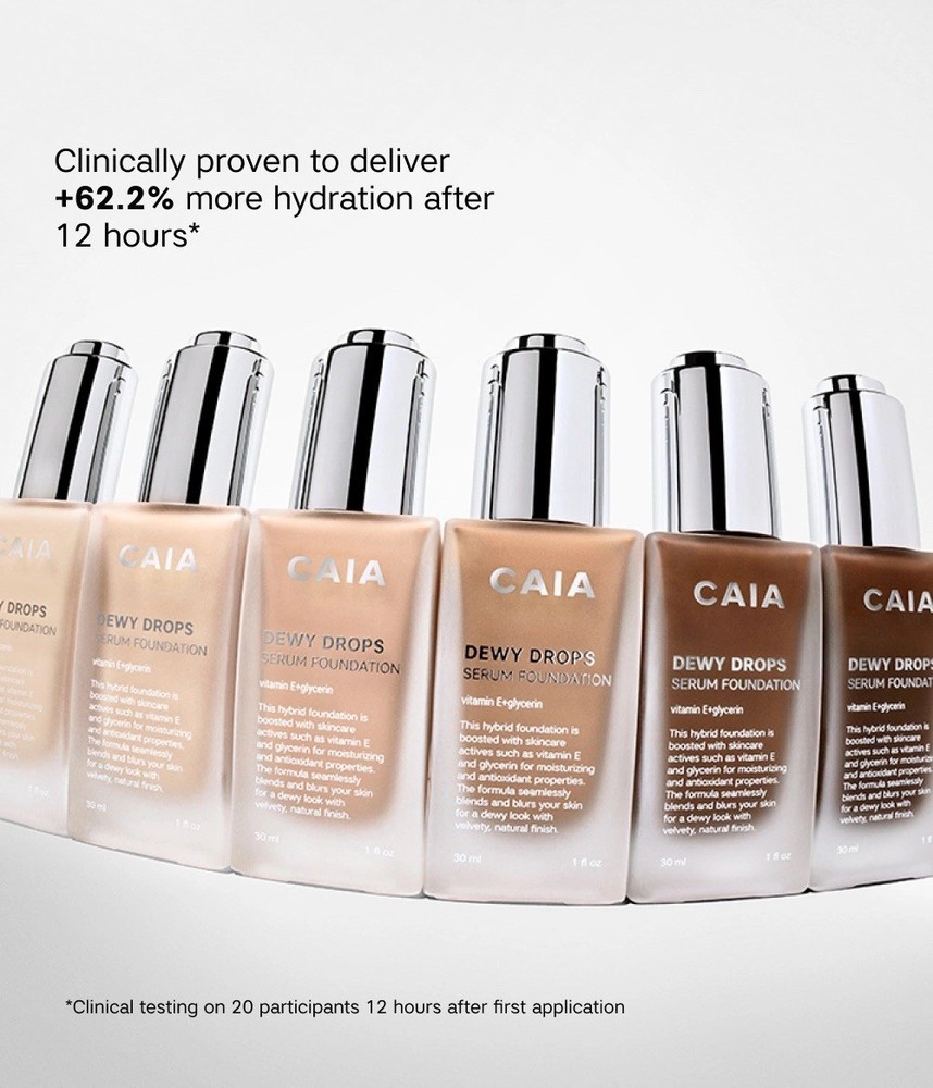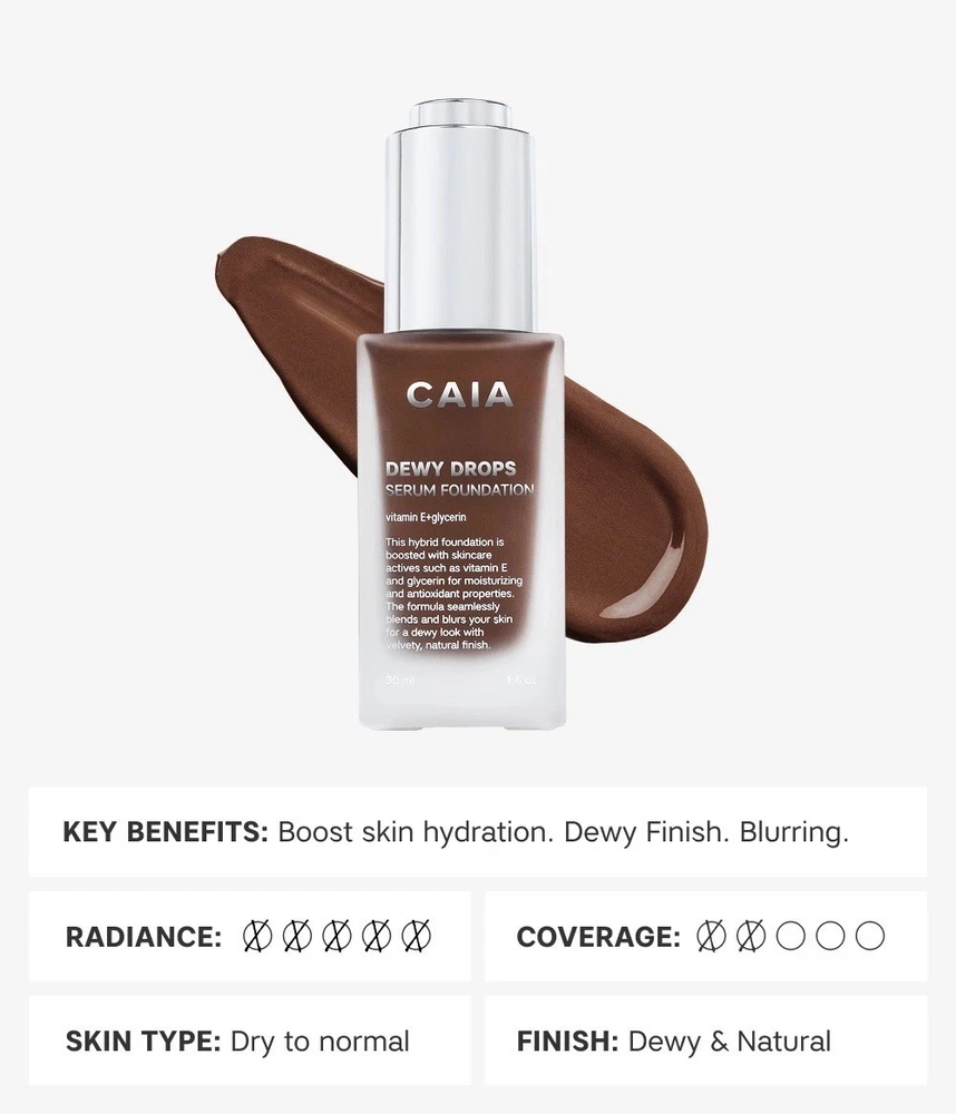 Caia Dewy Drops Serum Foundation 60C. With the qualities of a serum and the beauty of foundation, Dewy Drops provides a natural, second-skin look with light to medium coverage. This weightless serum foundation evens out skin tone while providing a blurry, dewy finish. The glycerin and vitamin E-boosted formula is proven to leave your skin smooth, hydrated and nourished – lasting long after you rinse it off.