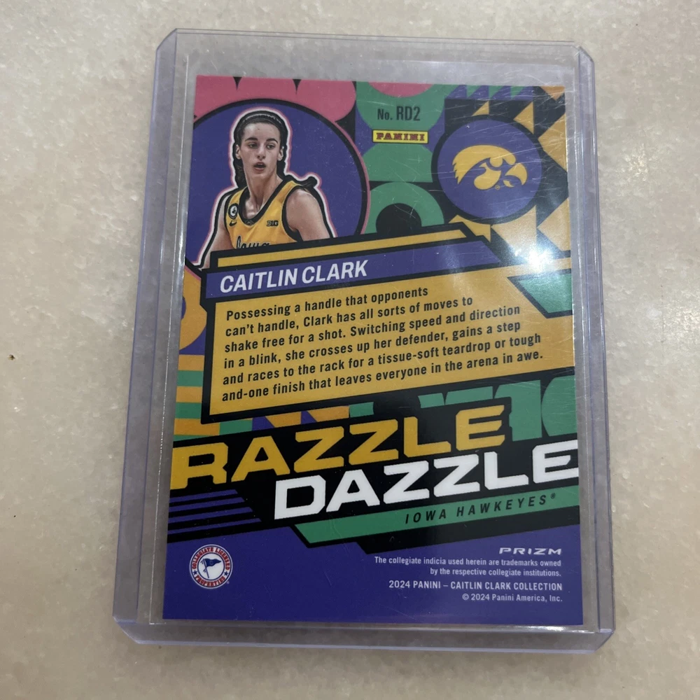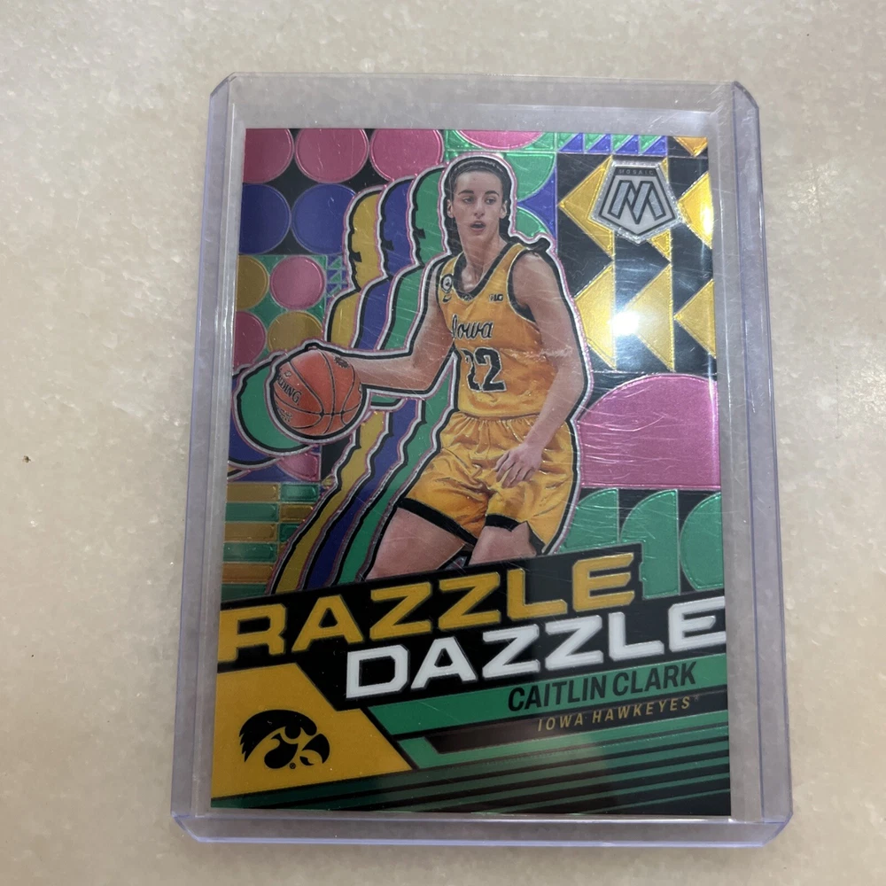 This is a rare and highly sought-after sports trading card featuring Caitlin Clark, a talented basketball player from the Iowa Hawkeyes team. The card is part of the 2024 Panini Collection and has a unique Mosaic Prizm design with a Razzle Dazzle #RD2 card number. It is a great addition to any collection and perfect for fans of the NCAA and sports trading cards. The card is authenticated by Donruss and is in excellent shape, near mint or better. It is a rookie insert card and comes from the 2024 season.