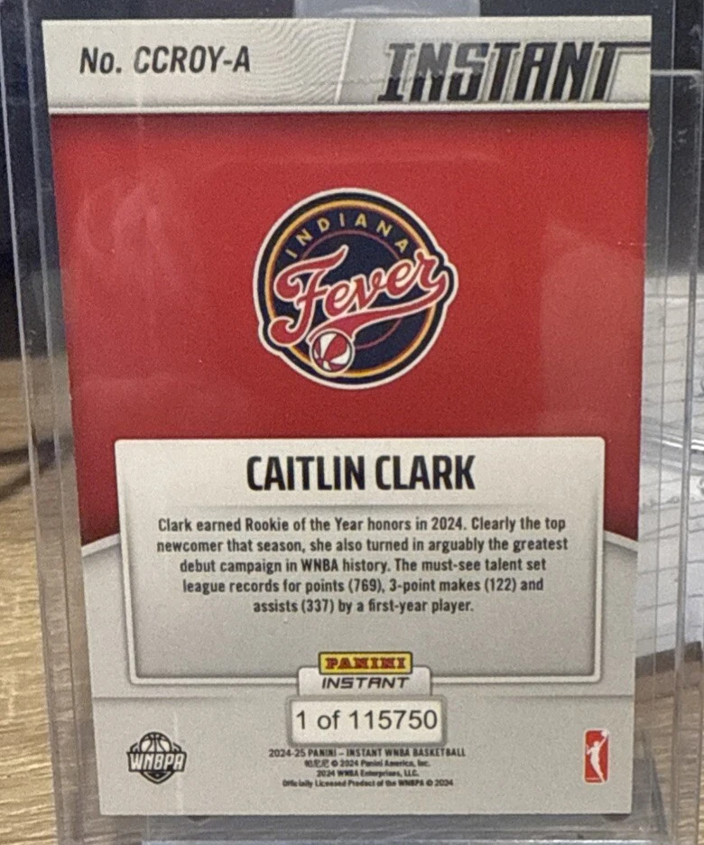 This rare and highly sought-after trading card features the talented Caitlin Clark, who is expected to be the top pick in the 2024 WNBA draft. The card is part of the 2024 Panini Instant set and has a print run of only 115750, making it a true collector's item. The card showcases Clark in her Indiana Fever and Iowa Hawkeyes uniforms and is labeled as a "Short Print" and "Rookie" feature. It is a standard size sports trading card and is perfect for any fan of basketball or sports memorabilia. Don't miss your chance to add this unique piece to your collection!