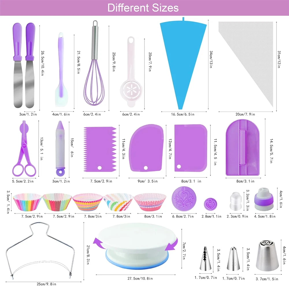 Cake Decorating Supplies Kit Tools 356Pcs, Baking Accessories with Cake Turntable, Pastry Piping Bag, Piping Icing Tips for Beginners đ°ăCake Decorating Kit 356pcsăOur cake set includes cake turntable, pastry piping bag, piping pcing tips, couplers, fondant molds, cupcake liners, cake toppers, cake leveler, spatula, scraper, E-Book and more. Share the frosting flower fun with friends & family. đ§ăPattern Chart and E-BookăOur set having numbered piping tips with pattern chart and E-Book. Comes with a colorful tip chart And ebook showing the basic decorating patterns of each icing tip and related cake design ideas, no matter what your skill level may be. No decorating experience needed! đăFood-grade Safe MaterialsăAll accessories meet food-grade standards, made of high quality 304 Stainless Steel, plastic and silicone. Sturdy and safe for family cake making. Dishwasher Safety. đ©ăRevolving Cake TurntableăThis cake turntable stand revolve smoothly with hidden ball bearings and helps you easily decorate cakes for birthdays, weddings and other events. It revolves clock & anti clock wise, good for both Right & Left handers. âïžăCustomer Satisfaction GuaranteeăEvery part of a kit is well packed and good quality, you can easily purchase this as a birthday, Wedding, Mother Day, Christmas, Easter gift to your friends and family. Your satisfaction is what drives us to provide the highest quality products. If at any time you are not completely satisfied with your purchase, please contact us and we will give you a replacement item or refund within 24h. Product description Thinking of baking a cake in your own kitchen and that too yourself? It has professional icing tips, turntable, spatulas, scraper, icing bags, levelers and much more you need to bake the cake right away. The top-notch quality and easy-to-use supplies are equally workable for beginners. The Spatula needs support when it comes to carving perfect cake designs. Therefore, the cake scrapers help to pull over the smooth design over the edges. Once your sponge is on the turntable and youâre done with icing via Spatula, the premium plastic-built Cake scraper is your next decoration tool to get the much-needed perfection on your side. The Cupcake liners help you bake the cupcake without worrying anymore. Just put in the mixer in cupcake liners and bake them to get the perfect cupcake for your loved ones. TURN IT, EITHER WAY, TO DECORATE IT ANYWAY WITH CAKE TURNTABLE The hidden ball bearings make you revolve your cake 360 seamlessly so you move it with ease while decorating. Equally handy for both the right and left-handers, the non-skid silicone ring at the bottom makes it non-slippery all the time when you indulge deep in the decorating process. The lightweight and efficient design allows holding it for hours and icing your cake evenly throughout. The firm grip and angled blades help you creaming it on the edges with just simply moving turntable around to reach out to everywhere. The flexible stainless-steel quality works smoothly on the edge with giving you a perfect cake at the end of the day. Furthermore, it can also be used for cutting pizzas cakes and such stuff without asking for you to use your hands, which otherwise makes it all messy around. 10.8 inches x 10.83 inches x 5.51 inches. Weight: 1.36 lb Item model number 630d15d3-0d35-44c3-90ce-cc842ccd3169 Color Purple Product Dimensions 10.83 x 10.8 x 5.51 inches Material Stainless Steel Item Weight 1.36 pounds Opening Shape Ball Is Discontinued By Manufacturer No Number of Pieces 1