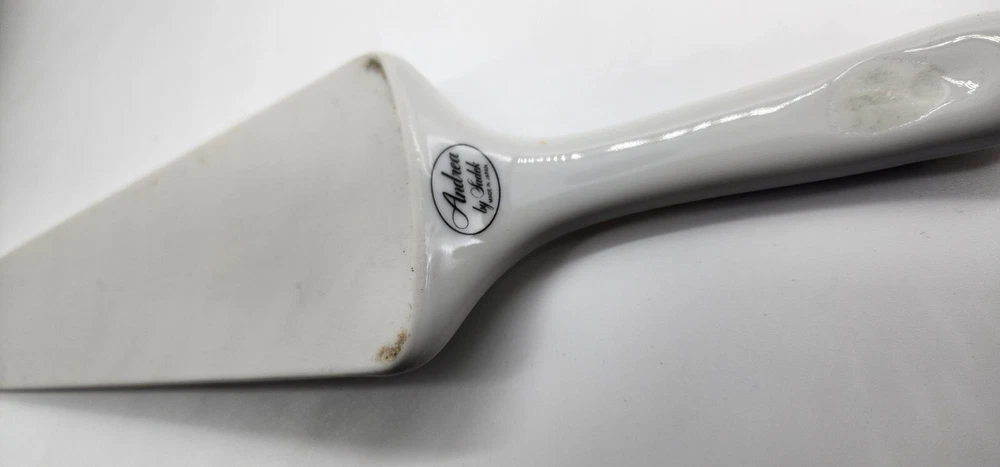 This cake pedestal and server is in great condition with no chips or cracks that can be seen. I is 3 1/4" tall and 10 1/2" in diameter. The server is 10" long.