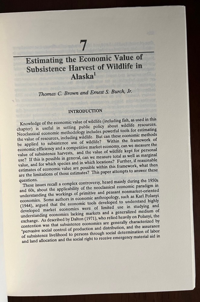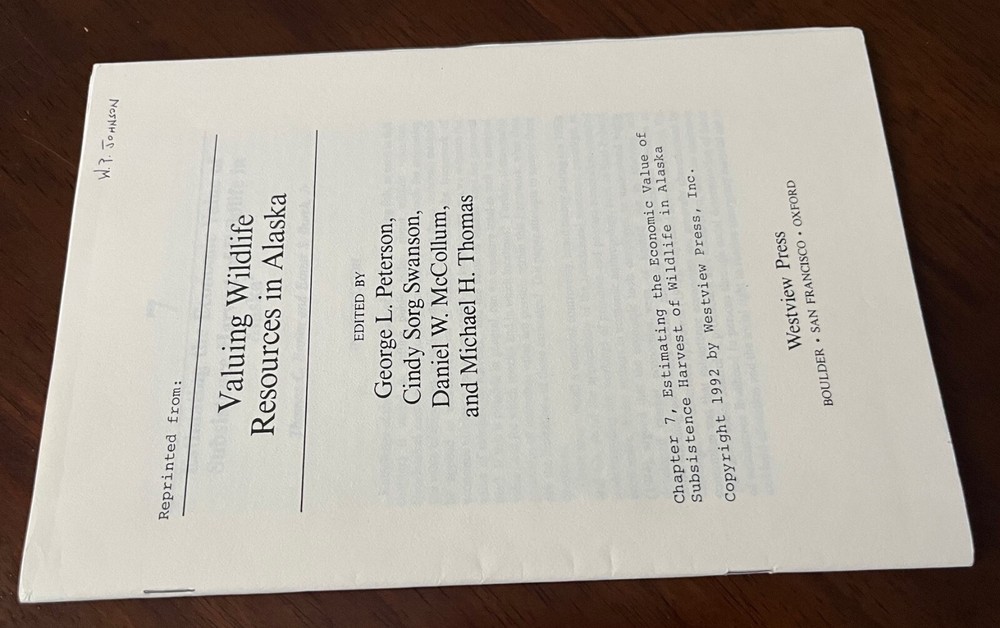 Reprint of Chapter 7: "Estimating the economic value of subsistence harvest of wildlife in Alaska" by T.C. Brown and E.S. Burch, Jr. Pages 204-254 from 'Valuing Wildlife Resources in Alaska,' Edited by G. L. Peterson and others. Published by Westview Press. 1992. Paperback, Staple Bound The reprint has a name printed on the front cover.