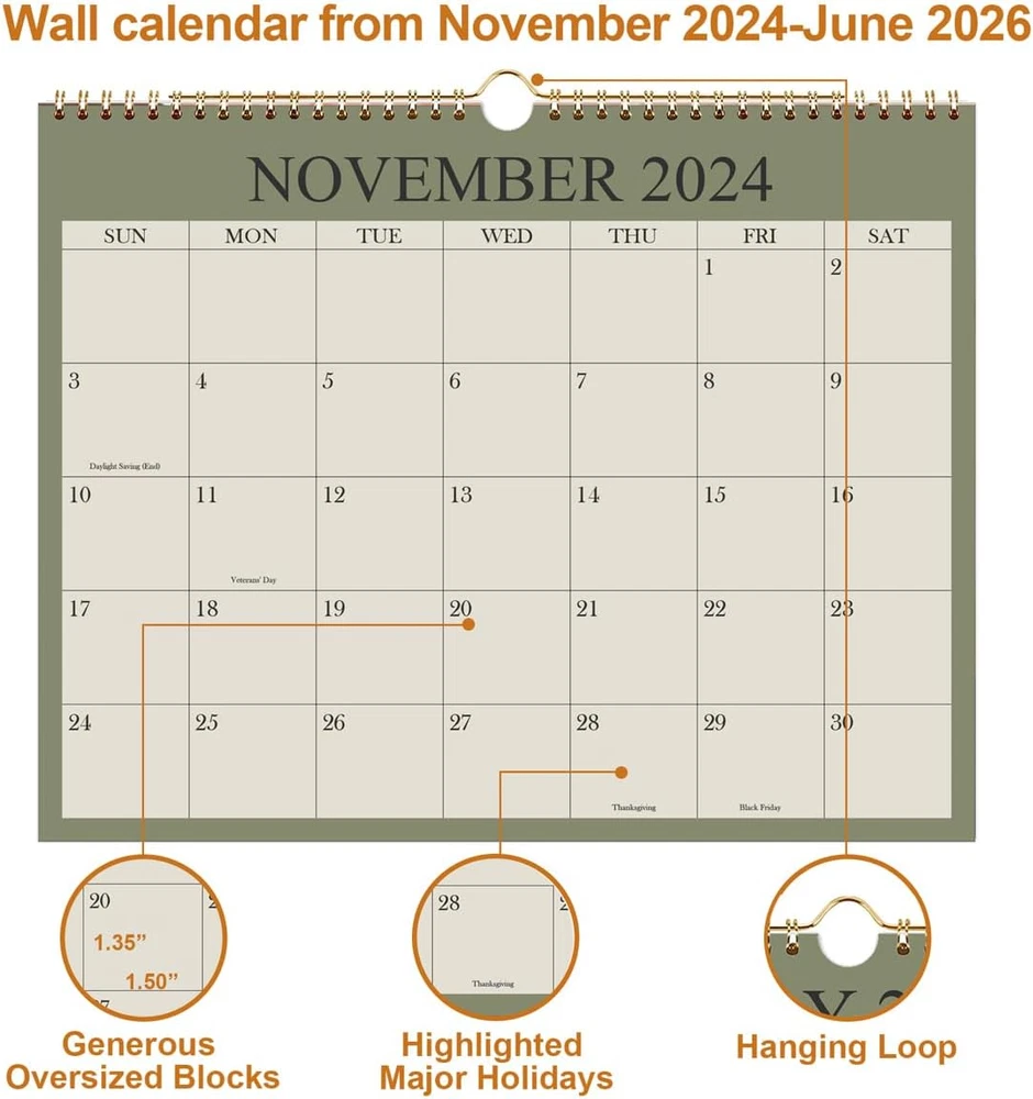 Calendar 2024-2025, Wall Calendar from November 2024 - June 2026, 20 Months Cale