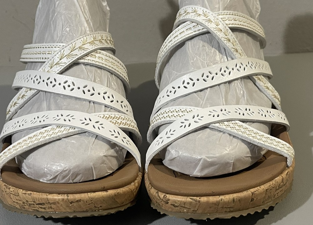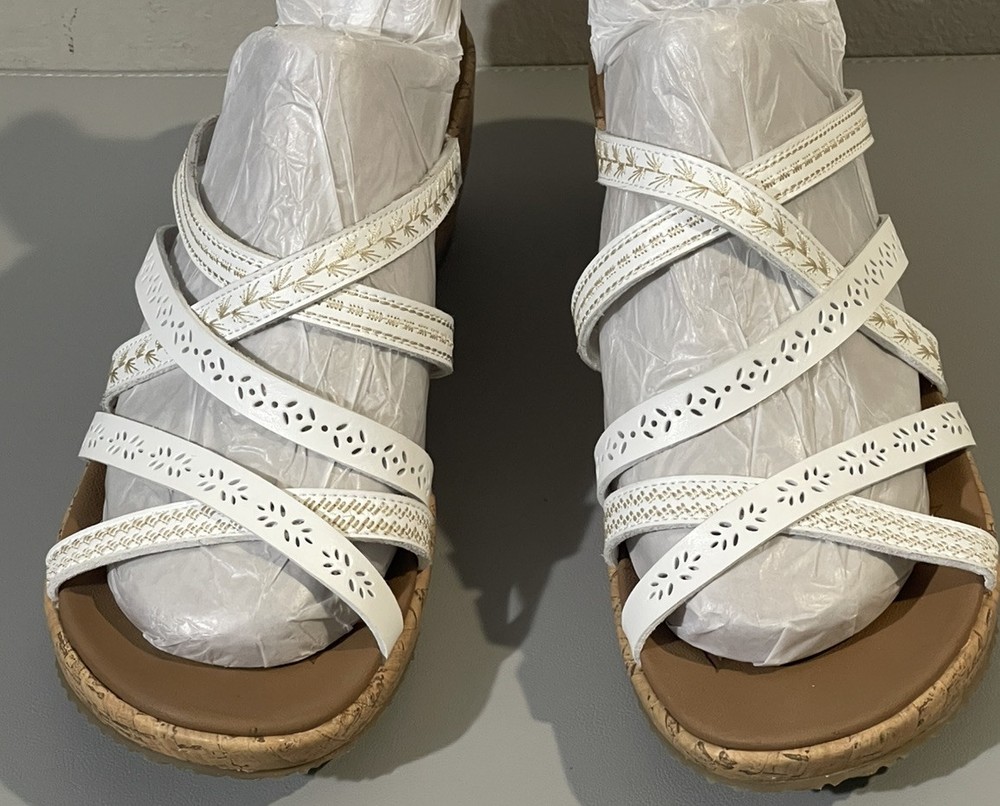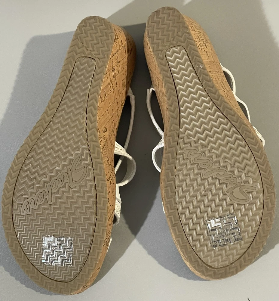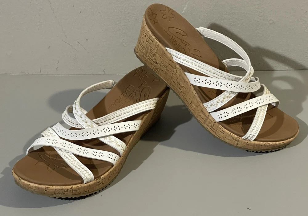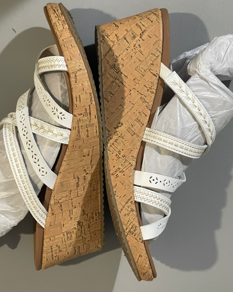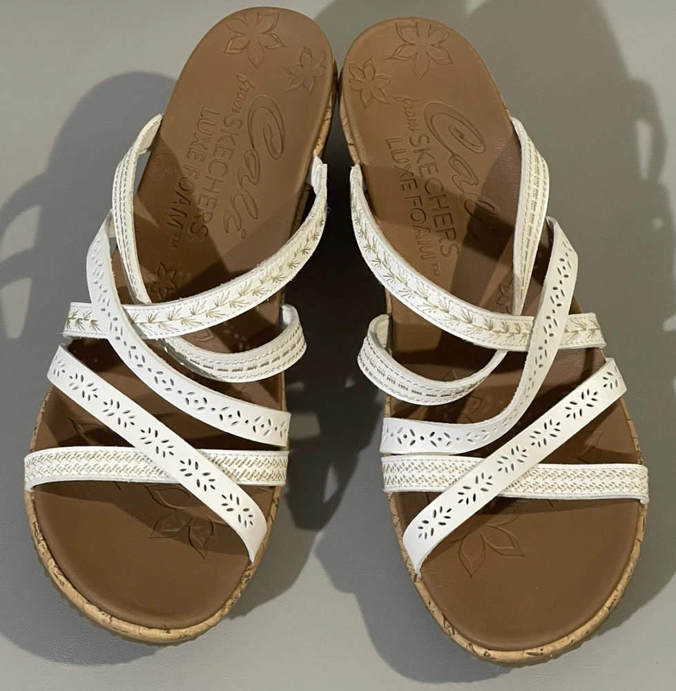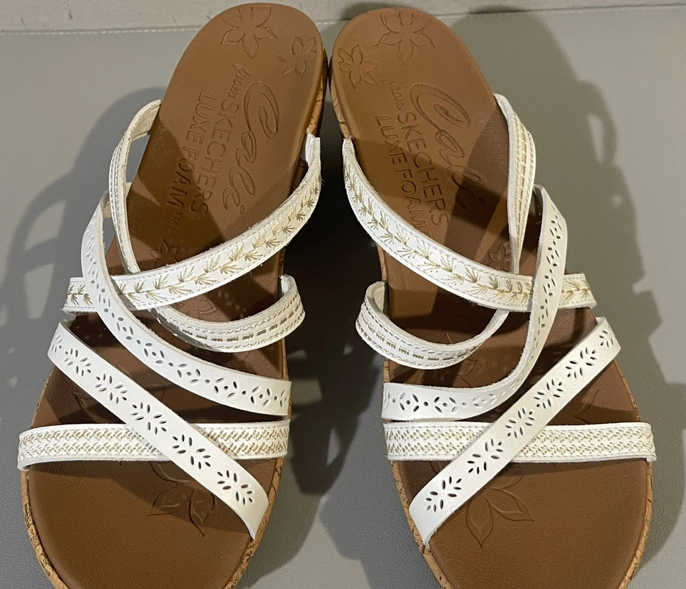 The Cali Skechers Women's White Luxe Foam Wedge Heels Strappy Slip On Sandals in size 11 are a stylish and comfortable choice for various occasions like travel, weddings, casual outings, workwear, and business settings. These sandals feature a solid white color with a strappy design, mid-height wedge heel, leather lining and upper material, and a foam insole for added comfort. The slip-on style and non-slip outsole make them convenient and practical for summer, fall, and spring seasons. The Skechers brand logo adds a touch of branding to these versatile sandals.