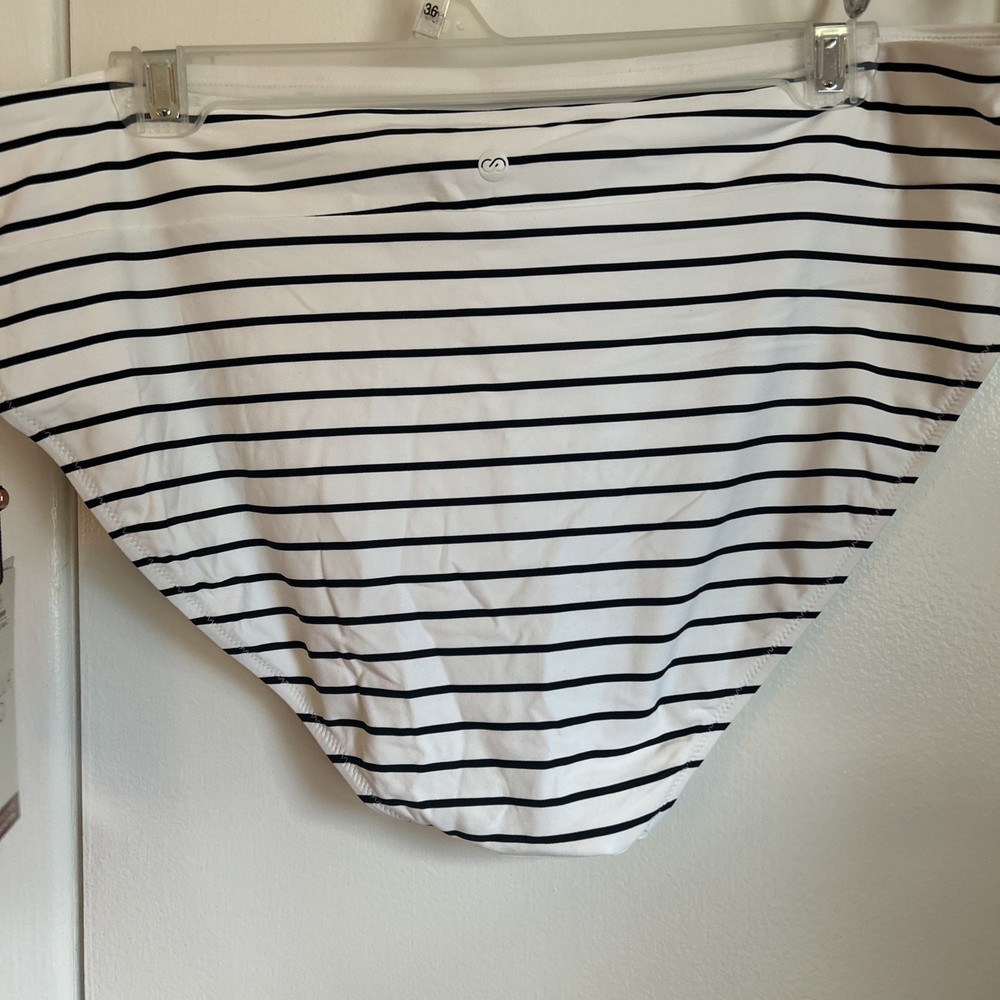 The Calia by Carrie Underwood Women's Swim Bottom XL is a stylish and comfortable bikini bottom in a classic white color with striped pattern. Made of a blend of nylon and spandex, this strapless bottom is designed for hand wash only to maintain its quality. Perfect for a day at the beach, this Calia swim bottom in XL size is a perfect addition to any woman's swimwear collection, offering a blend of style and functionality for a fun and flattering look.