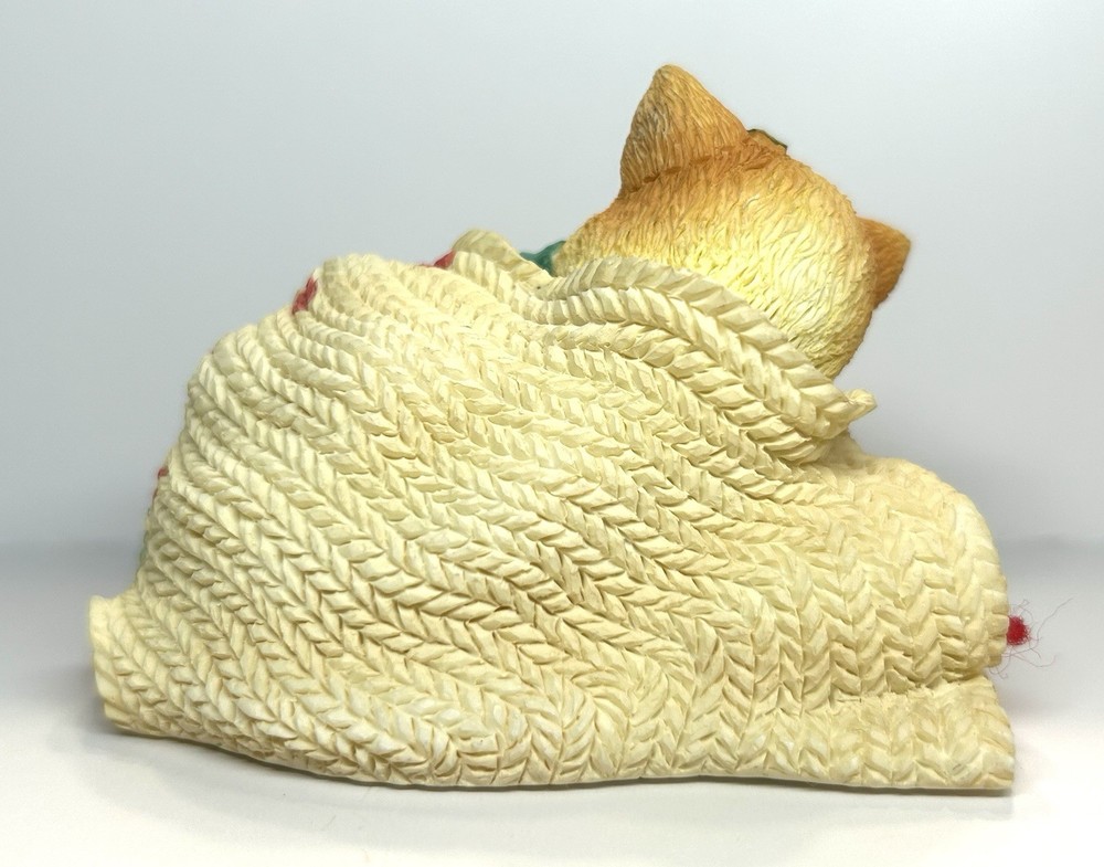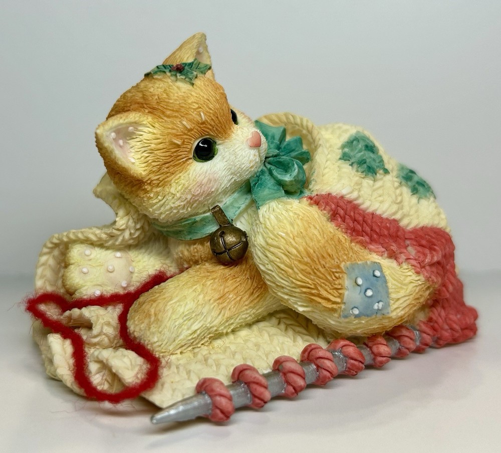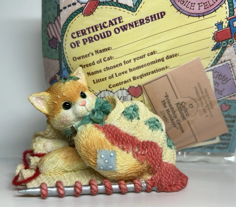 Embrace the warmth of the holiday spirit with the "Friendship Covers The Holidays" figurine from the beloved Calico Kittens collection. Crafted by Enesco and artist Priscilla Hillman, this charming piece features a cozy kitten wrapped in a scarf, exuding a sense of seasonal joy and companionship. This collectible, a representation of friendship and the festive season, is made from resin and comes in its original box and styrofoam packaging, making it a perfect piece for your collection or as a thoughtful gift. With its retirement status, this 1997 figurine becomes a unique treasure for collectors and cat enthusiasts alike, embodying the timeless theme of the collection.
